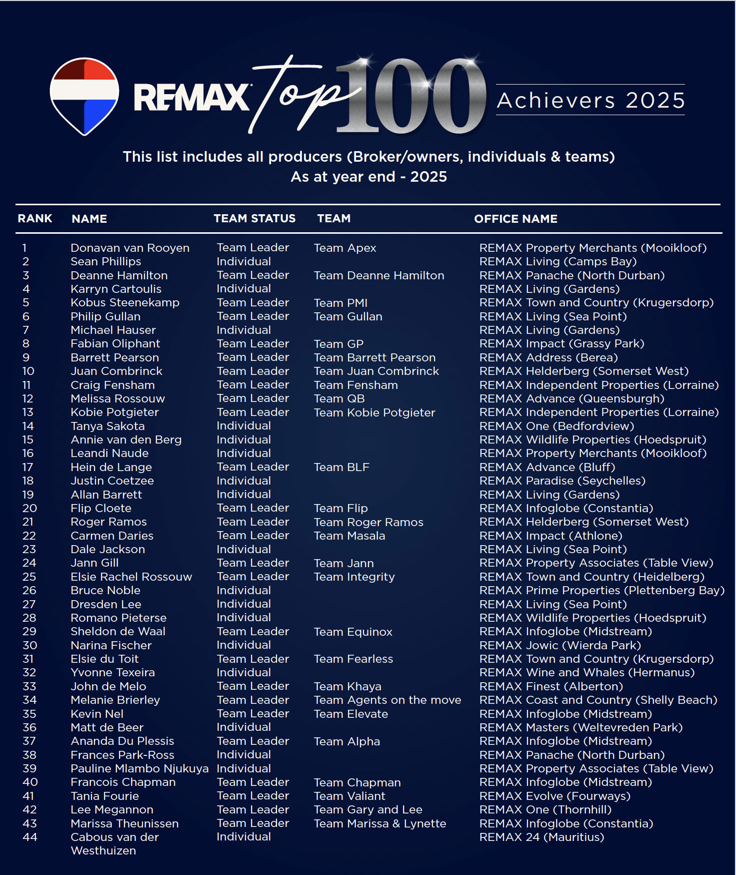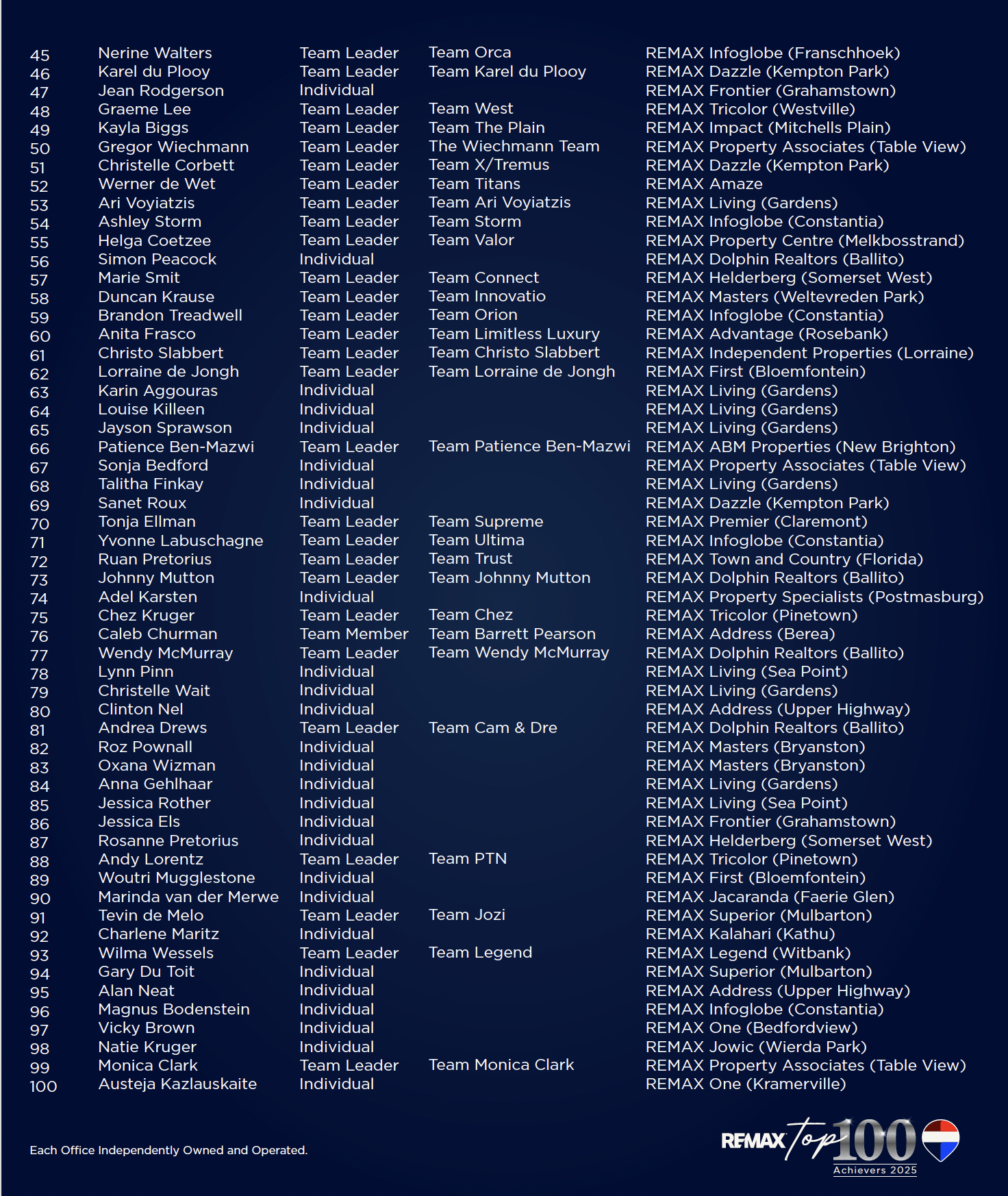 Below is the full list of REMAX Southern Africa’s Top 100 performers for 2025.