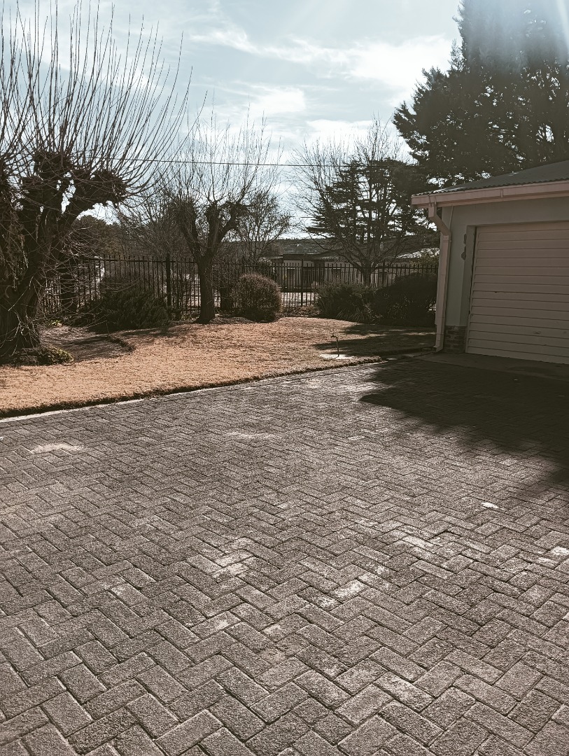 The property comprises four well-proportioned bedrooms and 2.5 bathrooms, accommodating family needs. Outside, the expansive erf offers significant potential for landscaping, currently featuring mature trees and an area ready for a vibrant garden transformation. A paved driveway, laid in a herringbone pattern, leads to a double garage, providing secure parking for two vehicles and additional open parking for two more, totaling four parking spaces.
