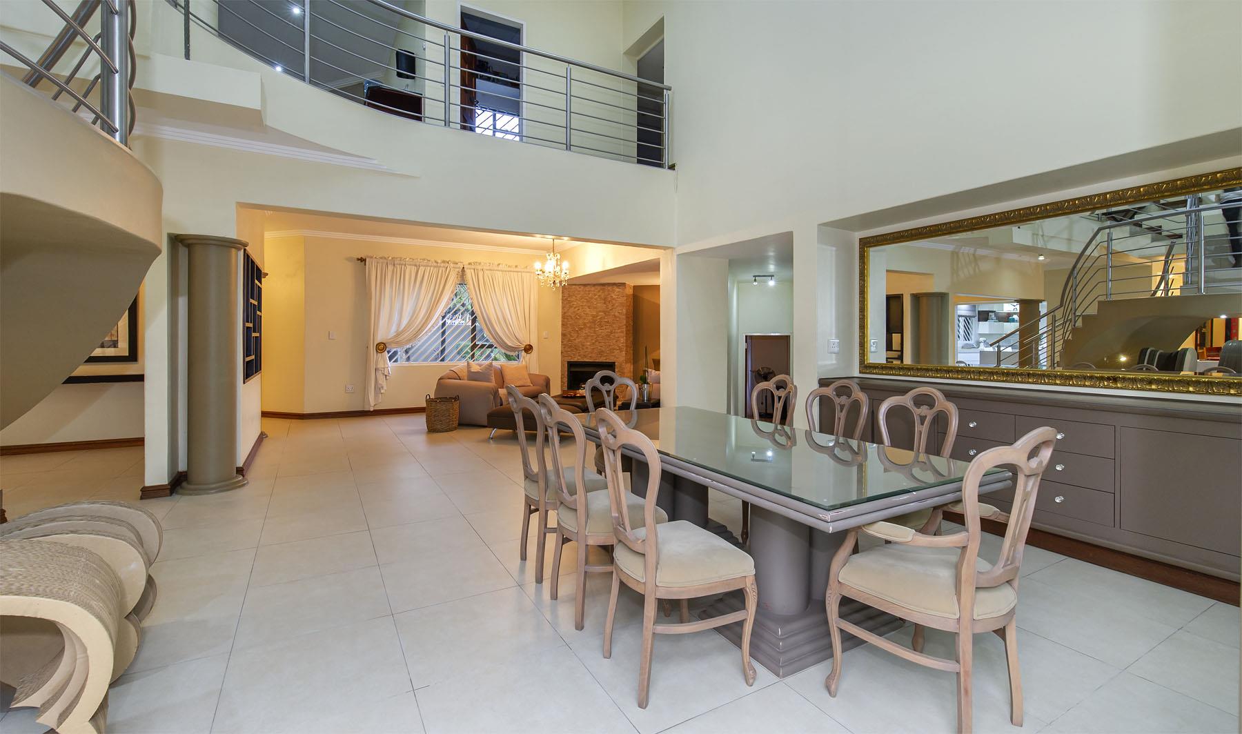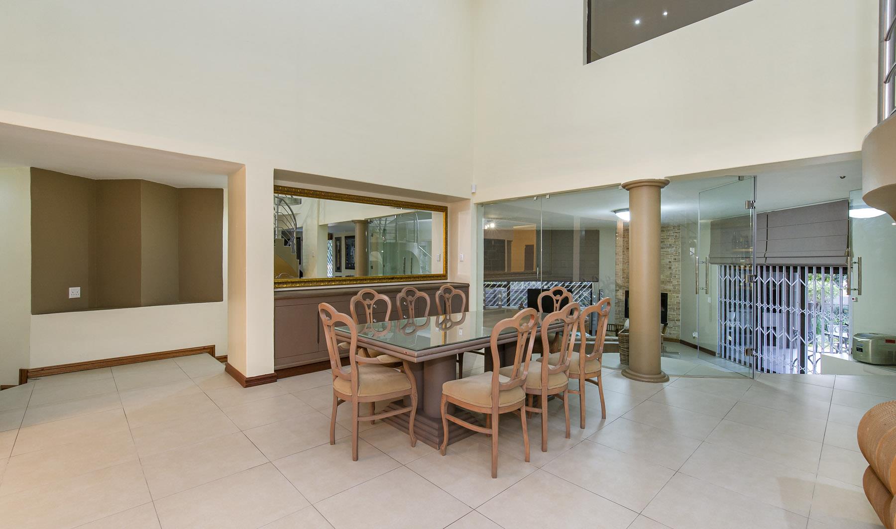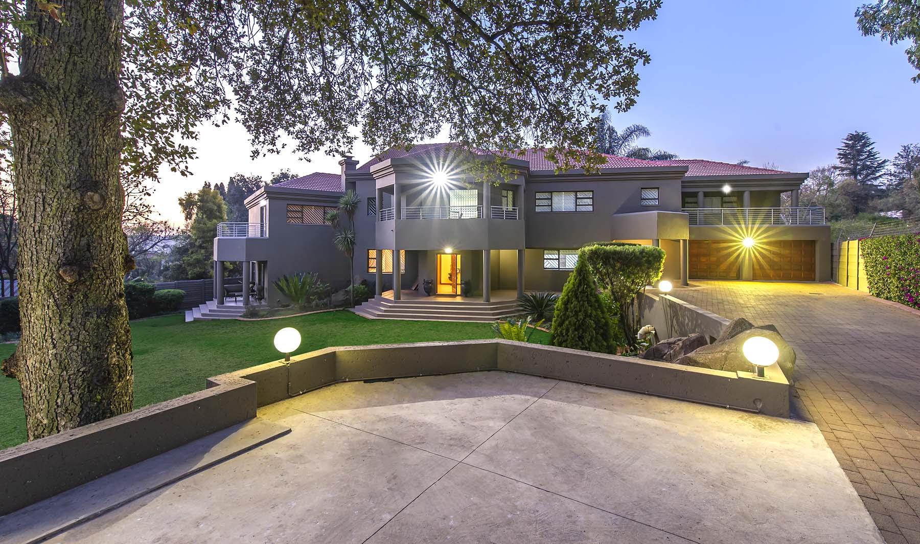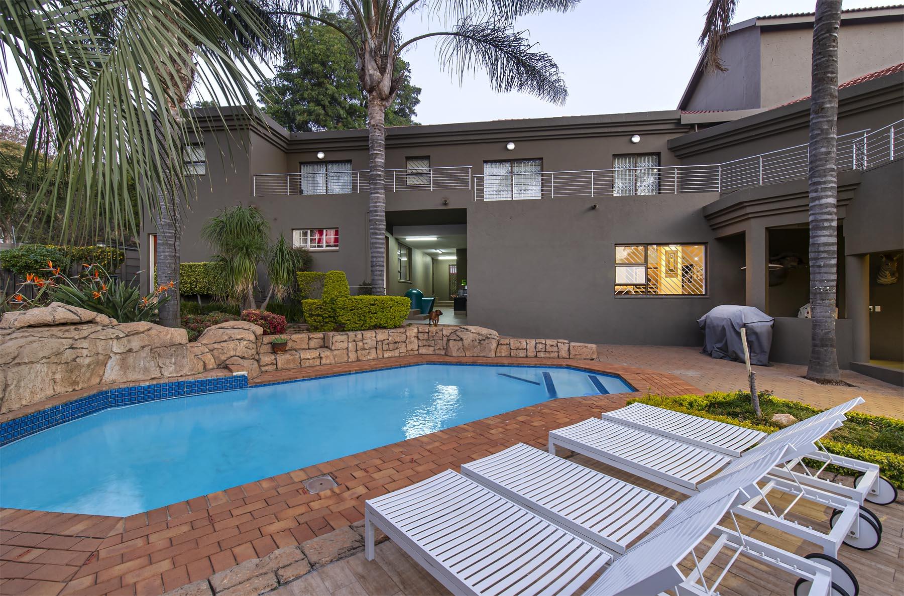 Double Storey 6 bedroomed Bedfordview Mansion set against the slopes of a 24/7 boomed road. This elaborate home has been newly refurbished recently with a an imposing entrance hall, a brand new Continental sized modern white high gloss kitchen with Gas Smeg appliances and Caesarstone counter tops and separate scullery and outside laundry. The double volume formal dining room is adjacent to a Billiard room and walk-in room ideal as a wine cellar. The glass encased sunken family lounge with fitted units and fireplace. A large entertainers' covered patio with built-in braai leads from the family room and overlooks a manicured garden with sparkling salt chlorinated and heated pool.