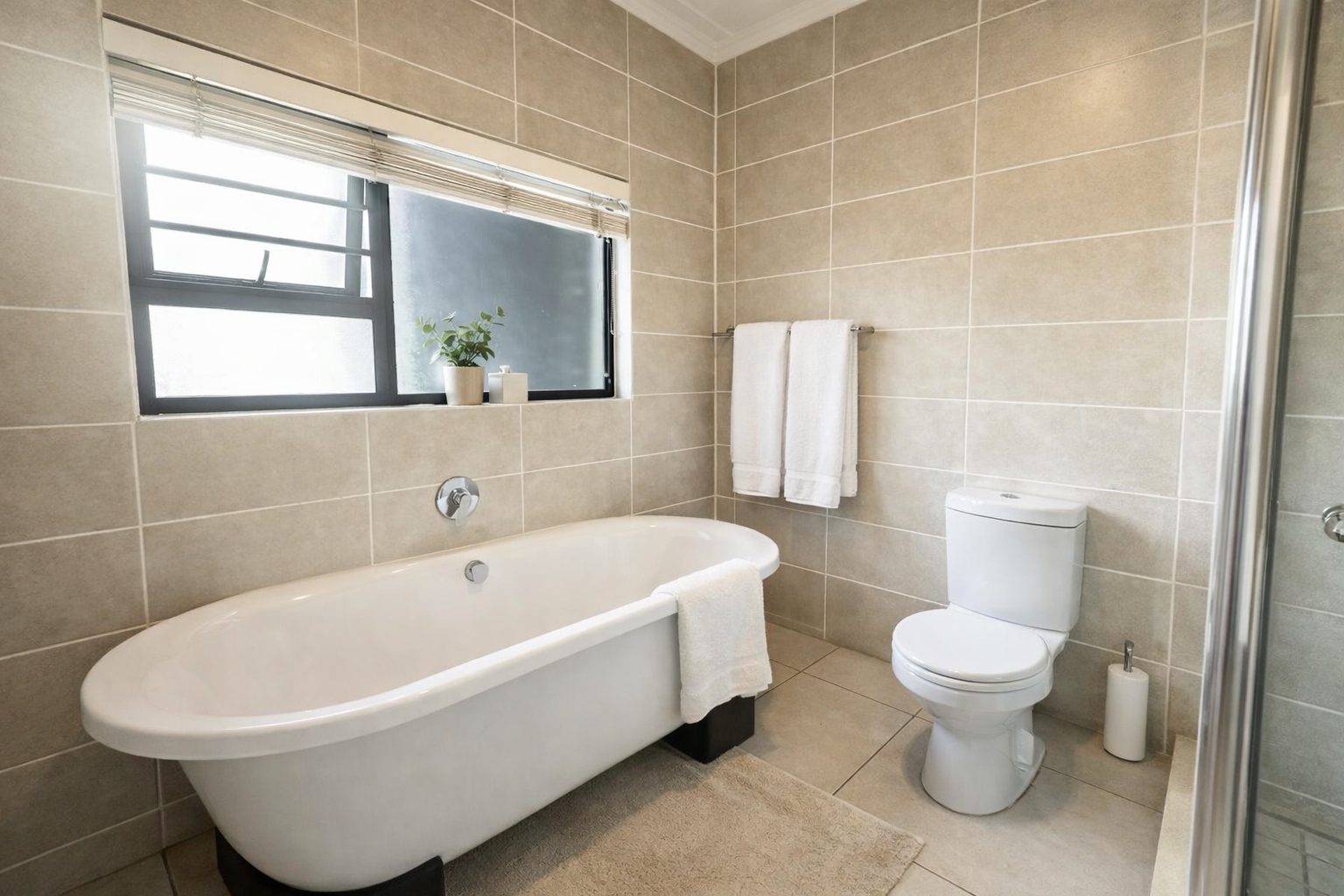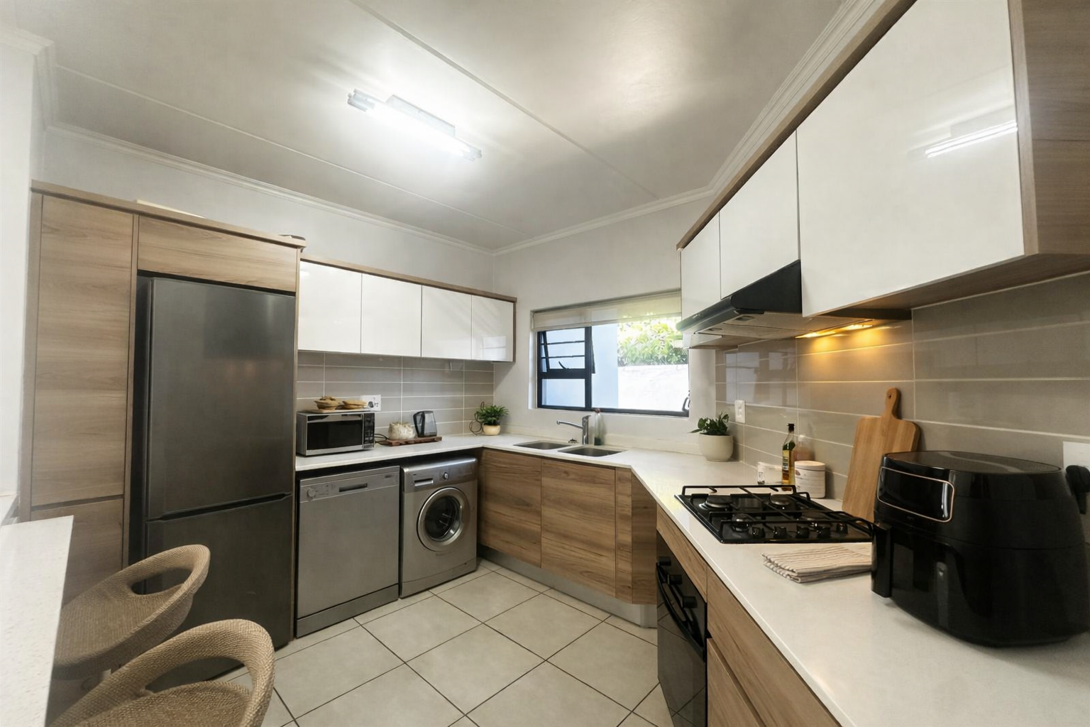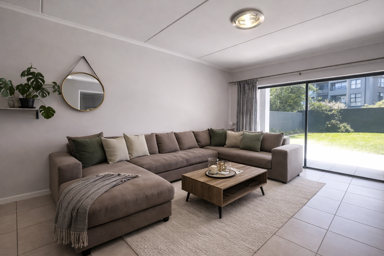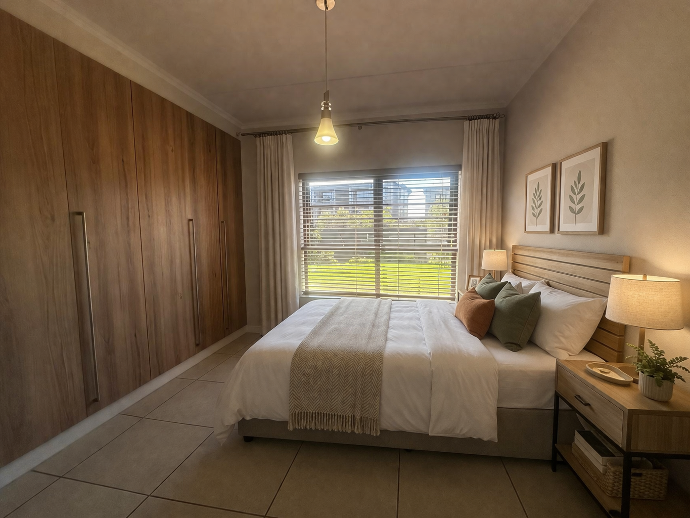 Positioned on the ground floor, this garden apartment features three well-sized bedrooms with built-in cupboards and two bathrooms, including a main en-suite. The layout is practical and well-suited to both everyday living and entertaining.