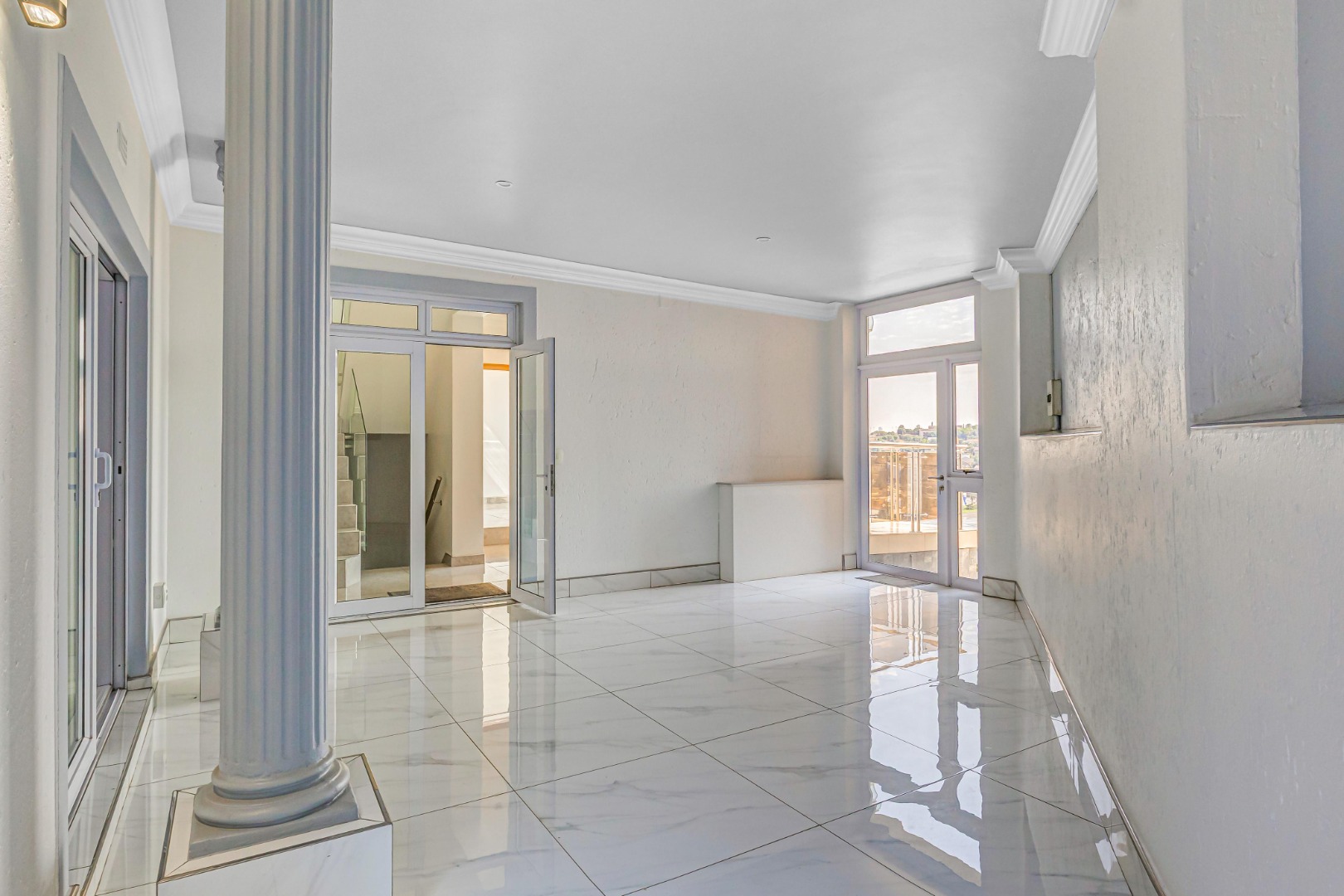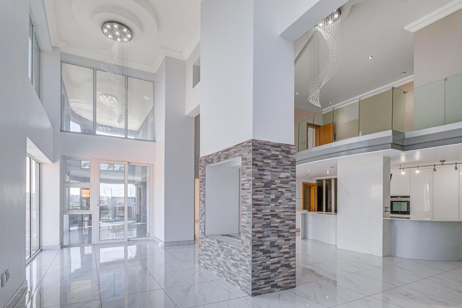 The interior boasts an open plan layout with high ceilings creating an airy and spacious ambiance. The heart of the home features a sleek modern white kitchen equipped with integrated appliances and a large island perfect for culinary enthusiasts. Four distinct lounges and four dining room areas provide ample space for both intimate gatherings and grand entertaining, further enhanced by a contemporary mezzanine level with elegant glass railings and a stylish built-in bar area.