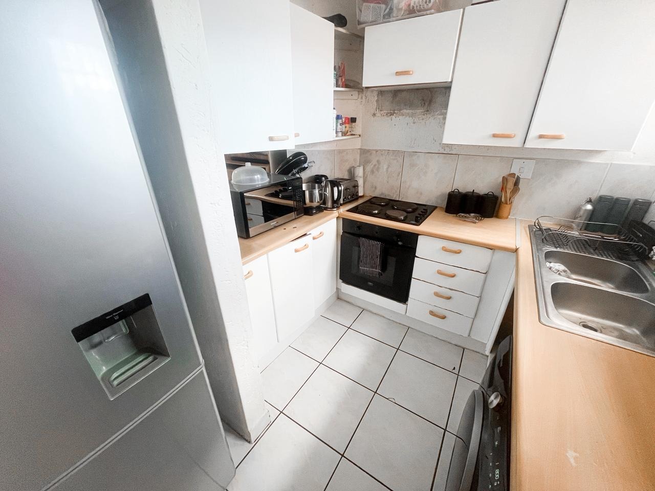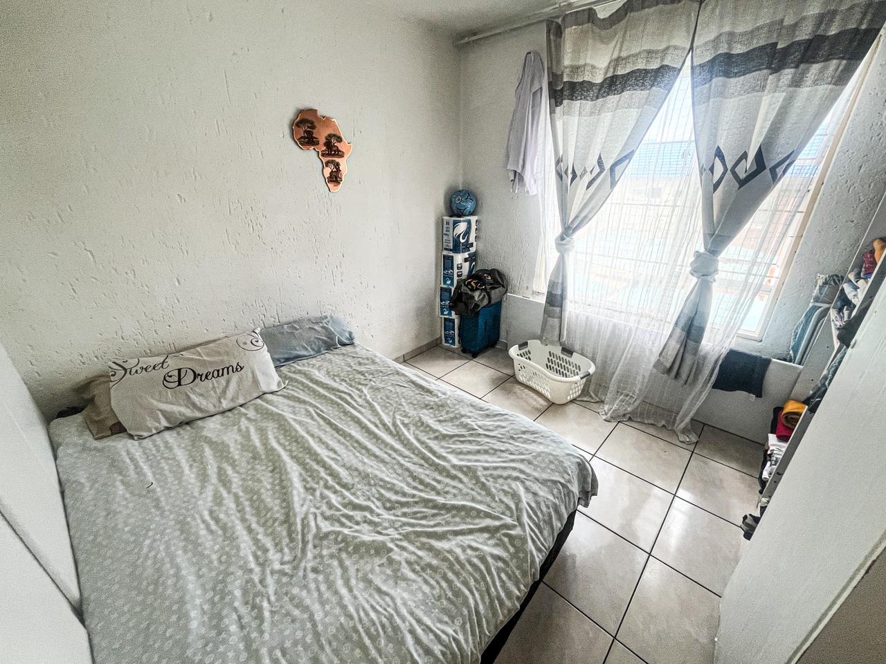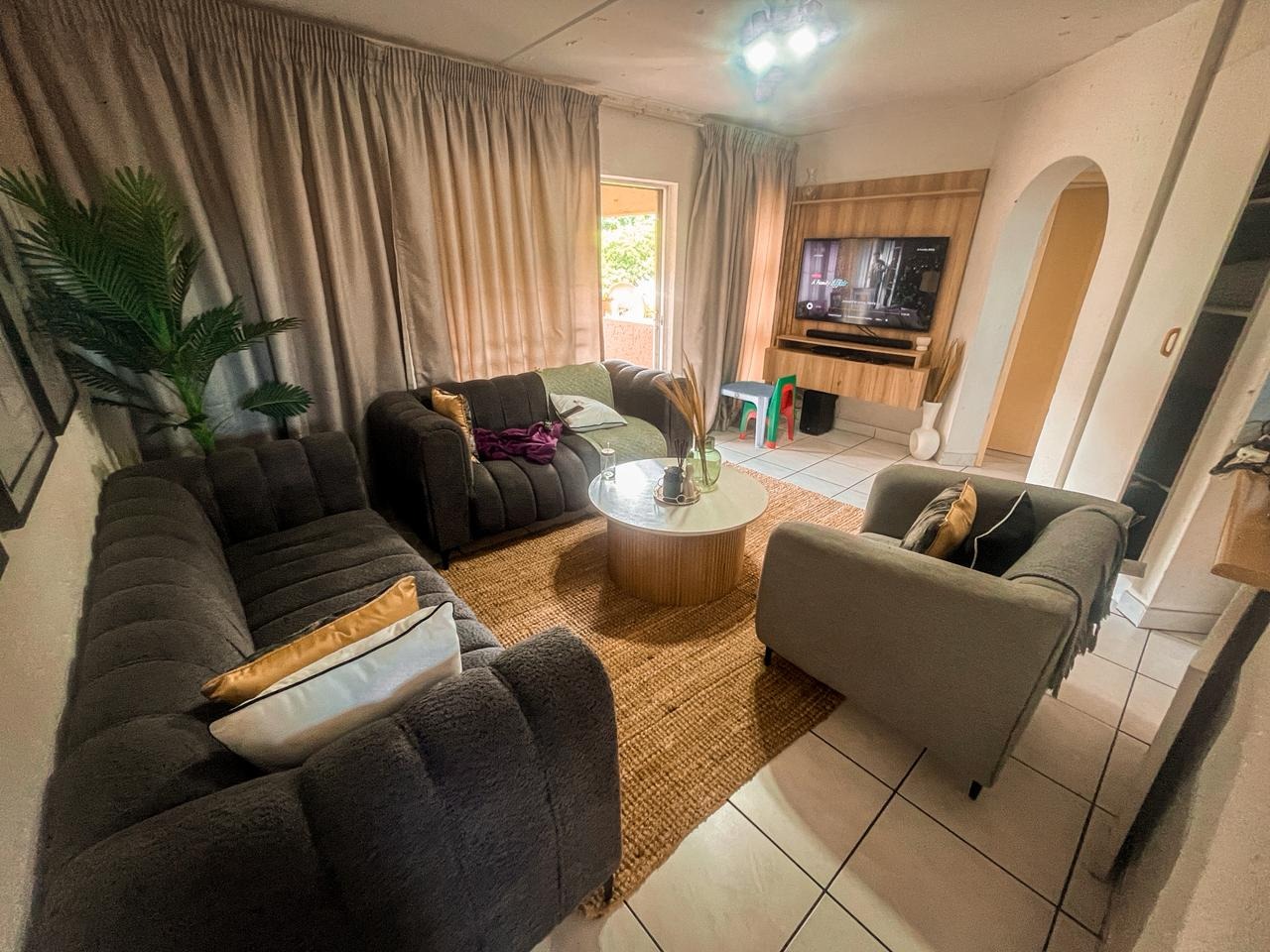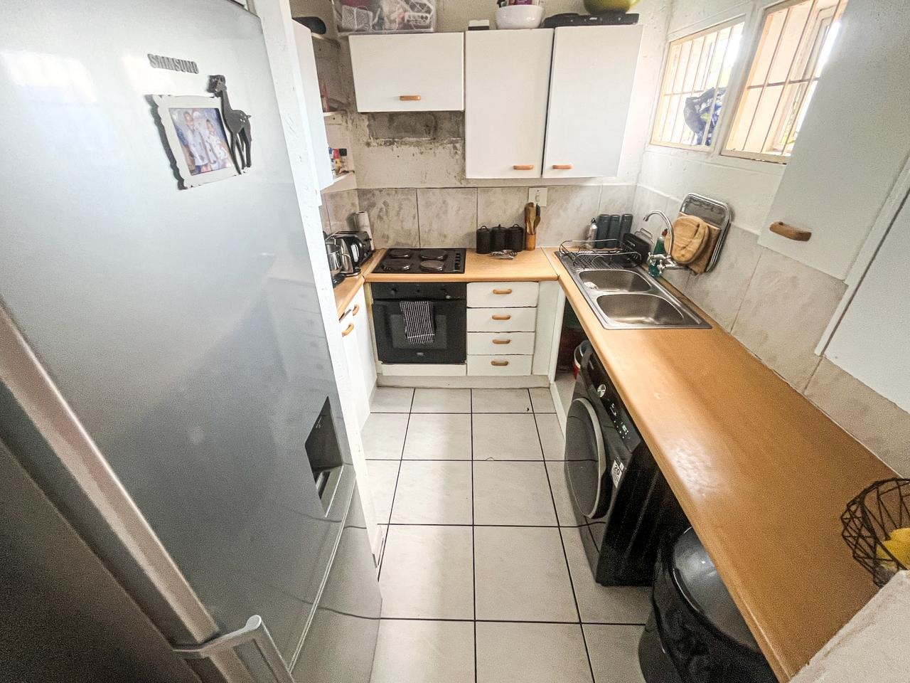 Step into this inviting two bedroom, one bathroom apartment located within a secure complex in Winchester Hills, Johannesburg. The functional U-shaped kitchen features white cabinetry, light wood-look countertops, a built-in gas hob and oven, and a double sink, offering practical space for daily meal preparation. Adjacent to this, the lounge area provides a comfortable setting with tiled flooring and a large window, allowing for ample natural light. An archway seamlessly connects the living spaces, enhancing the open feel.