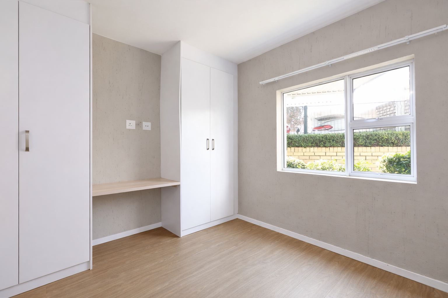 The bedroom is well-sized and fitted with floor-to-ceiling built-in cupboards, as well as a built-in vanity. The bedroom is positioned adjacent to the bathroom area, separated by a partition wall.