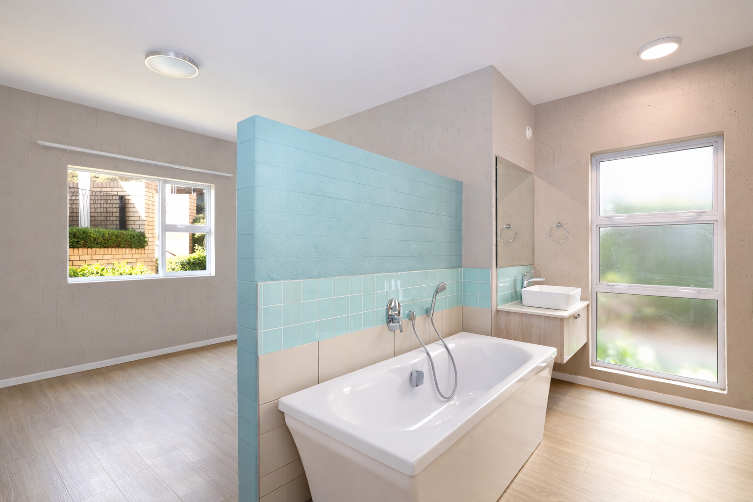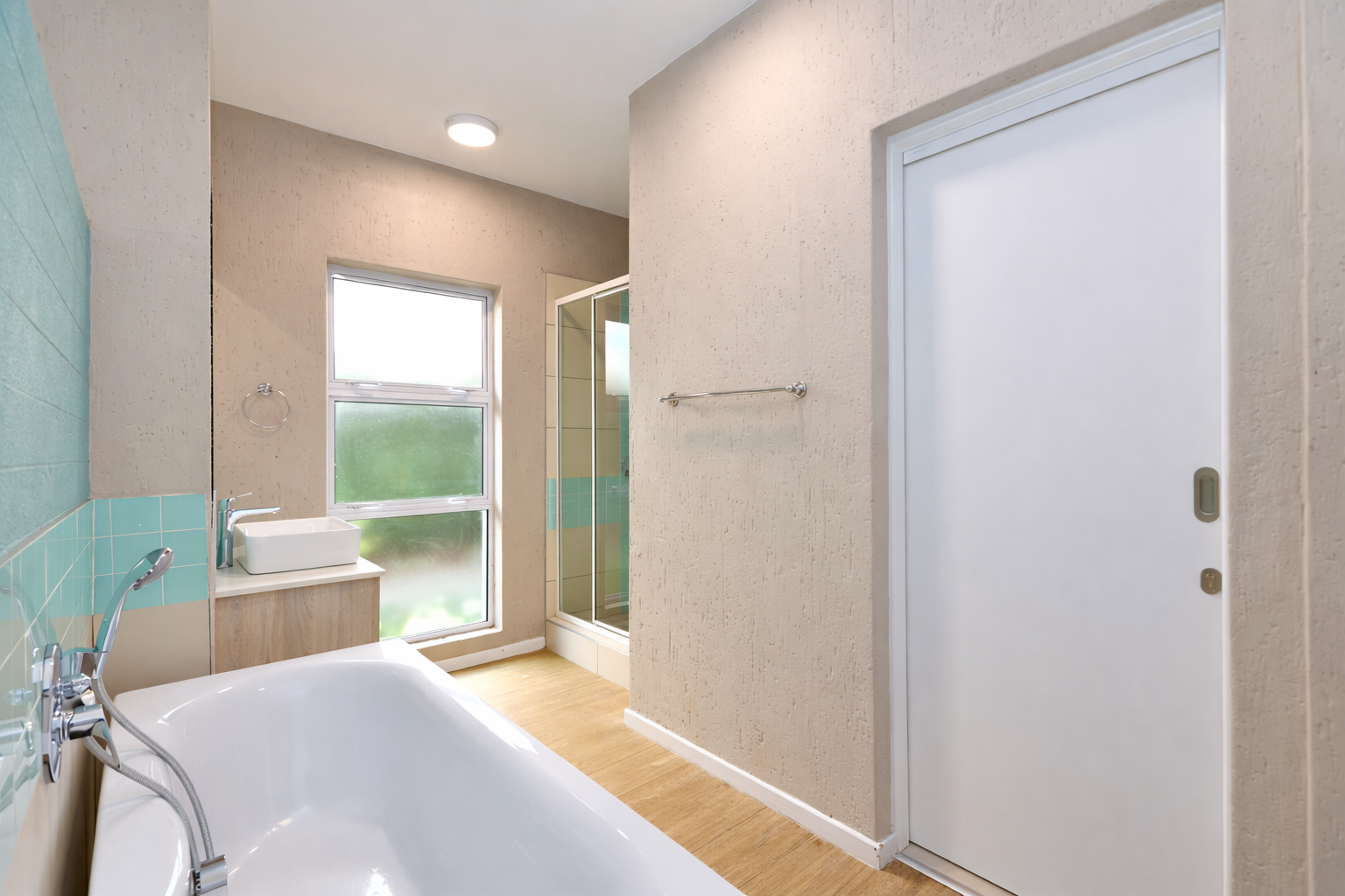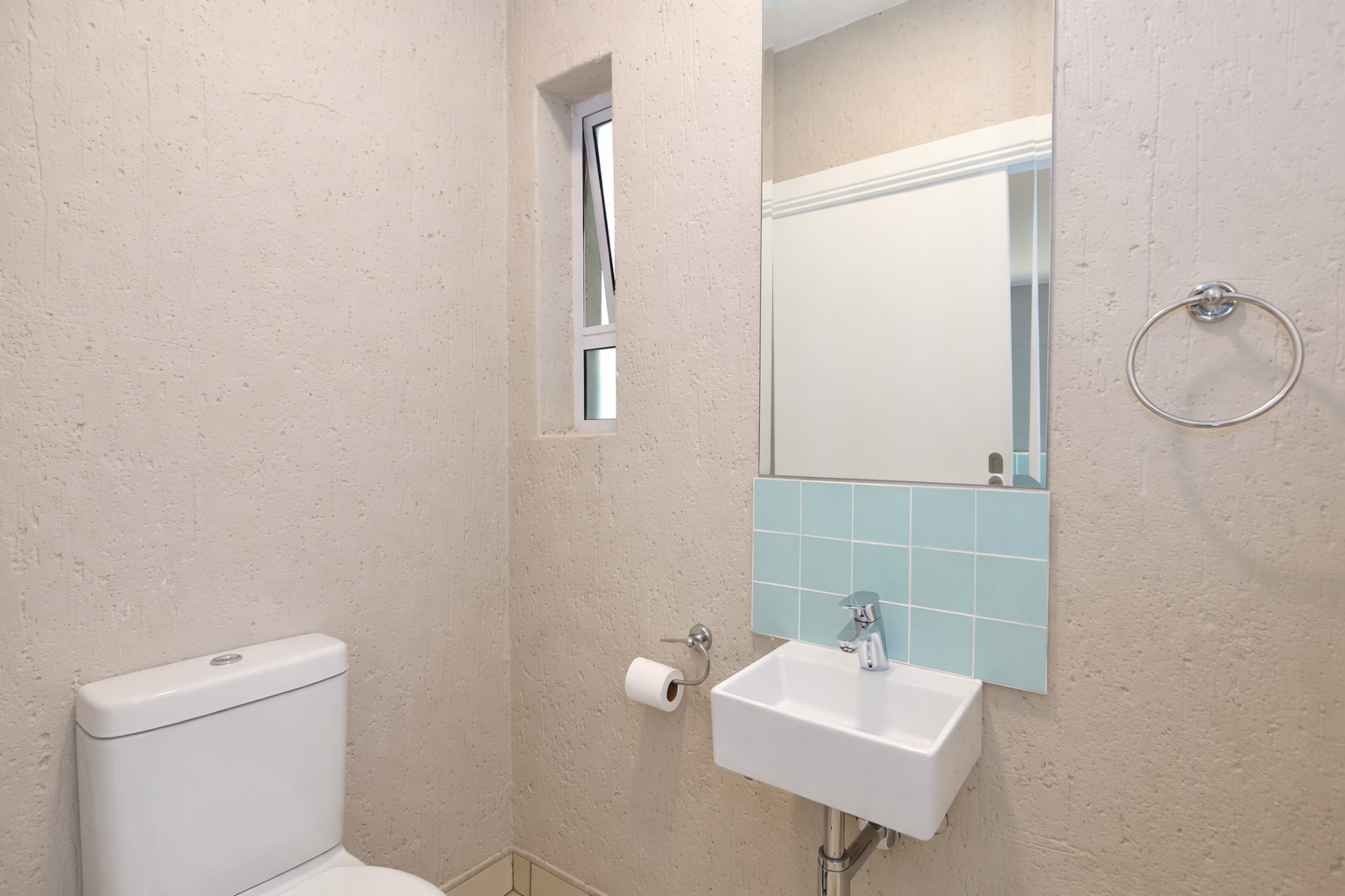 The unit includes a bathroom fitted with a bath, basin, and shower. The toilet is positioned separately with its own basin, allowing for guest use without accessing the main bathroom area.