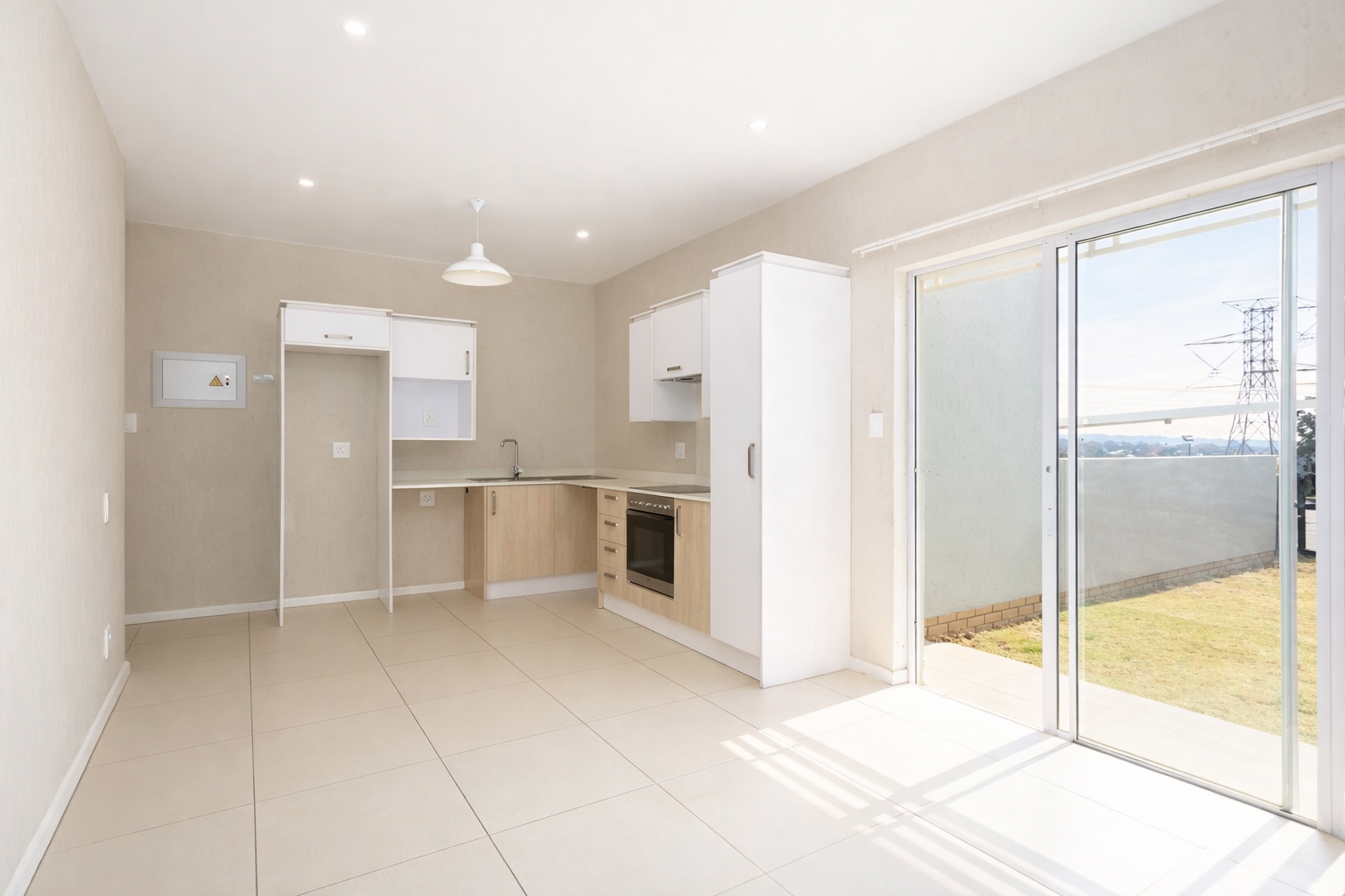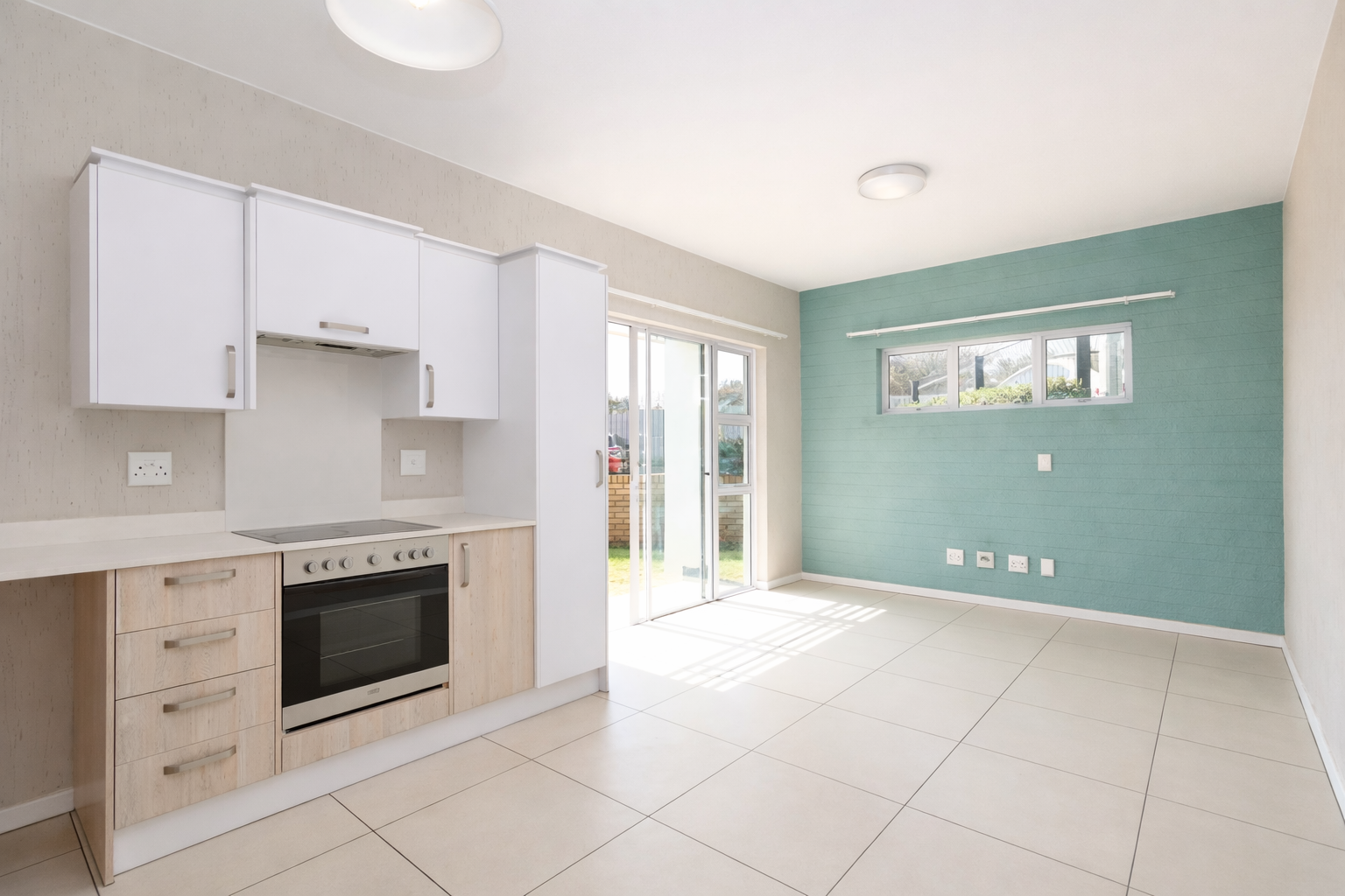 The layout is open-plan. From the garden, sliding doors lead into the living area and kitchen. The kitchen is fitted with an under-counter oven, hob, and extractor fan, and includes a double sink. It offers space for a single-door fridge, a dedicated microwave space, and connections for both a washing machine and dishwasher. The kitchen is fitted with ample built-in cupboards and flows directly into the lounge area. The living space is well-proportioned and receives natural light.