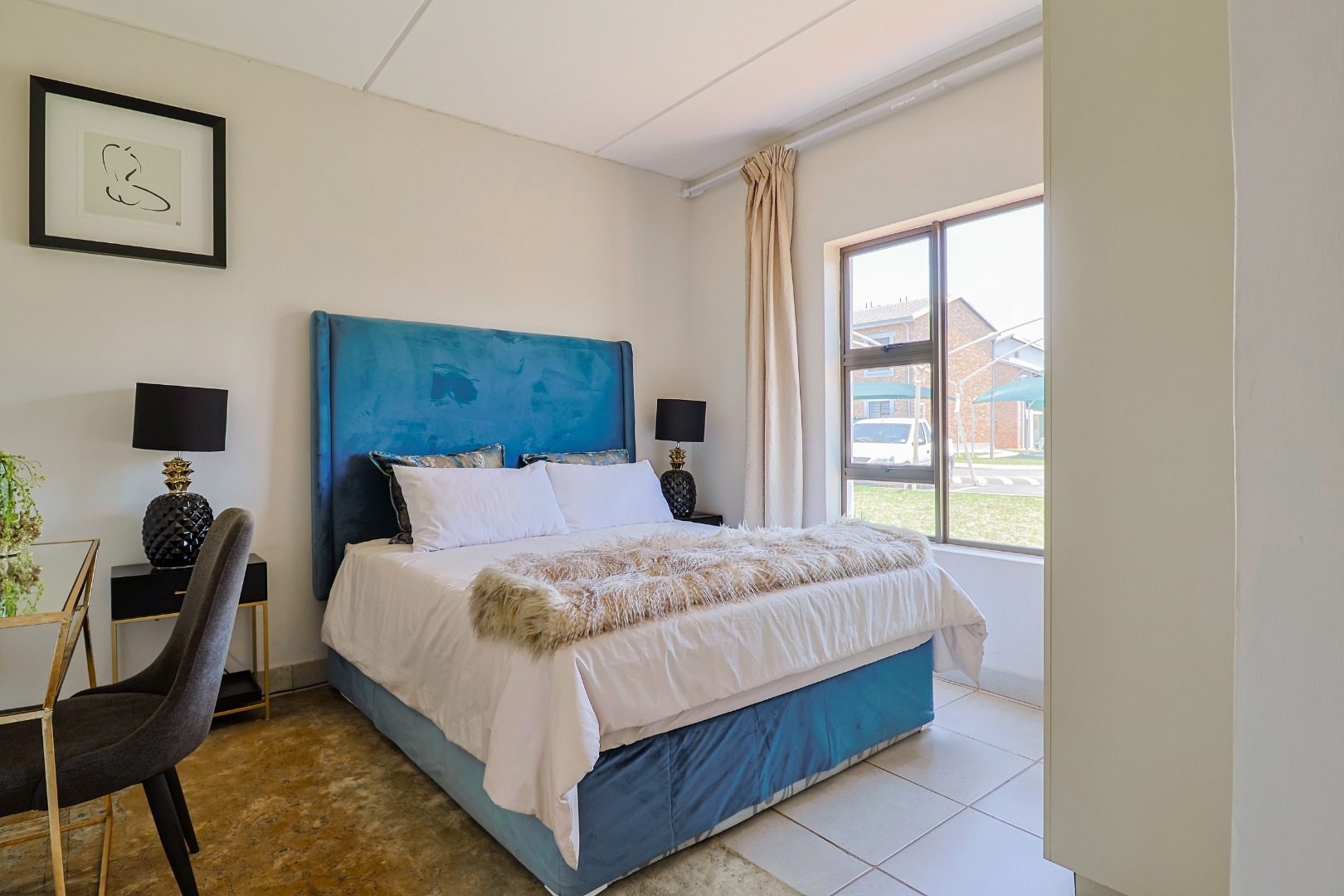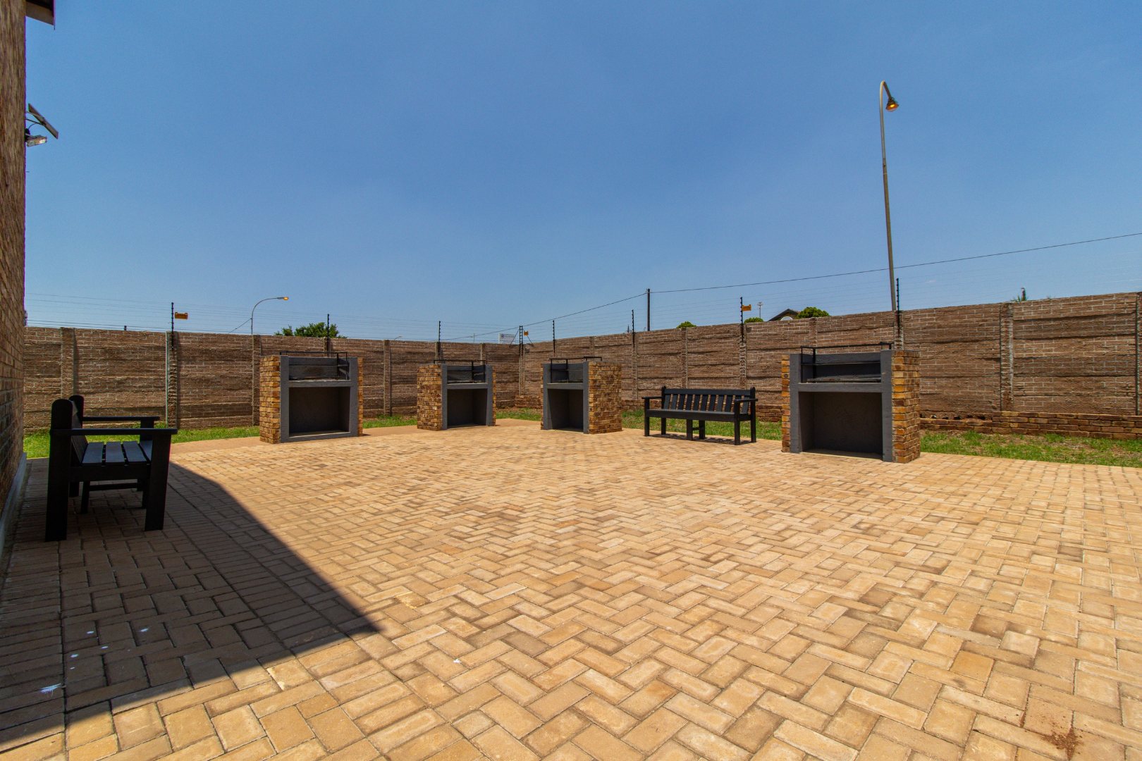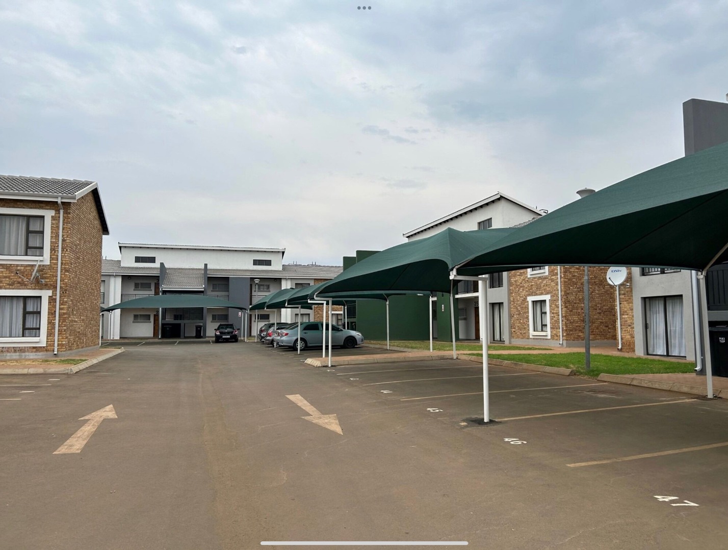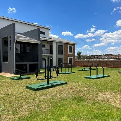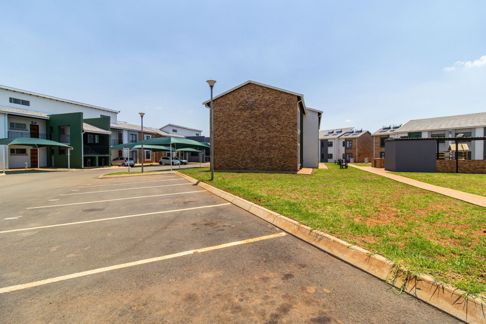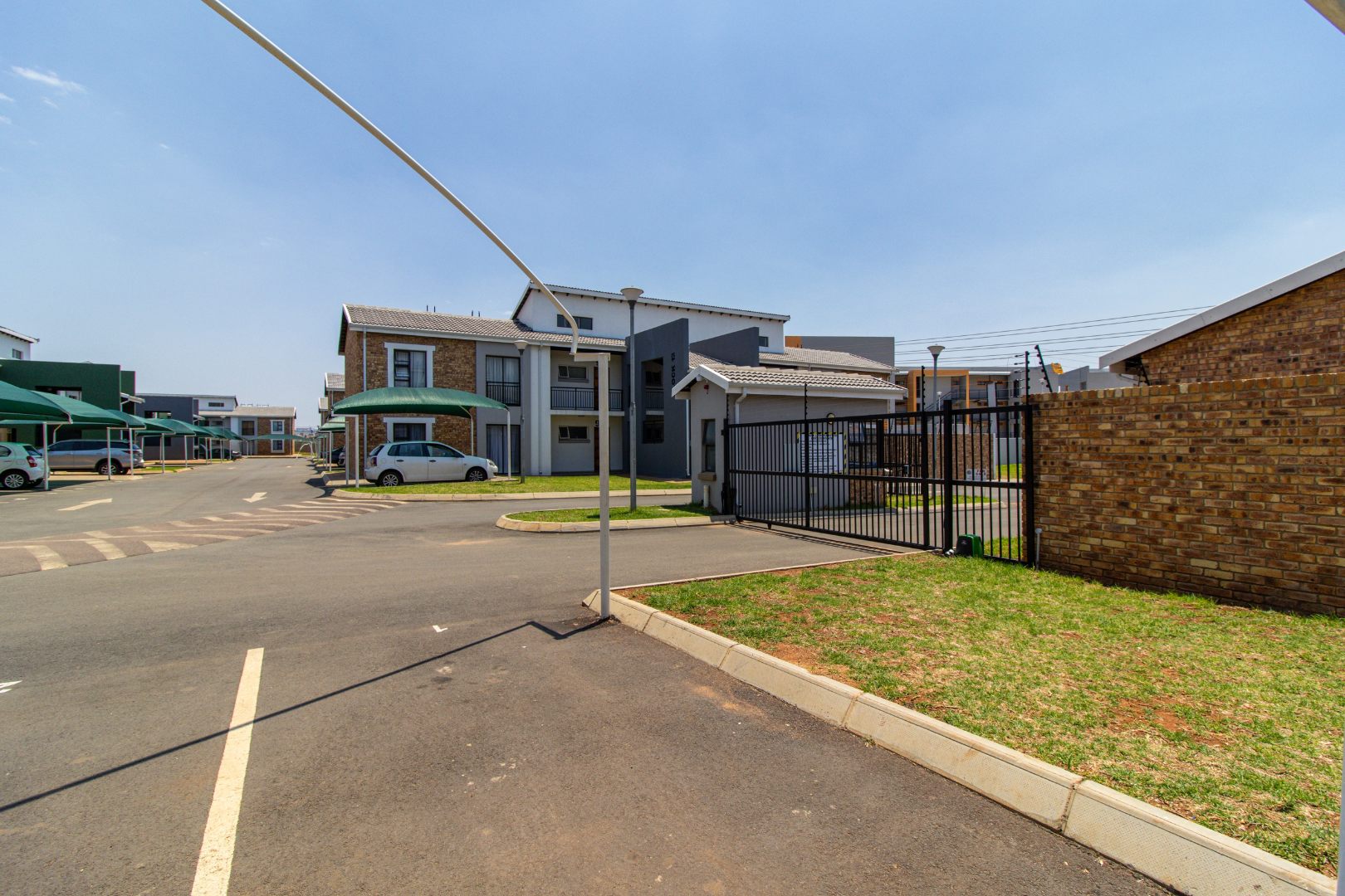 The exterior of the complex showcases a modern architectural design with a mix of brick and painted facades, set within a structured, paved environment. This suburban location in Soweto offers convenient access to local amenities and transport links, making it an ideal choice for those seeking a balanced urban lifestyle.
