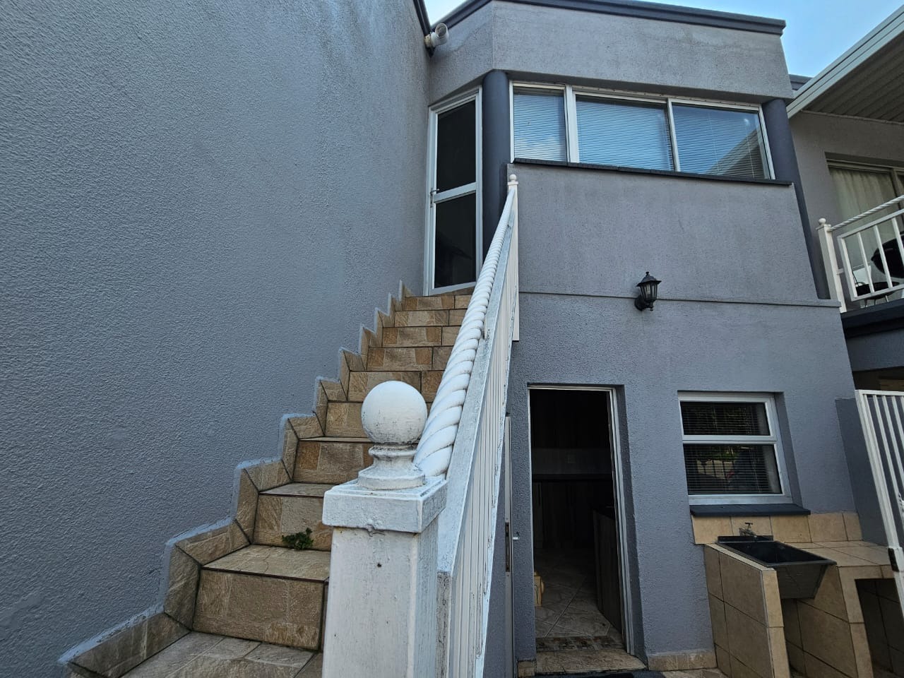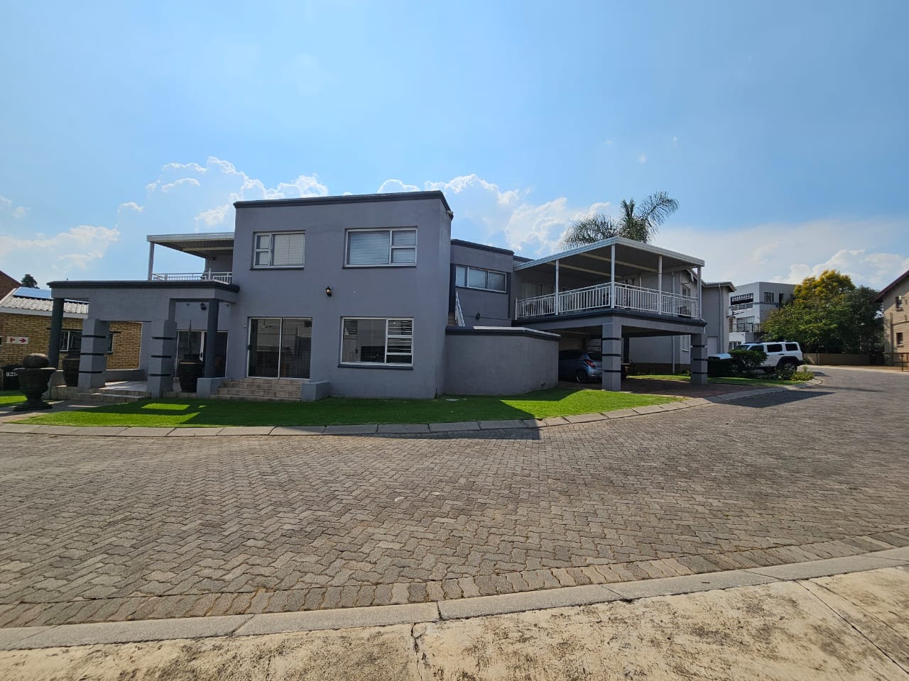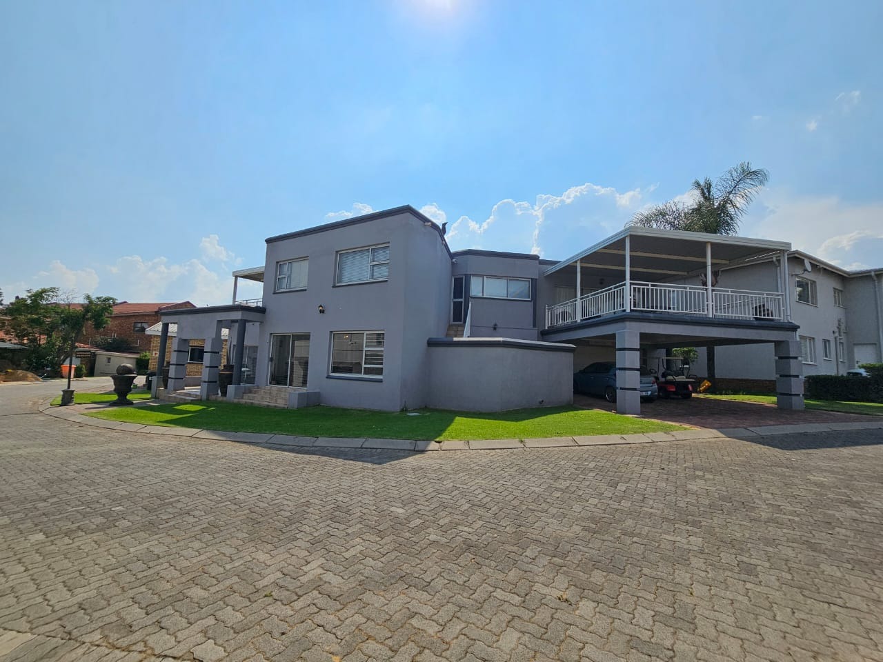 Discover this contemporary home within a secure complex. Boasting a sleek grey exterior with dark accents, this two-story home presents an inviting kerb appeal. Large windows and sliding doors ensure abundant natural light, complementing the well-maintained front lawn and paved communal areas. An integrated covered carport provides convenient parking. Situated in a fishing estate, the property offers access to aquatic activities and boat launch facilities, perfect for water enthusiasts.