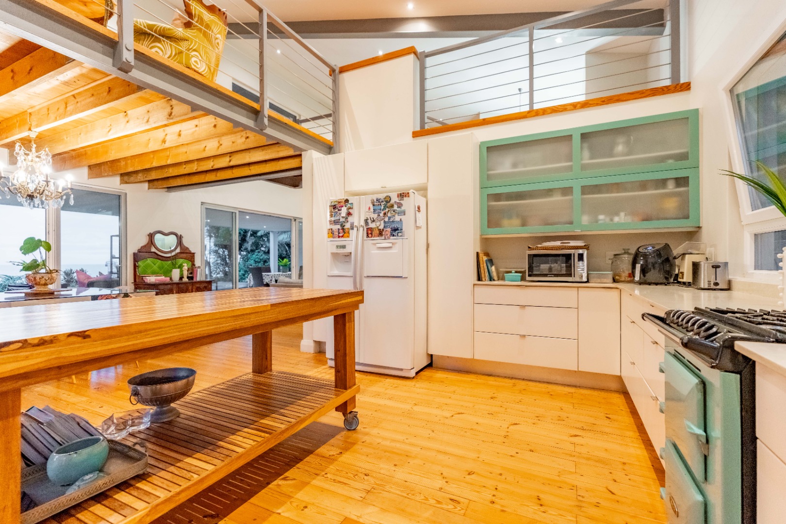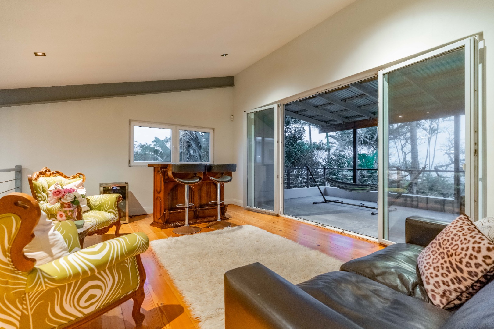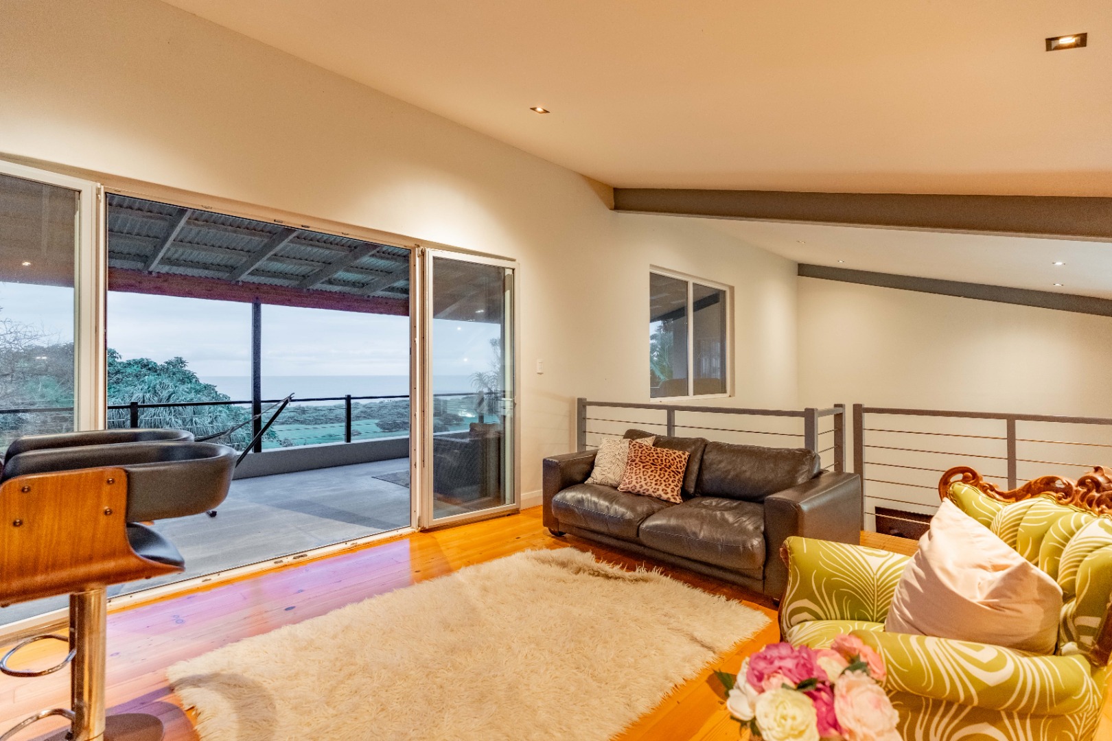 The upstairs lounge is a standout feature of the home, offering a serene and private space that leads out onto a covered patio. From here, one can soak in the spectacular sea views—an idyllic spot to unwind and enjoy the serene beauty of the surrounding landscape.