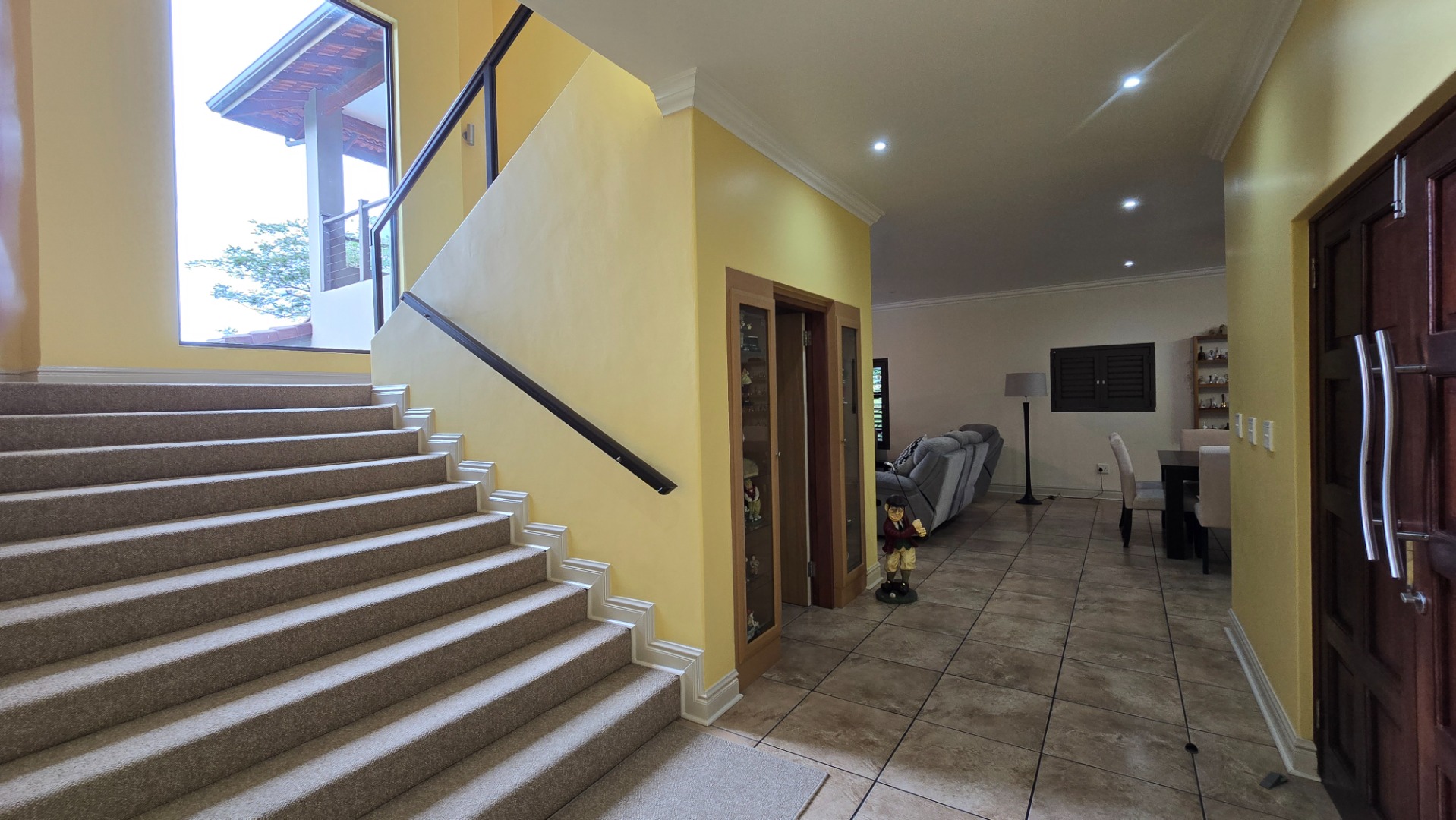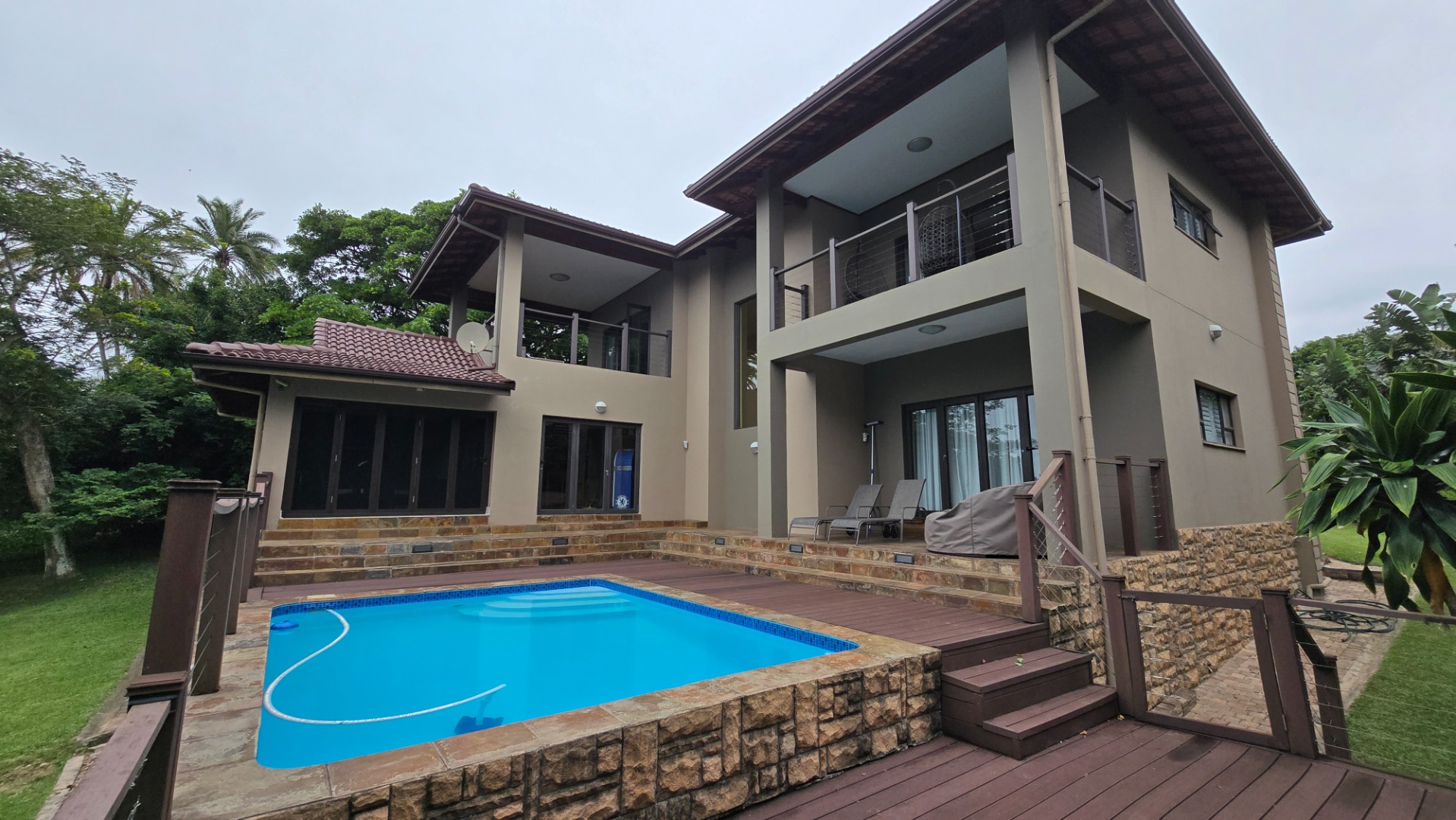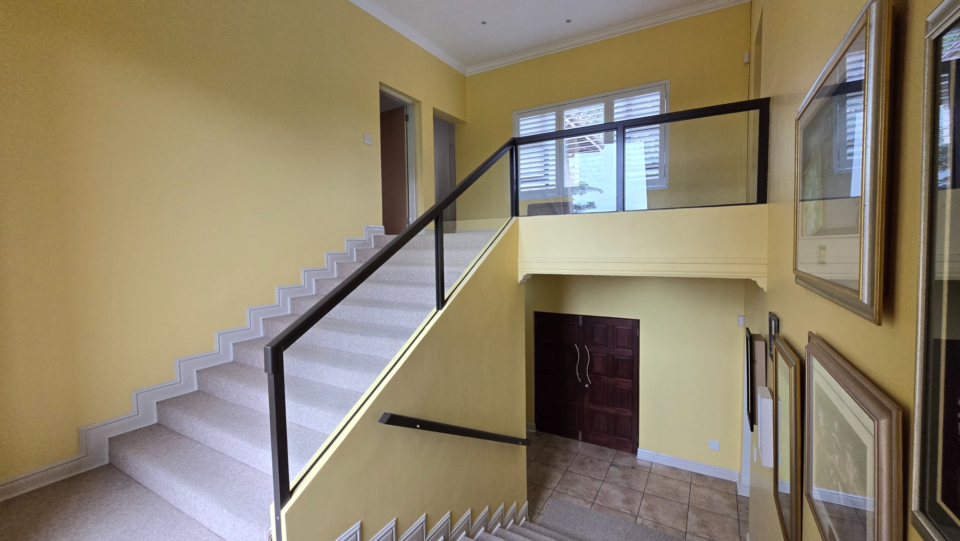 Located within the exclusive Eden Rock Eco Estate in the coastal enclave of Pennington, this distinguished multi-level residence presents an exceptional opportunity to acquire a sophisticated, security-focused home in a tranquil eco-estate setting. Positioned on a 1,035 sqm stand with approximately 640 sqm under roof, the property combines architectural presence with refined coastal living. The exterior is defined by a tiled roof, stone-clad detailing, and established landscaping, while a paved driveway leads to a triple automated garage. Upon entry, a bespoke, wide staircase—architecturally designed and framed by a dramatic full-height window—creates an immediate sense of volume and light, offering a grand yet elegant arrival experience. Discreetly positioned beneath the staircase is a versatile space suitable for use as a wine cellar, cloakroom, or secure storage, reflecting the home’s thoughtful attention to detail.