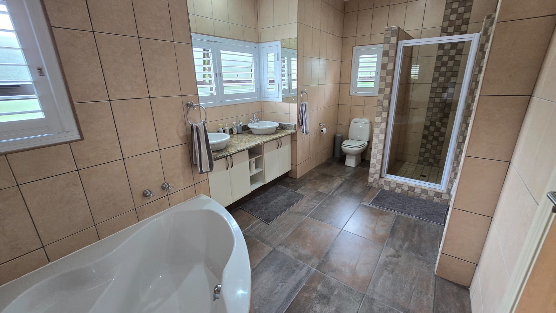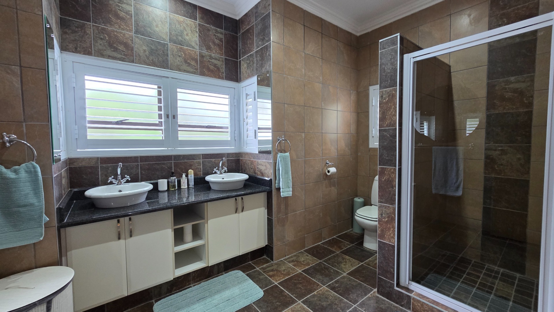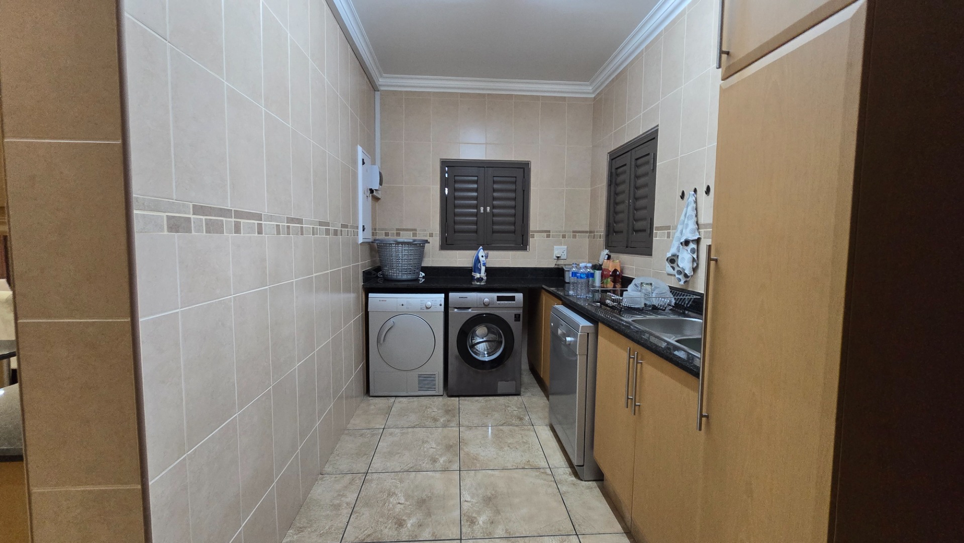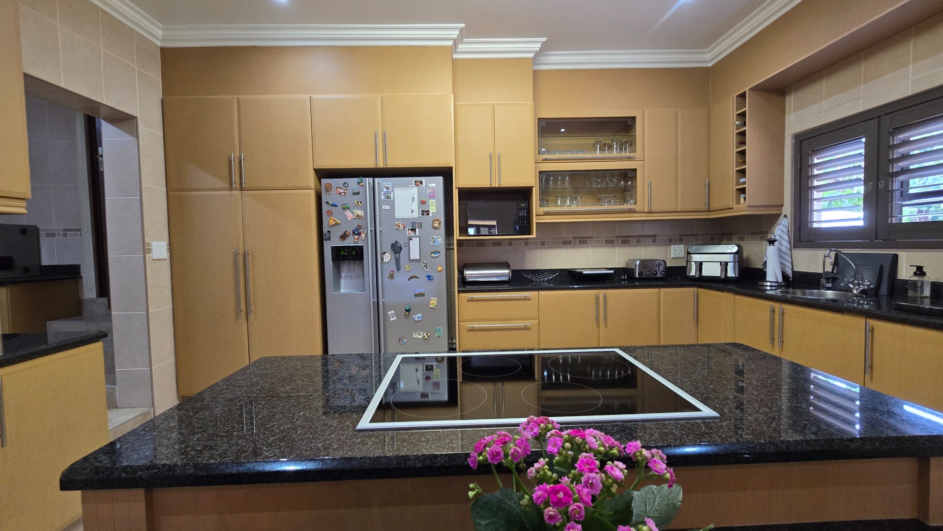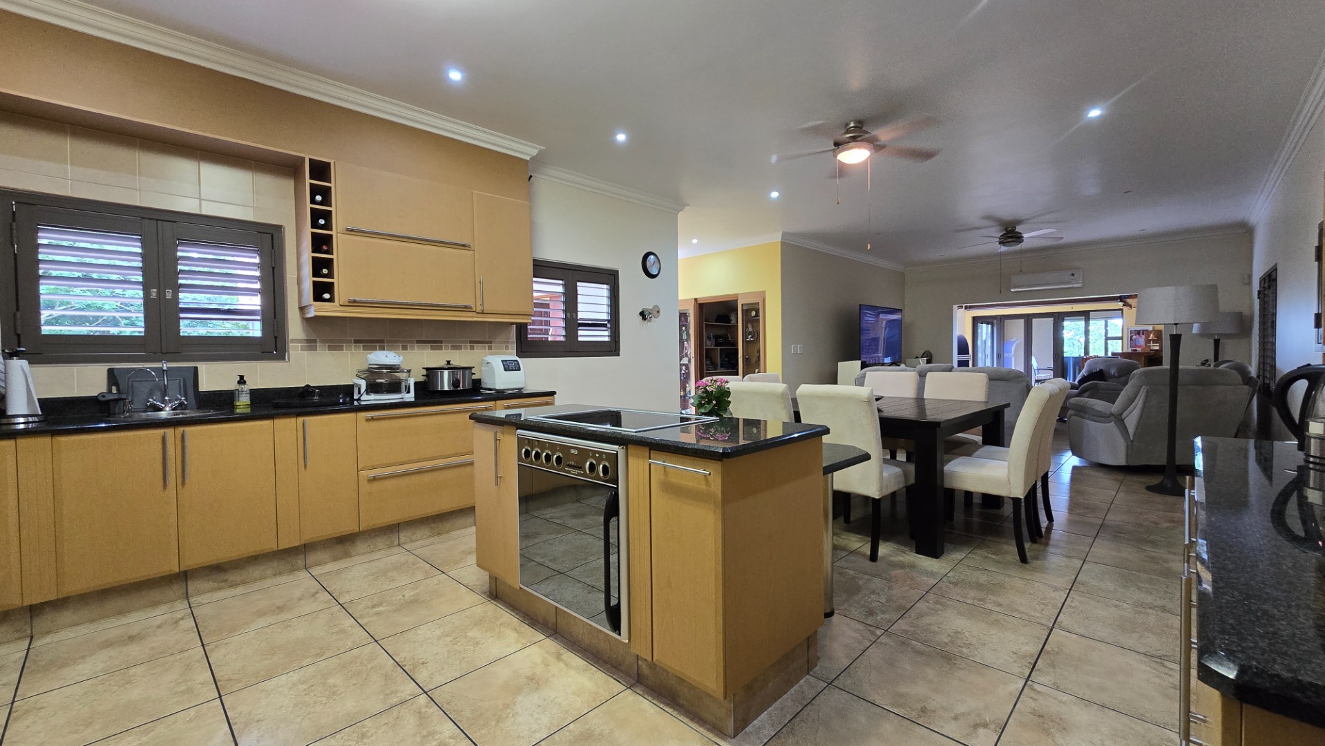 The principal living level is designed for effortless entertaining and executive comfort, featuring expansive open-plan living, dining, and kitchen areas that flow seamlessly onto balconies and outdoor spaces with scenic and distant sea views. The kitchen is both functional and refined, offering generous cabinetry, dark stone countertops, and a substantial central island with integrated hob. The lounge is climate-controlled with air conditioning and ceiling fans, ensuring year-round comfort. Accommodation comprises four well-proportioned bedrooms, each with its own en-suite bathroom, supported by an additional guest cloakroom. A dedicated laundry and scullery area with extensive built-in cabinetry enhances daily practicality, while a whole-house water filtration system, connected to all bathrooms, elevates everyday living to a premium standard.