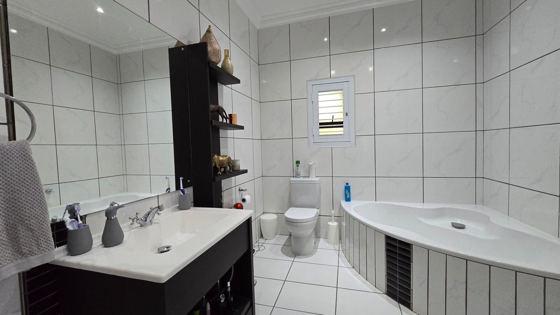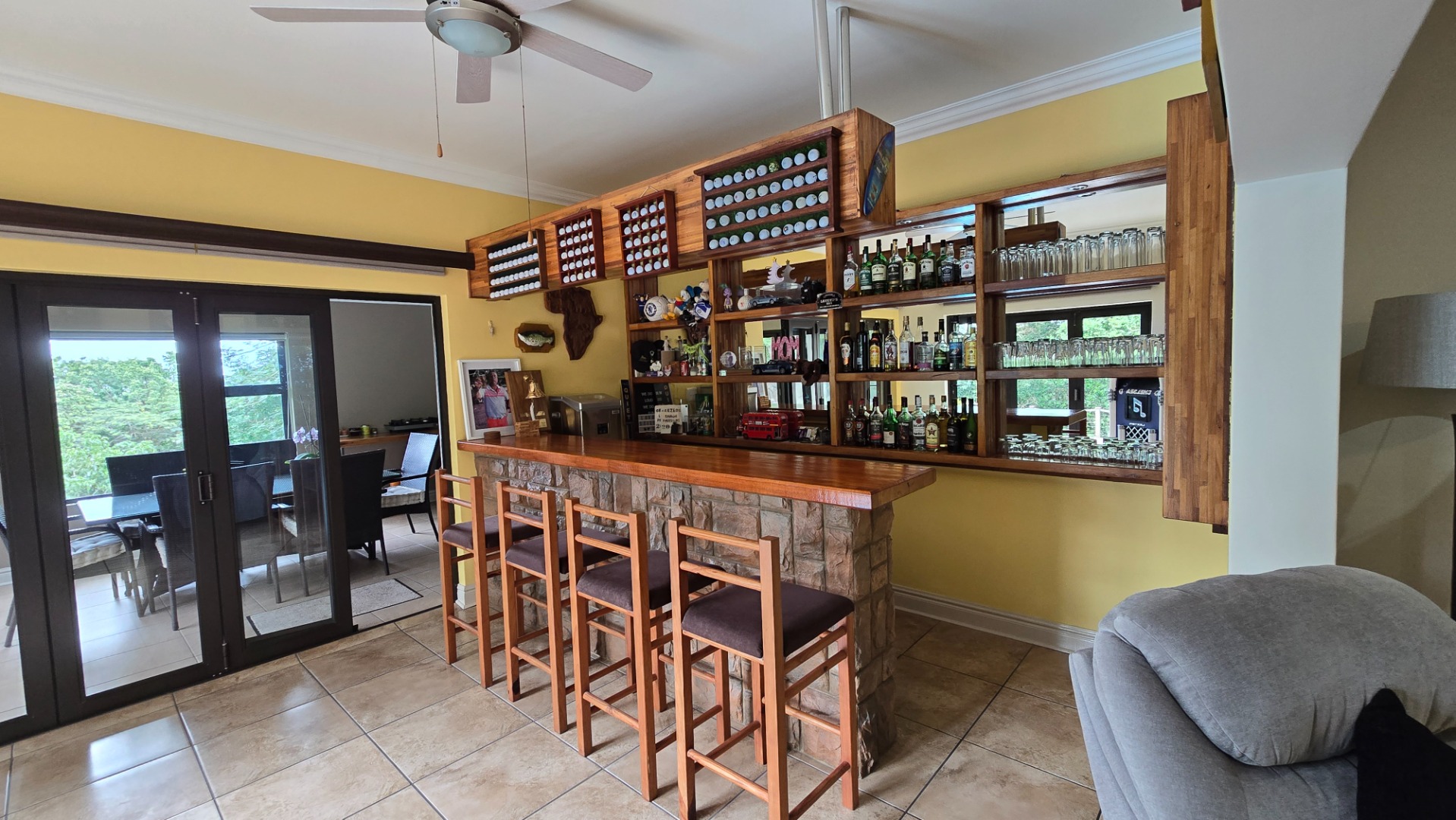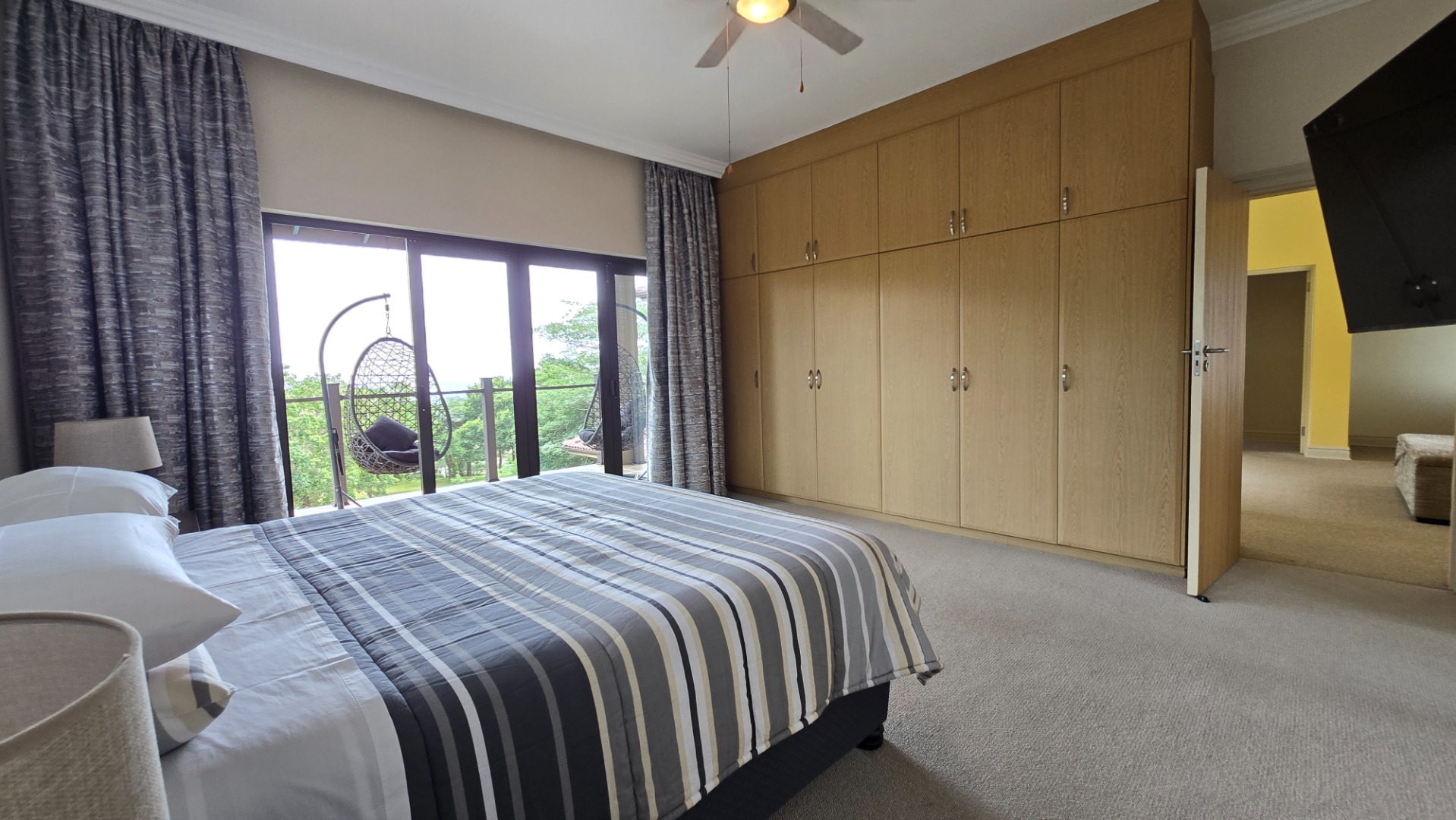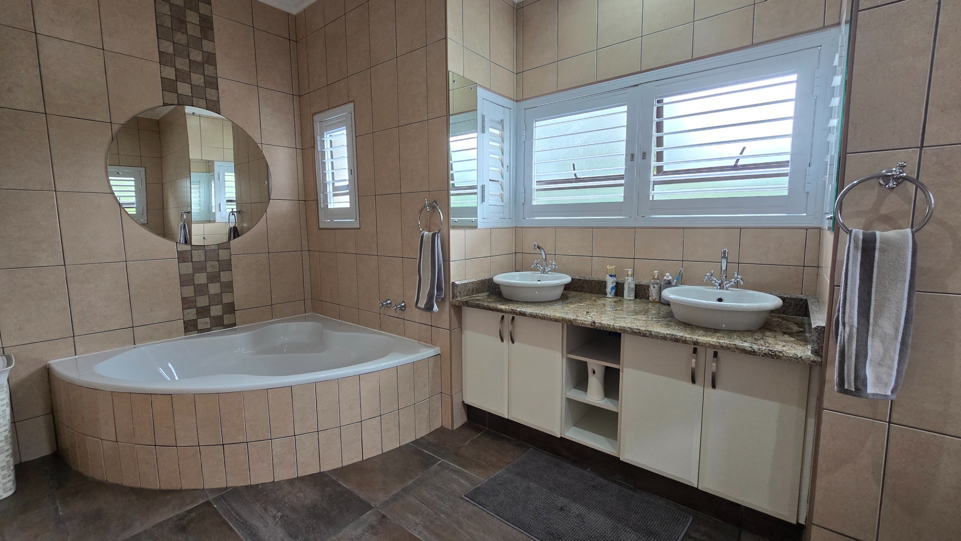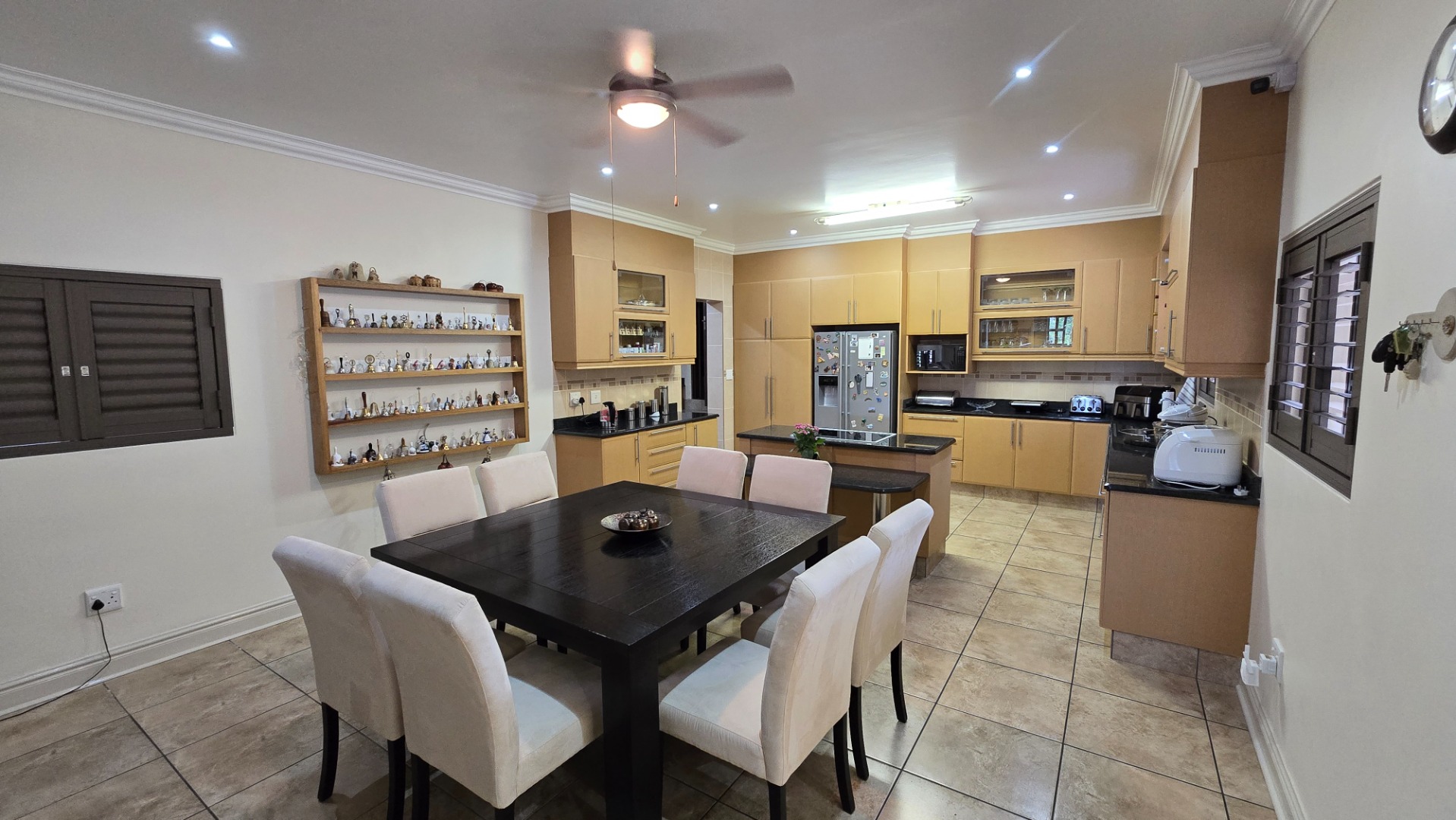 The principal living level is designed for effortless entertaining and executive comfort, featuring expansive open-plan living, dining, and kitchen areas that flow seamlessly onto balconies and outdoor spaces with scenic and distant sea views. The kitchen is both functional and refined, offering generous cabinetry, dark stone countertops, and a substantial central island with integrated hob. The lounge is climate-controlled with air conditioning and ceiling fans, ensuring year-round comfort. Accommodation comprises four well-proportioned bedrooms, each with its own en-suite bathroom, supported by an additional guest cloakroom. A dedicated laundry and scullery area with extensive built-in cabinetry enhances daily practicality, while a whole-house water filtration system, connected to all bathrooms, elevates everyday living to a premium standard.