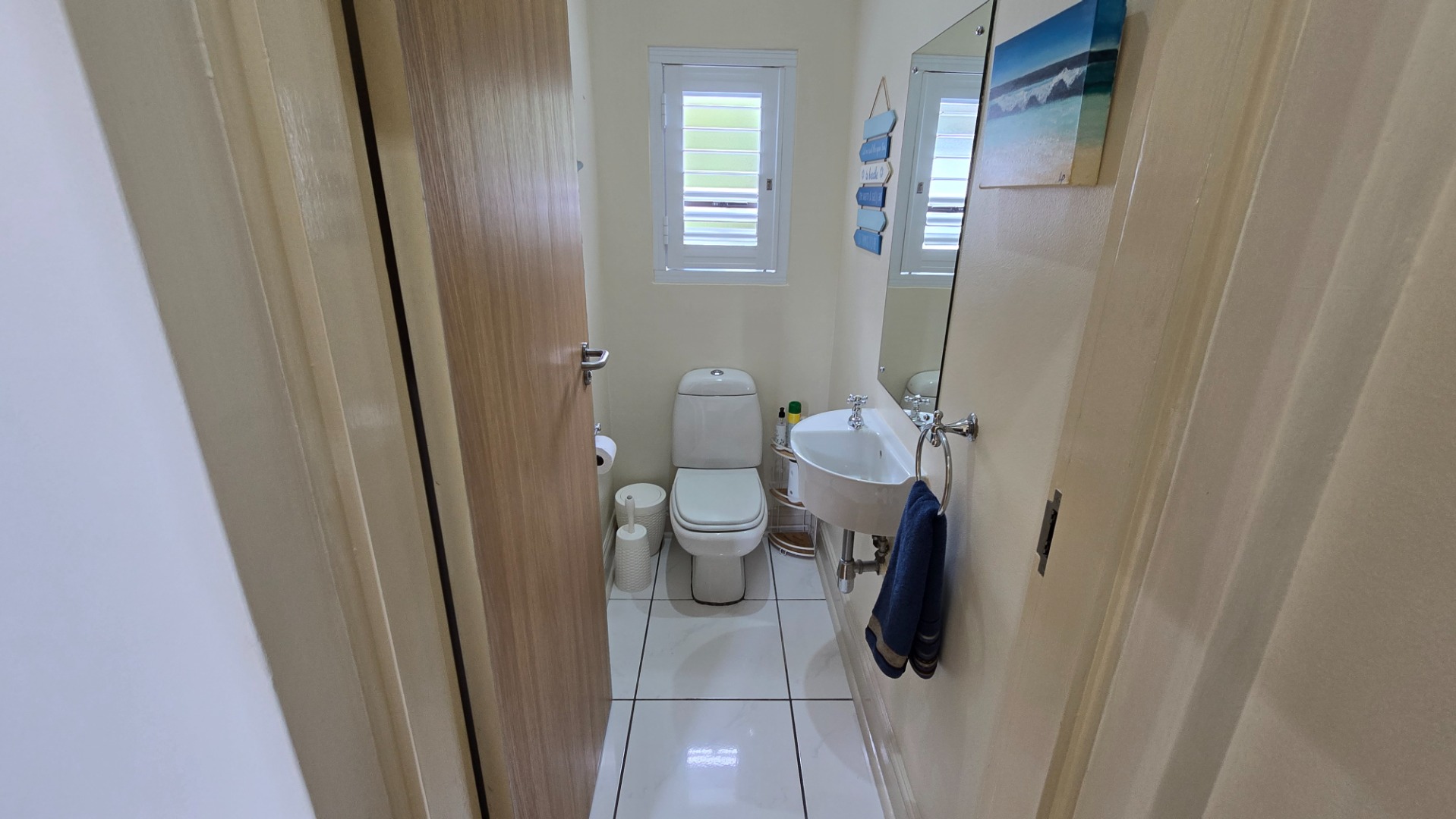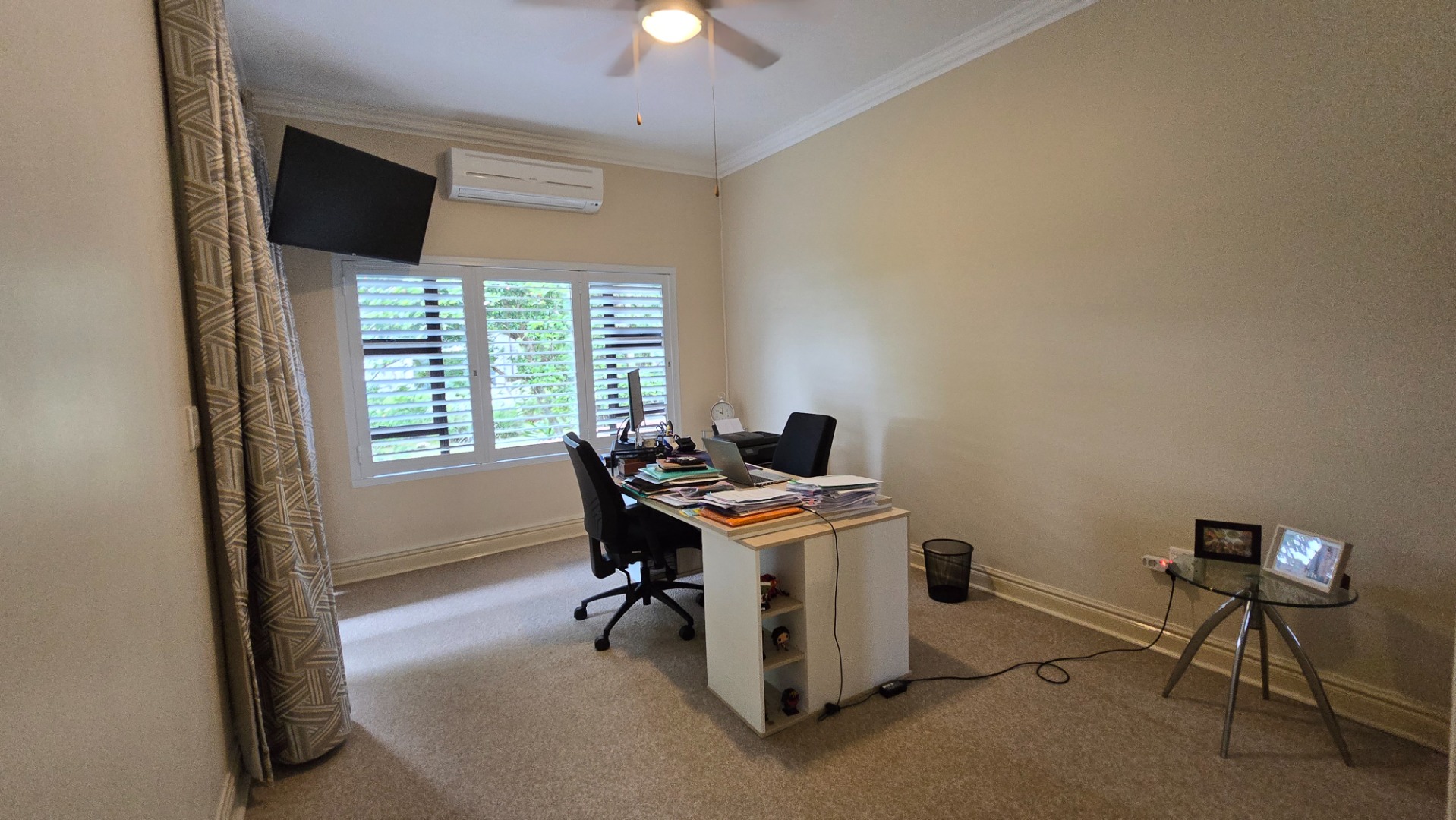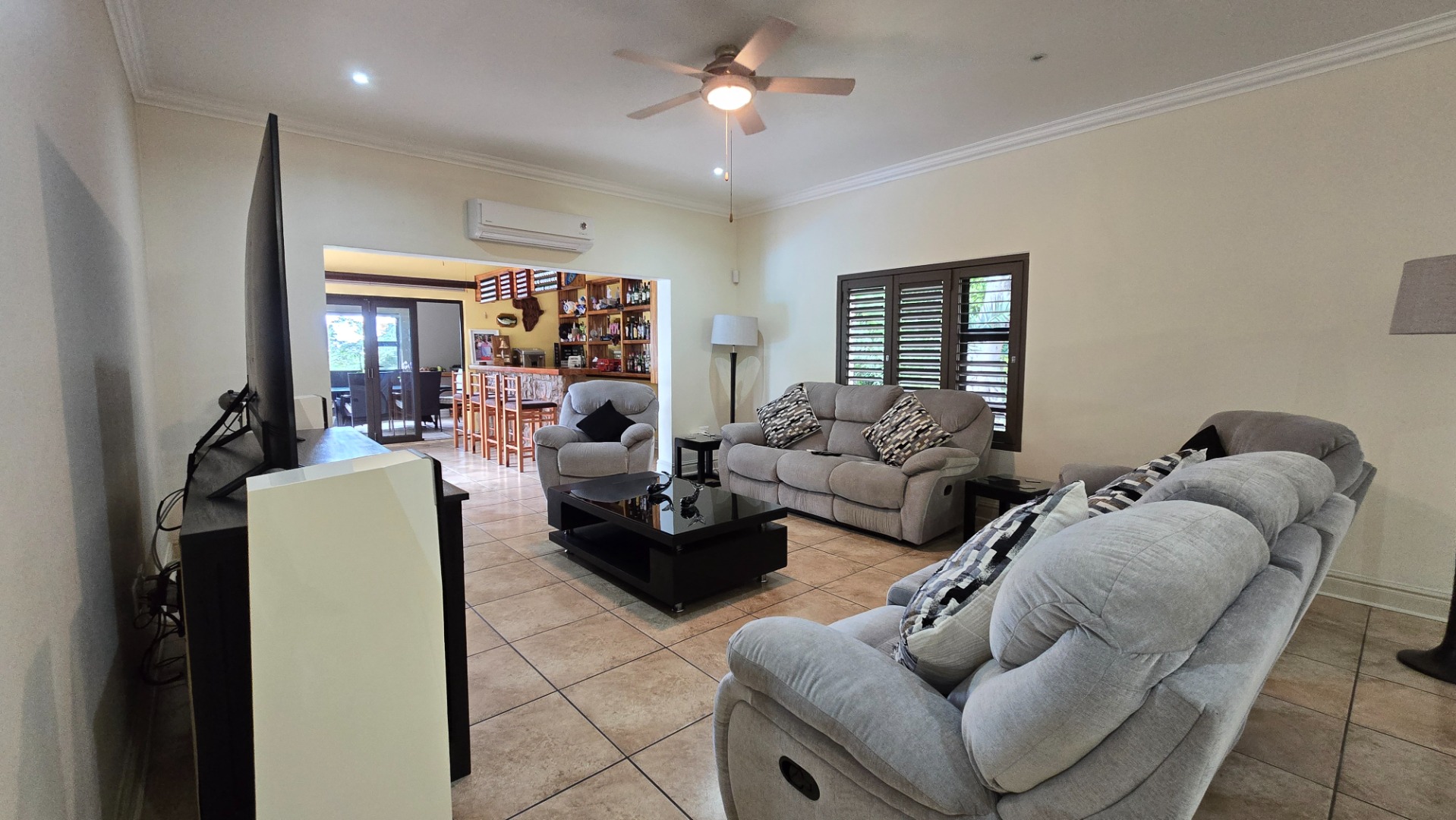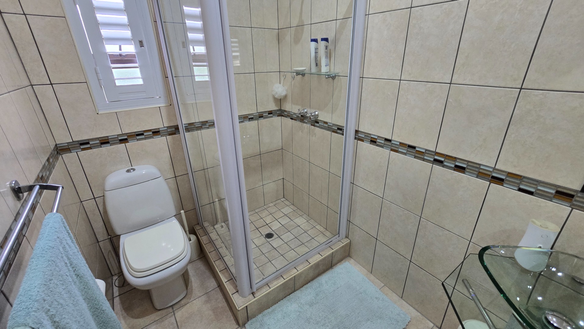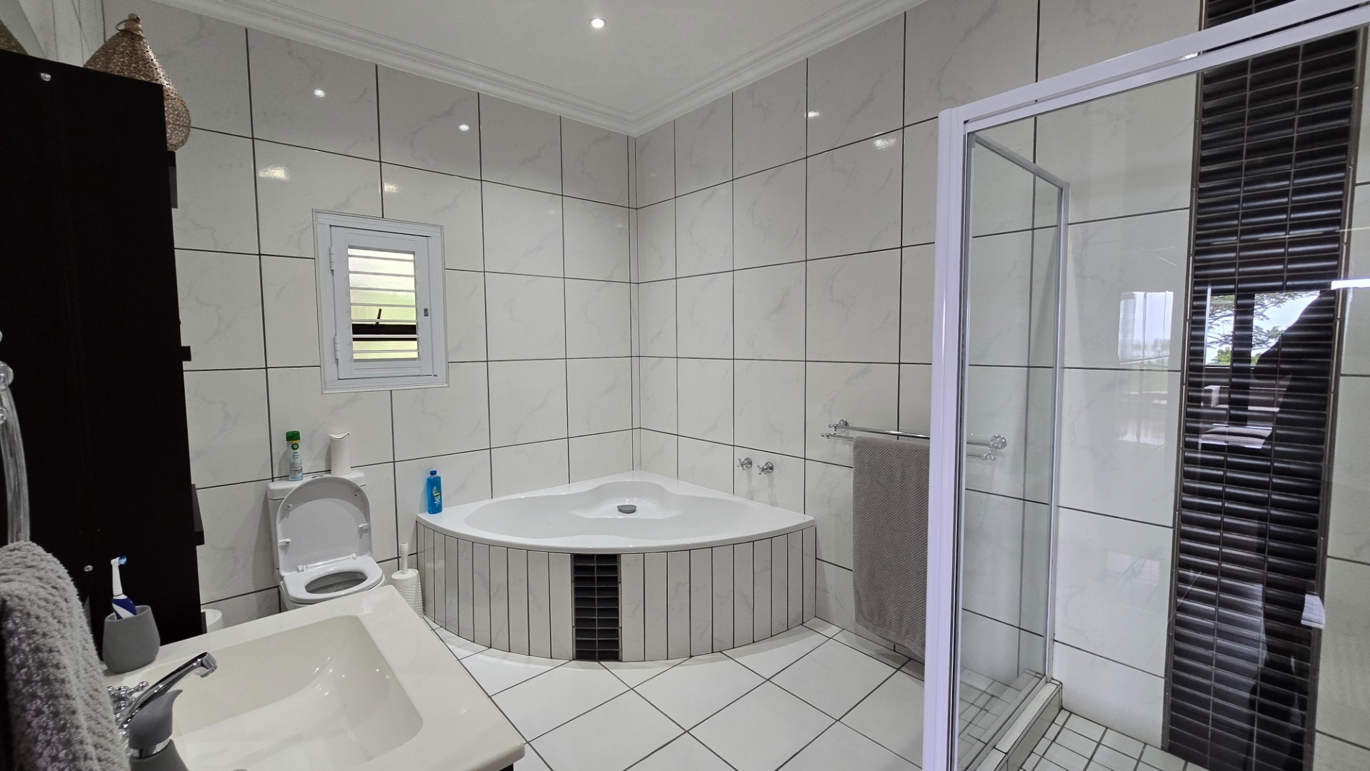 The principal living level is designed for effortless entertaining and executive comfort, featuring expansive open-plan living, dining, and kitchen areas that flow seamlessly onto balconies and outdoor spaces with scenic and distant sea views. The kitchen is both functional and refined, offering generous cabinetry, dark stone countertops, and a substantial central island with integrated hob. The lounge is climate-controlled with air conditioning and ceiling fans, ensuring year-round comfort. Accommodation comprises four well-proportioned bedrooms, each with its own en-suite bathroom, supported by an additional guest cloakroom. A dedicated laundry and scullery area with extensive built-in cabinetry enhances daily practicality, while a whole-house water filtration system, connected to all bathrooms, elevates everyday living to a premium standard.