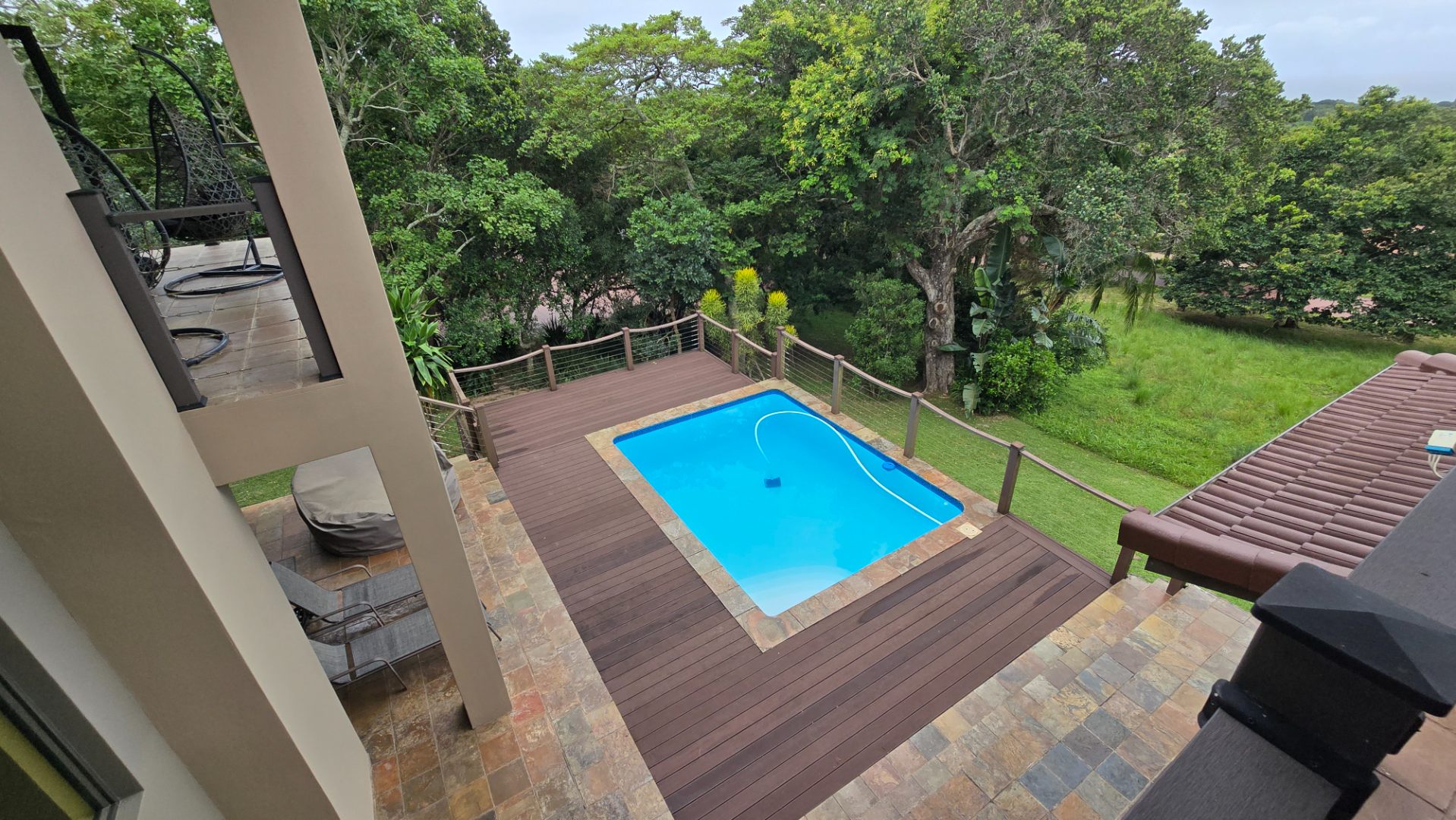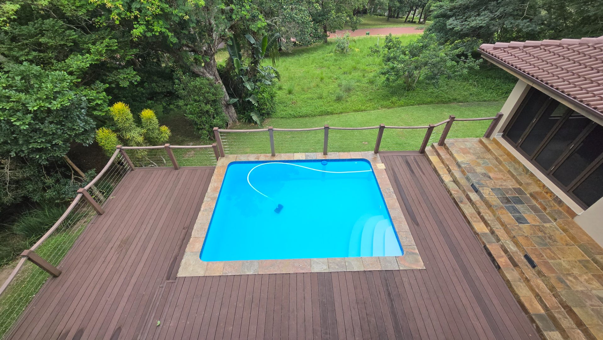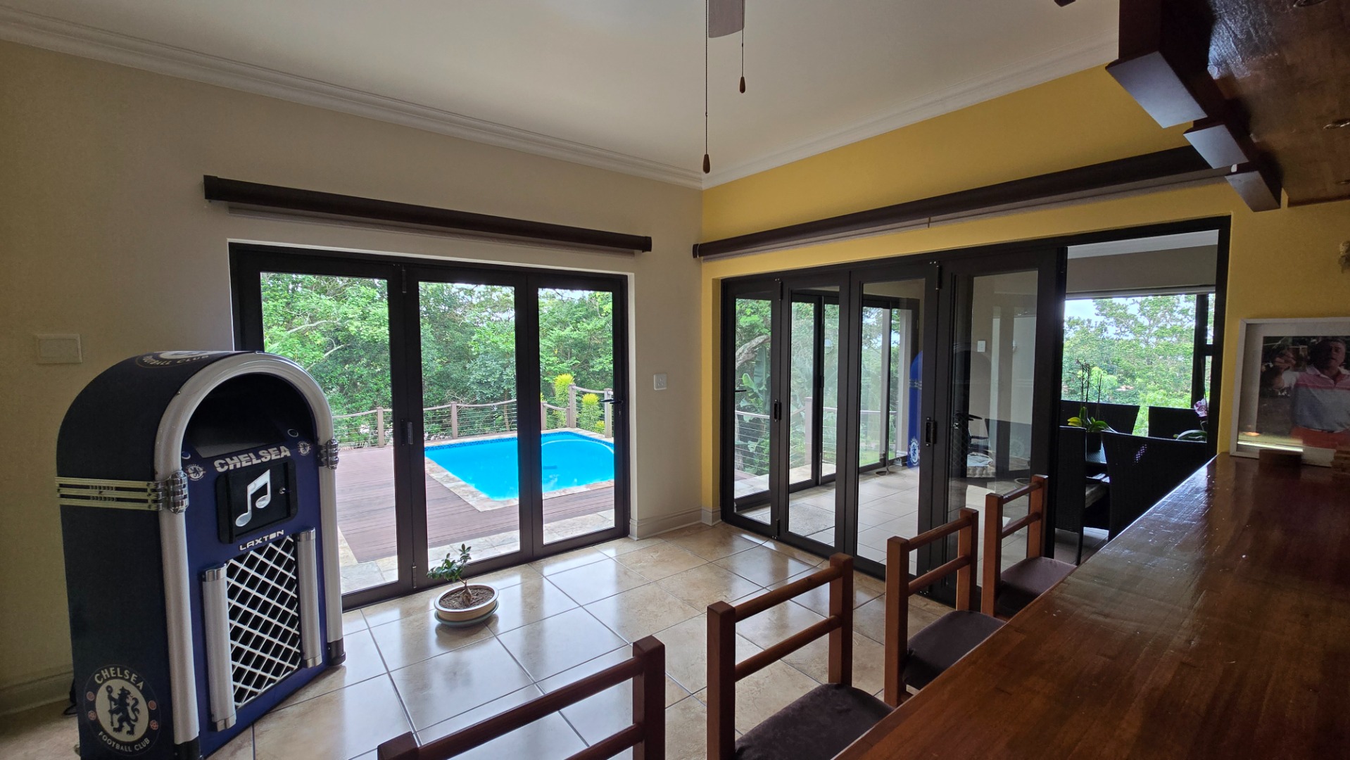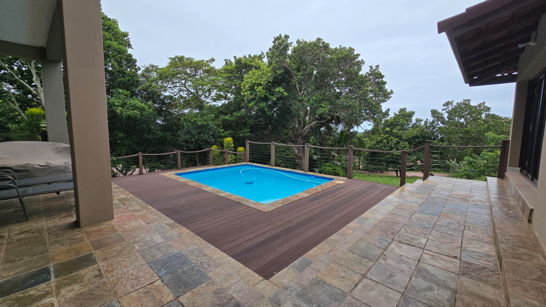 Outdoor leisure and sustainability are key strengths of this residence. A private swimming pool with an expansive timber deck creates a relaxed, resort-style environment, complemented by additional secure storage positioned beneath the deck for outdoor and leisure equipment. The enclosed entertainment and braai room is fitted with Trelliguard Clear Guard windows and features a gas-assisted built-in braai designed to ignite coals with ease, alongside a built-in bar ideal for hosting. The home is exceptionally well-equipped for energy independence, offering solar panels, inverter, and a smart lithium battery system, with all geysers on timers and a generator-ready connection in place. Water security is ensured by two 5,000-litre JoJo tanks, while most windows are secured with louvre-style Trellidor blinds. Set within a 24-hour access-controlled eco-estate with fibre connectivity, the property offers privacy, security, and peace of mind, within close proximity to pristine beaches, championship golf courses, and the natural beauty for which Pennington is increasingly sought after by discerning local and international buyers.