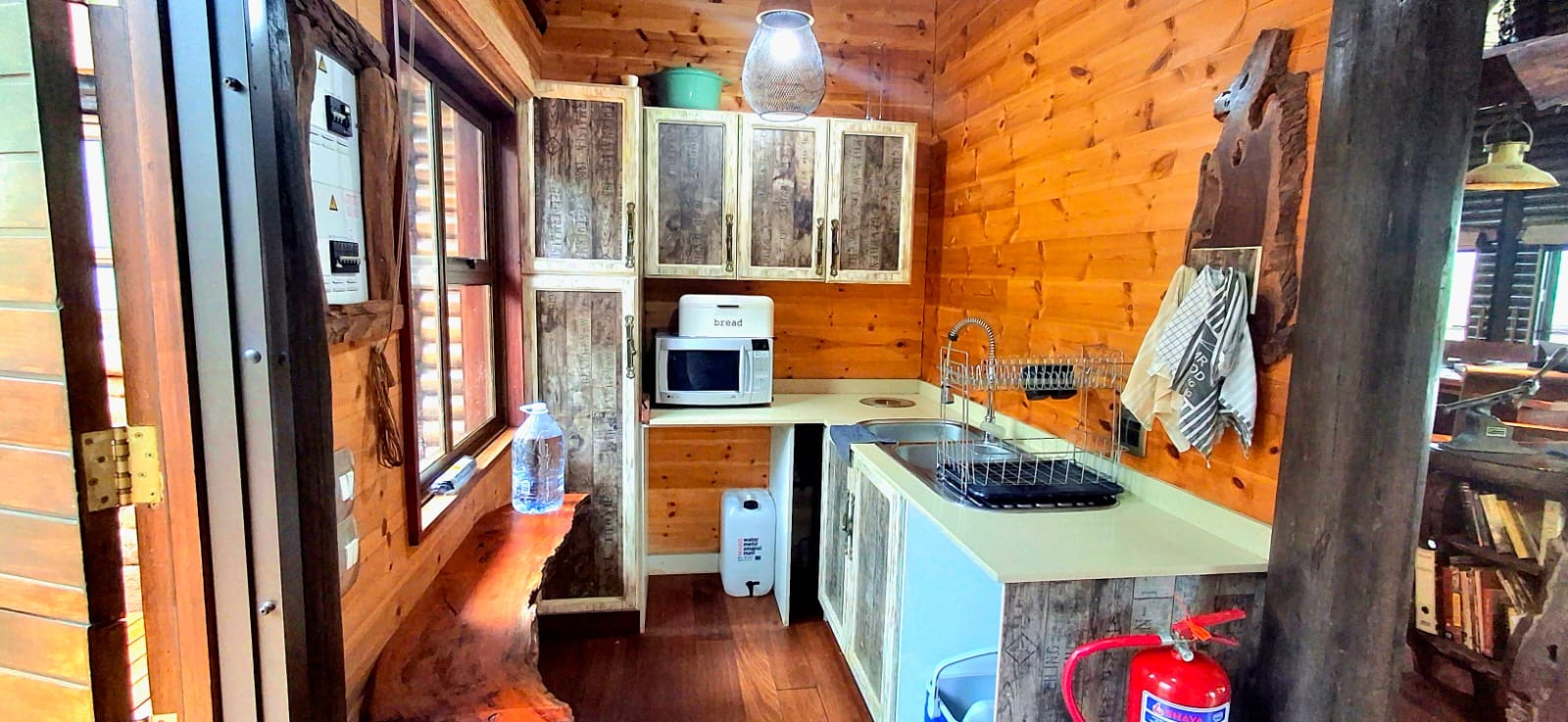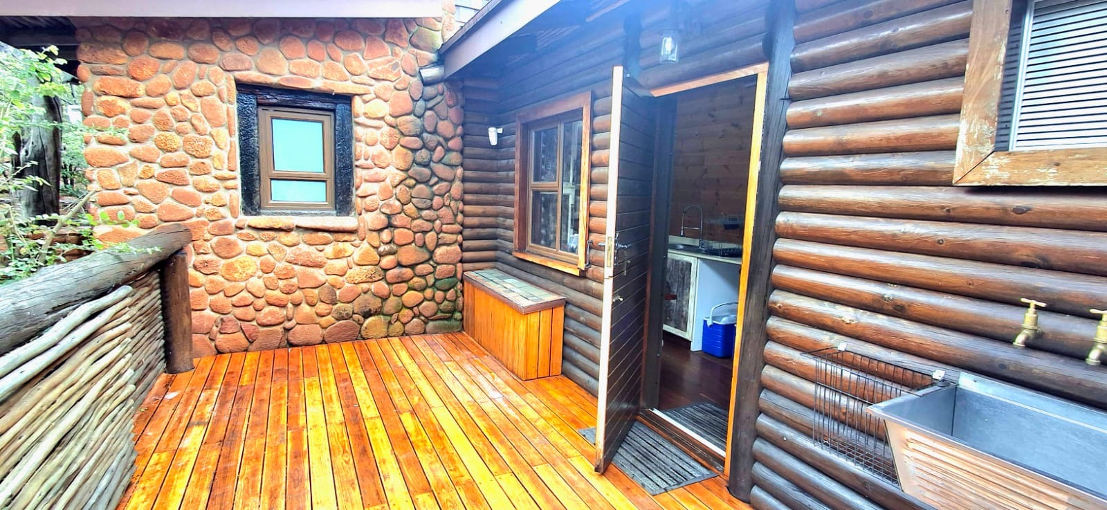 The spacious one-bedroom main house boasts a well-designed open-plan layout with a warm and inviting ambiance. The kitchen, dining, and living areas flow seamlessly together, creating a perfect space for both entertaining and relaxed living. The dining area features a charming indoor fireplace/braai area and a vintage working coal stove, adding rustic charm and character.
