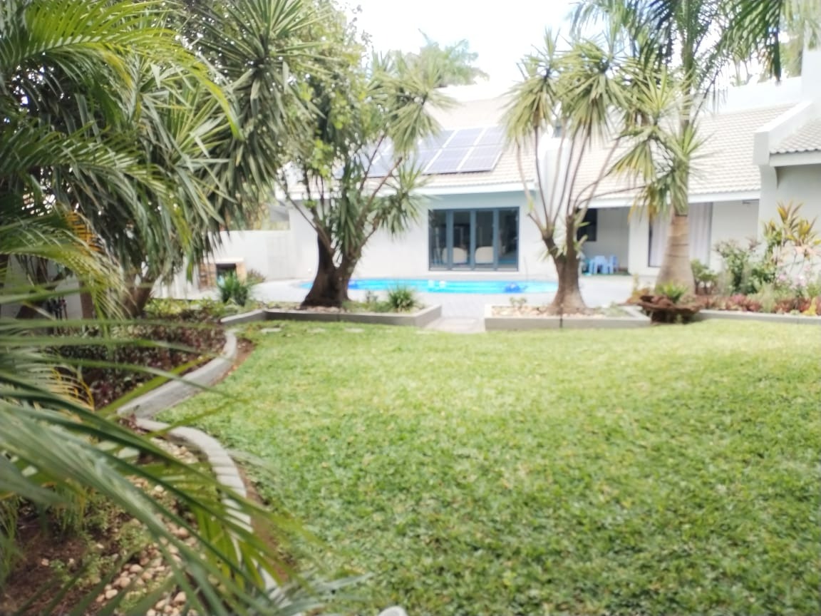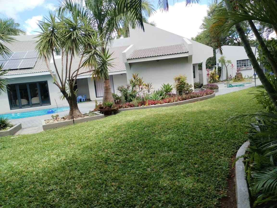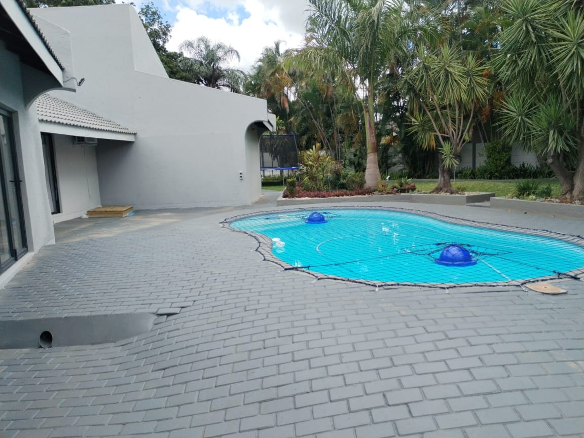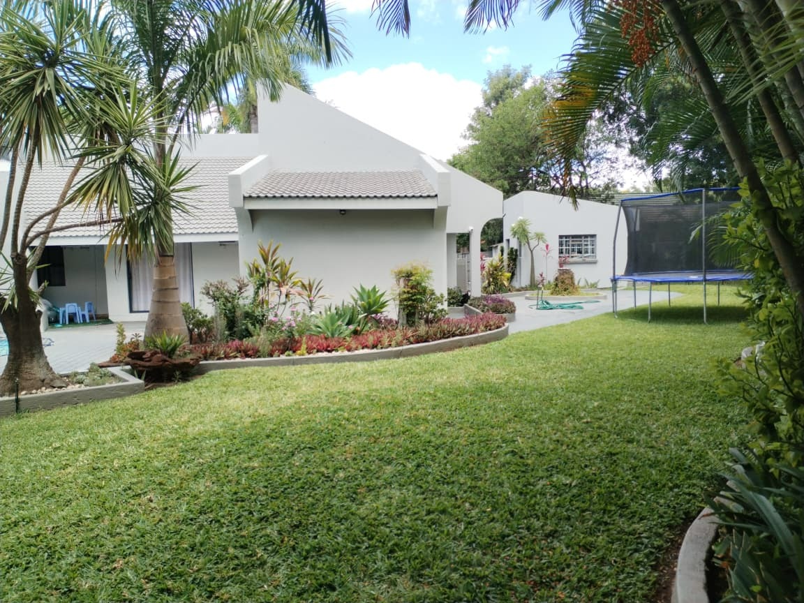 Step outside to an expansive outdoor oasis designed for leisure and entertainment. A clean, irregularly shaped swimming pool, complete with a safety net, is the focal point, surrounded by extensive grey paver patios perfect for sunbathing or al fresco dining. The mature tropical landscaping, including palm trees, and a spacious, well-kept lawn create a serene and private environment. Practical features include a built-in braai for outdoor cooking and two dedicated parking spaces.