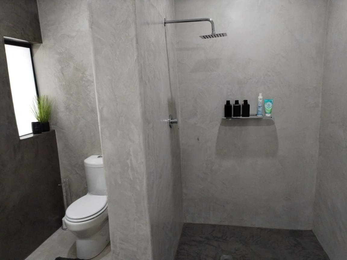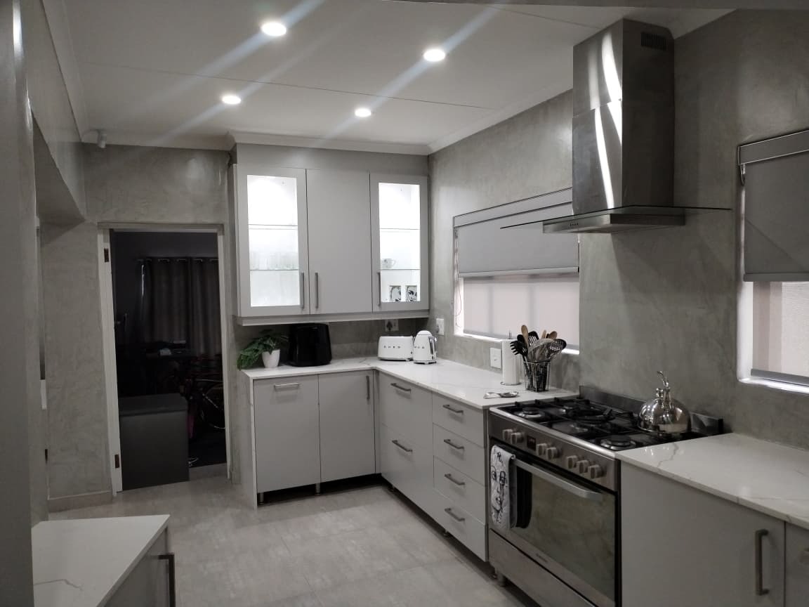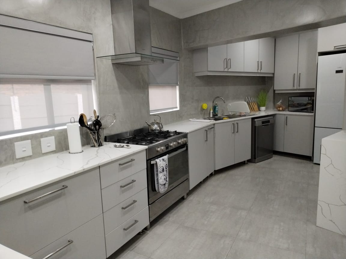 The interior boasts a thoughtfully designed layout, beginning with a bright and modern entryway featuring light grey walls and tiled flooring. The heart of the home is a modern, U-shaped kitchen, a culinary delight equipped with sleek grey cabinetry, pristine white quartz countertops, and a suite of stainless steel appliances including a gas stove, oven, extractor hood, dishwasher, and a large refrigerator. Concrete-effect walls add a contemporary edge, while ample storage and good natural light ensure functionality. The property also includes a dedicated dining room and a comfortable lounge, providing versatile spaces for relaxation and entertaining.