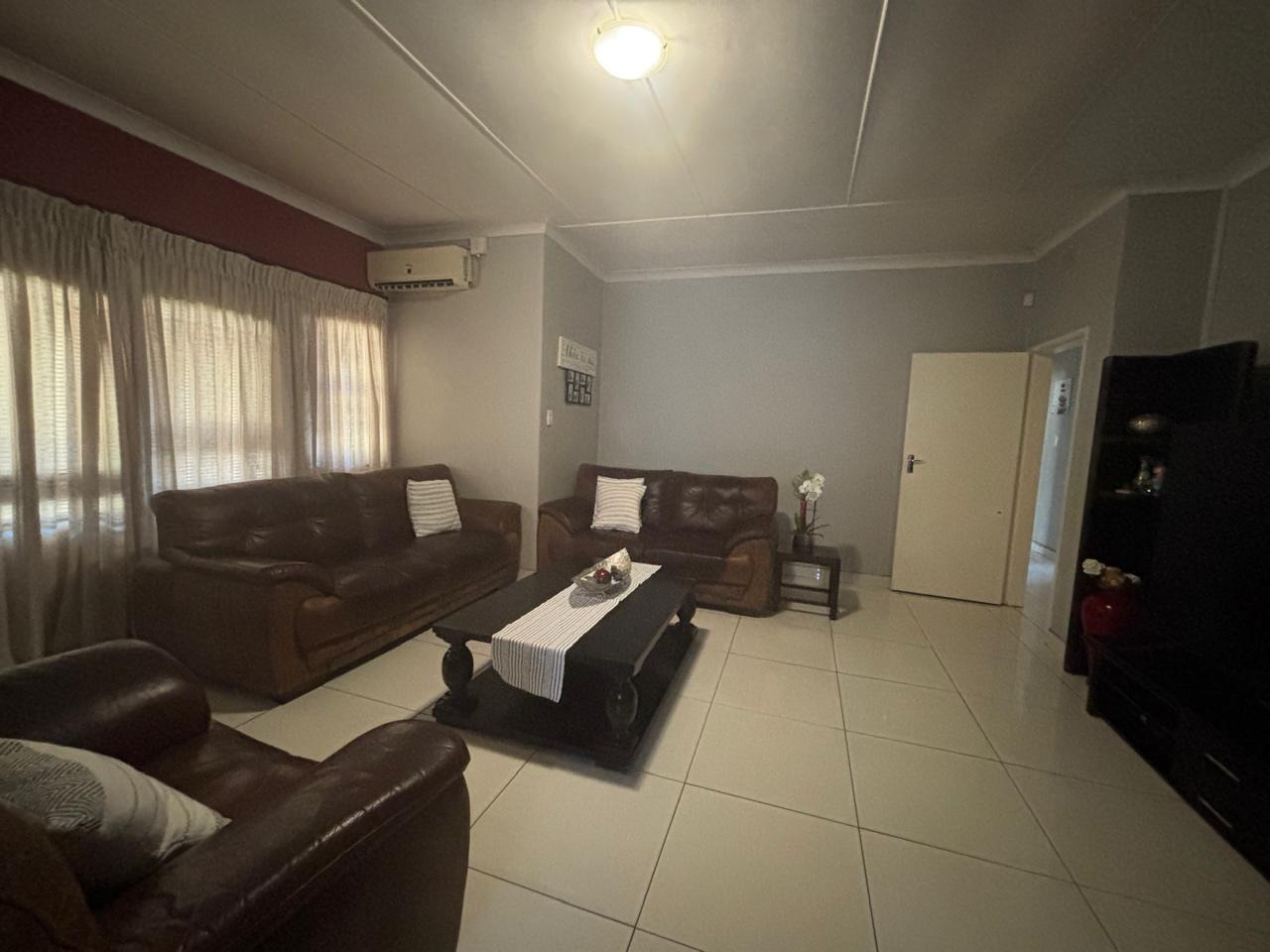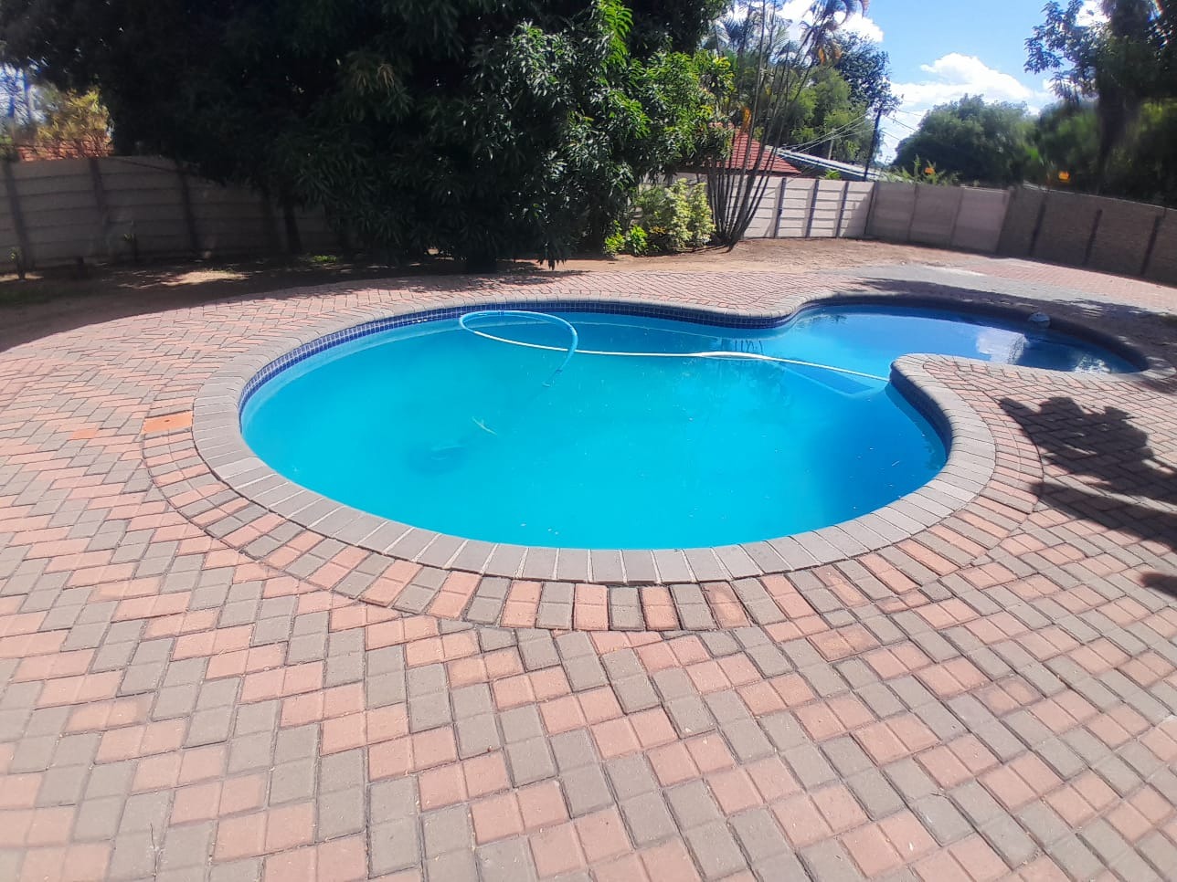 Accommodation comprises of four comfortable bedrooms with ample natural light and air-conditioning system for optimal comfort., with two benefiting from private en-suite bathrooms, alongside a convenient guest toilet. The property's outdoor amenities are equally impressive, centered around a large, clean kidney-shaped swimming pool surrounded by attractive red brick paving, perfect for leisure and entertaining. A Lapa and built-in braai further enhance the outdoor living experience, all set within a well-maintained garden featuring an irrigation system and a pressured pump water tank for self sufficient water supply.