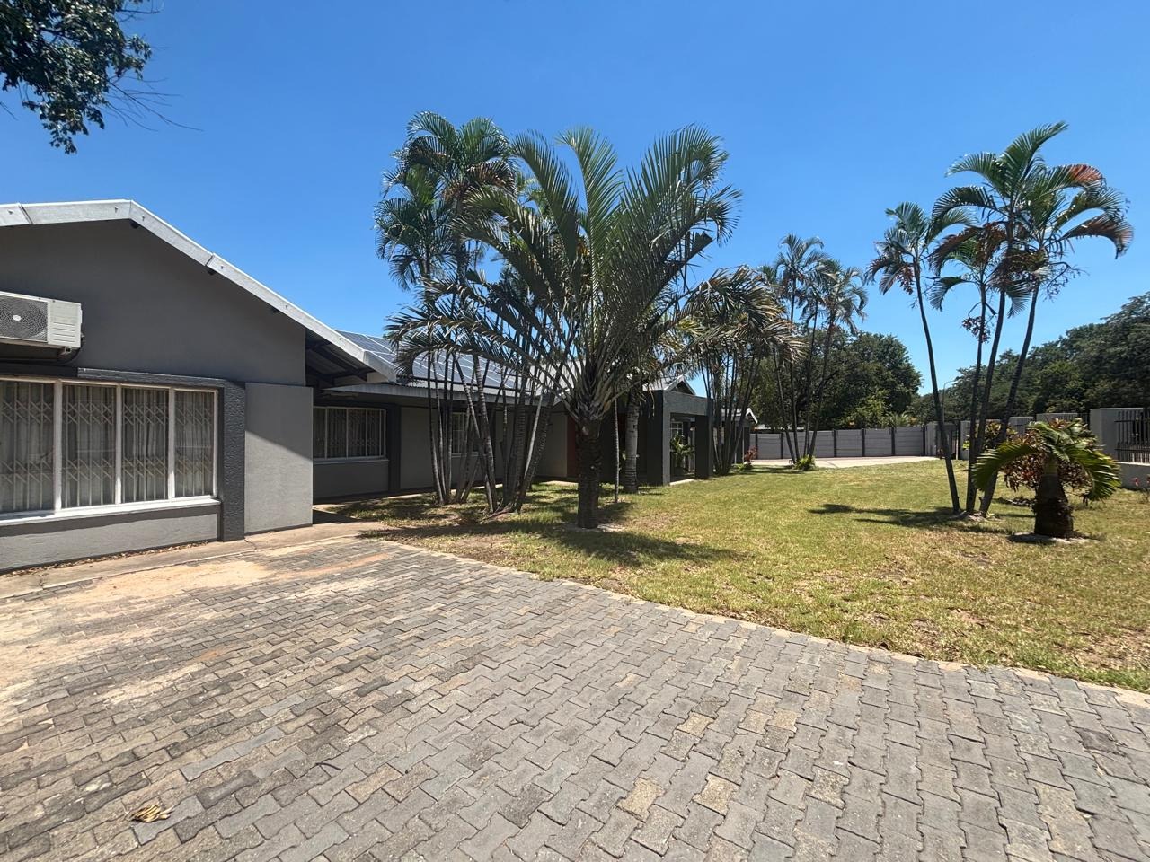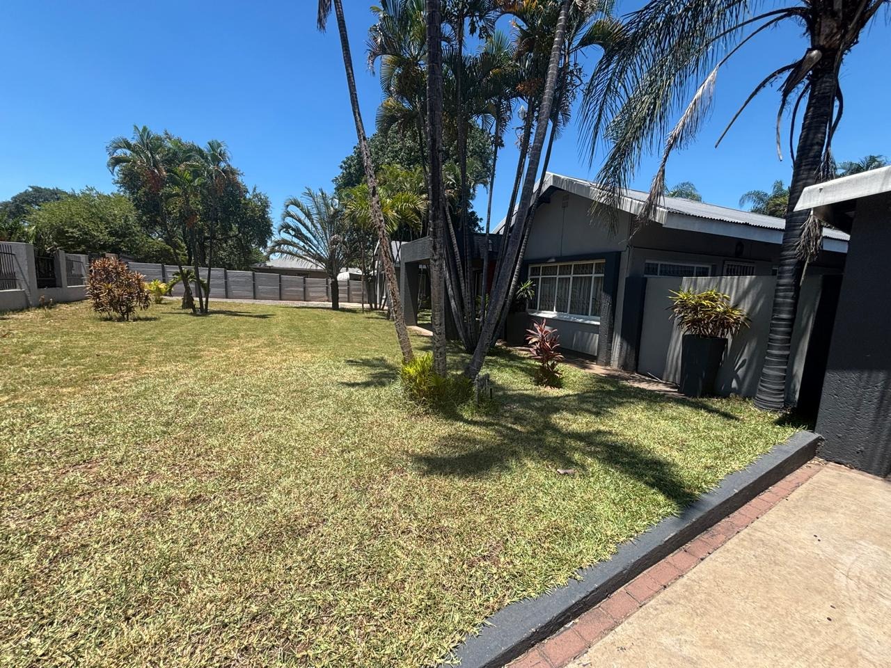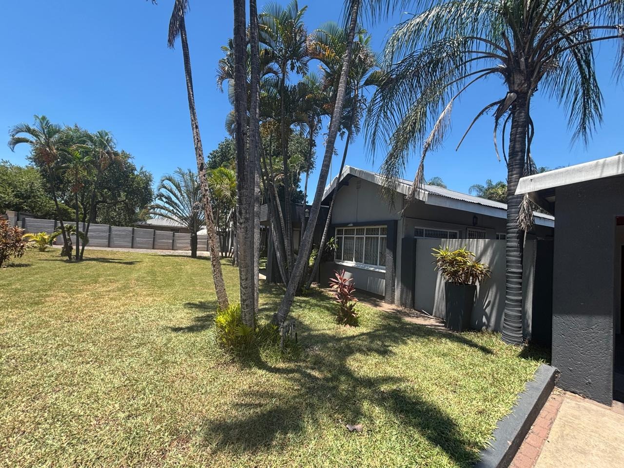 Welcome to this breathtaking property perfectly situated on 1636m2 land, ideal for outdoor activities or future expansion, on a desirable area with easy access to shops, restaurants and offices. It is perfect for families or individuals seeking space and security. Private and secure, discover this exceptional four-bedroom, three-bathroom residence located in the vibrant city of Phalaborwa. This modern single-story home immediately impresses with its contemporary grey and dark grey exterior, complemented by a well-maintained, lush green lawn and mature palm trees that add a tropical aesthetic. A clean concrete driveway leads to the entrance, setting a welcoming tone for this secure property.