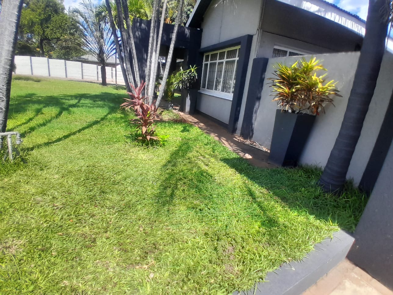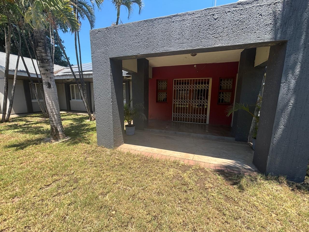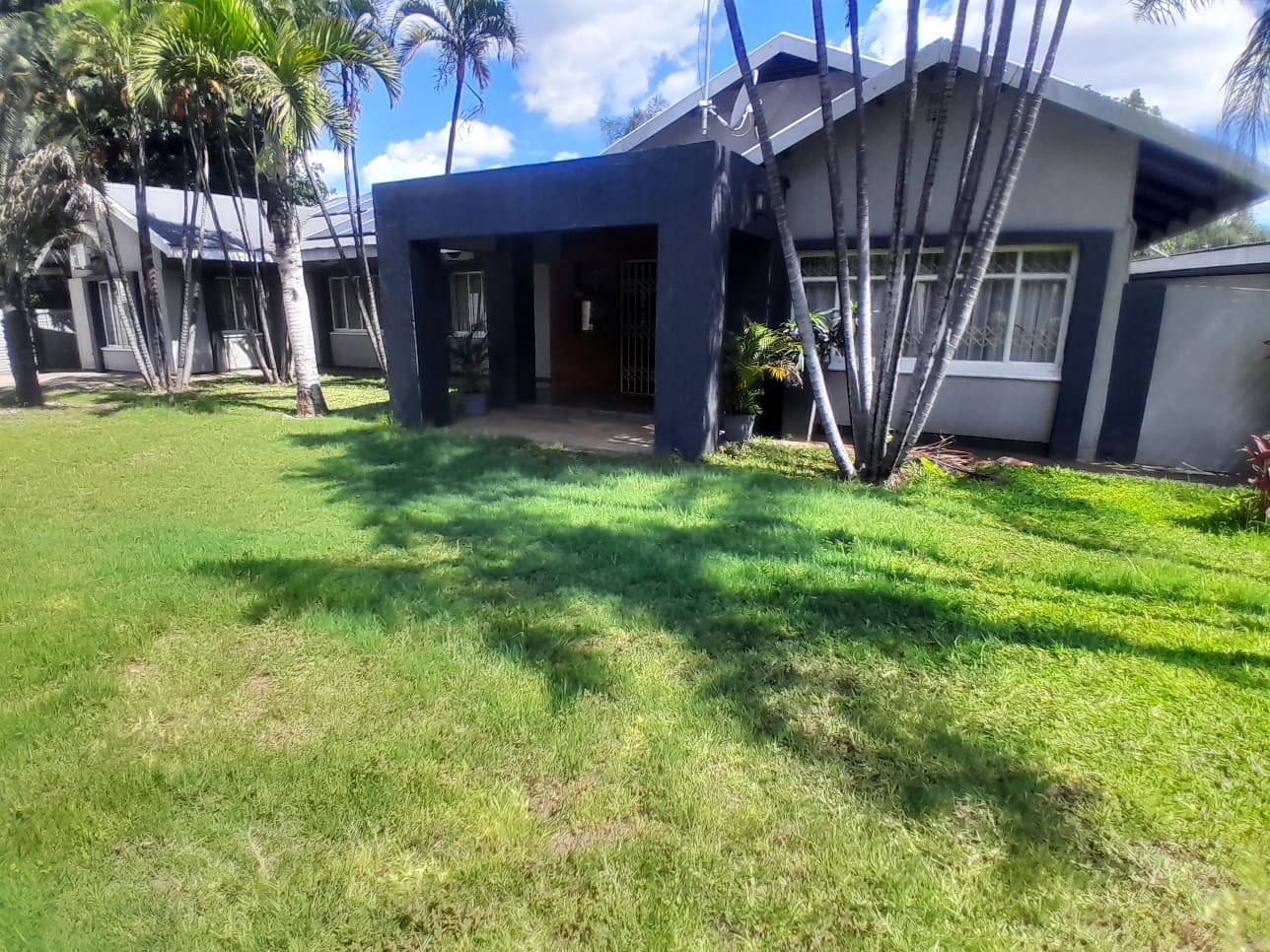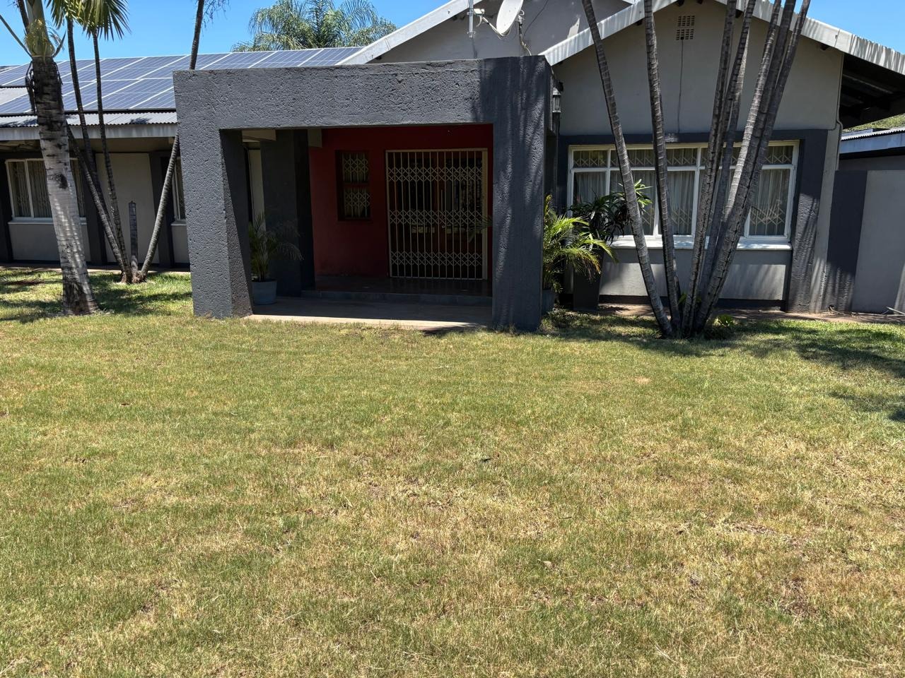 Welcome to this breathtaking property perfectly situated on 1636m2 land, ideal for outdoor activities or future expansion, on a desirable area with easy access to shops, restaurants and offices. It is perfect for families or individuals seeking space and security. Private and secure, discover this exceptional four-bedroom, three-bathroom residence located in the vibrant city of Phalaborwa. This modern single-story home immediately impresses with its contemporary grey and dark grey exterior, complemented by a well-maintained, lush green lawn and mature palm trees that add a tropical aesthetic. A clean concrete driveway leads to the entrance, setting a welcoming tone for this secure property.