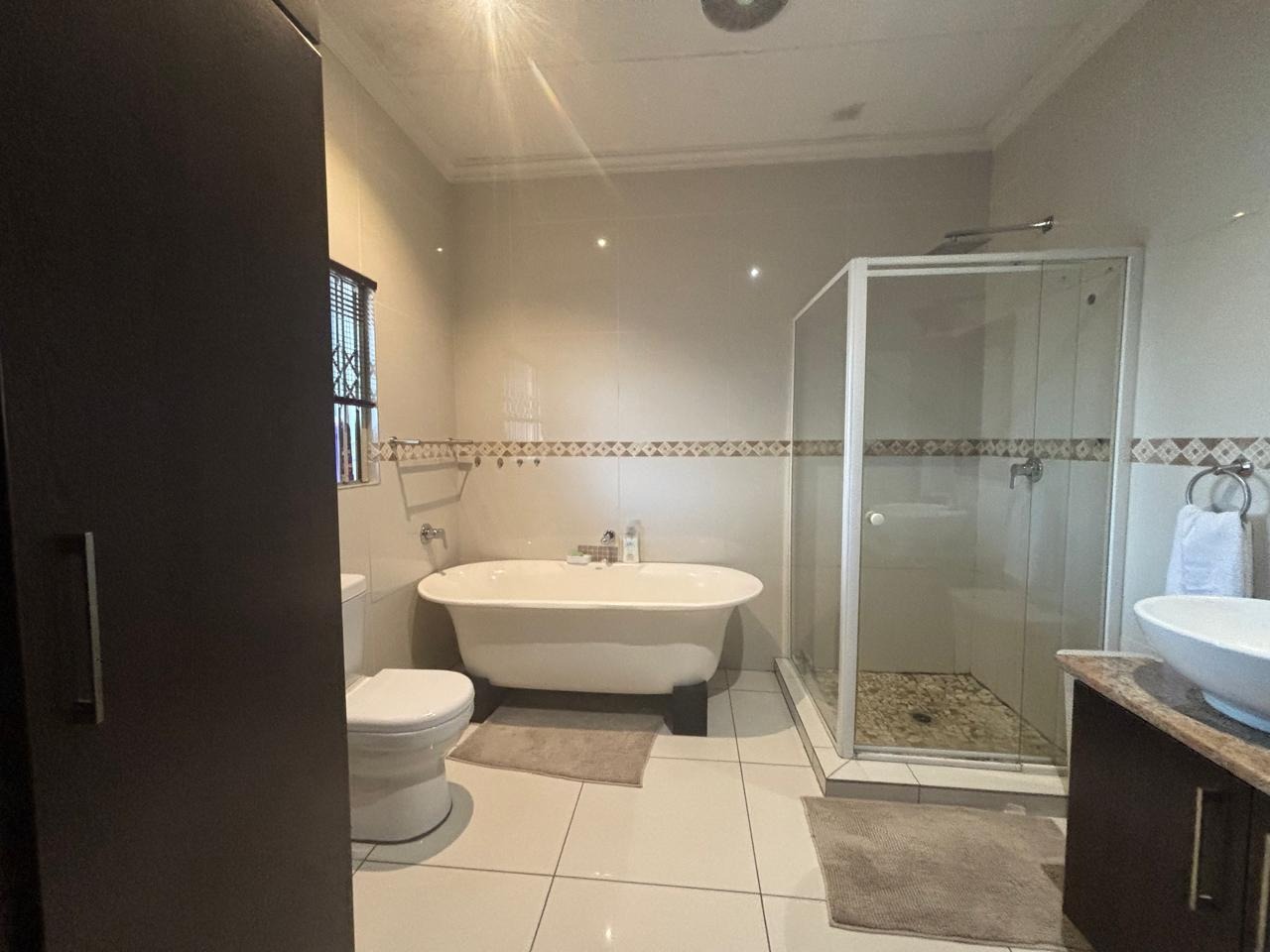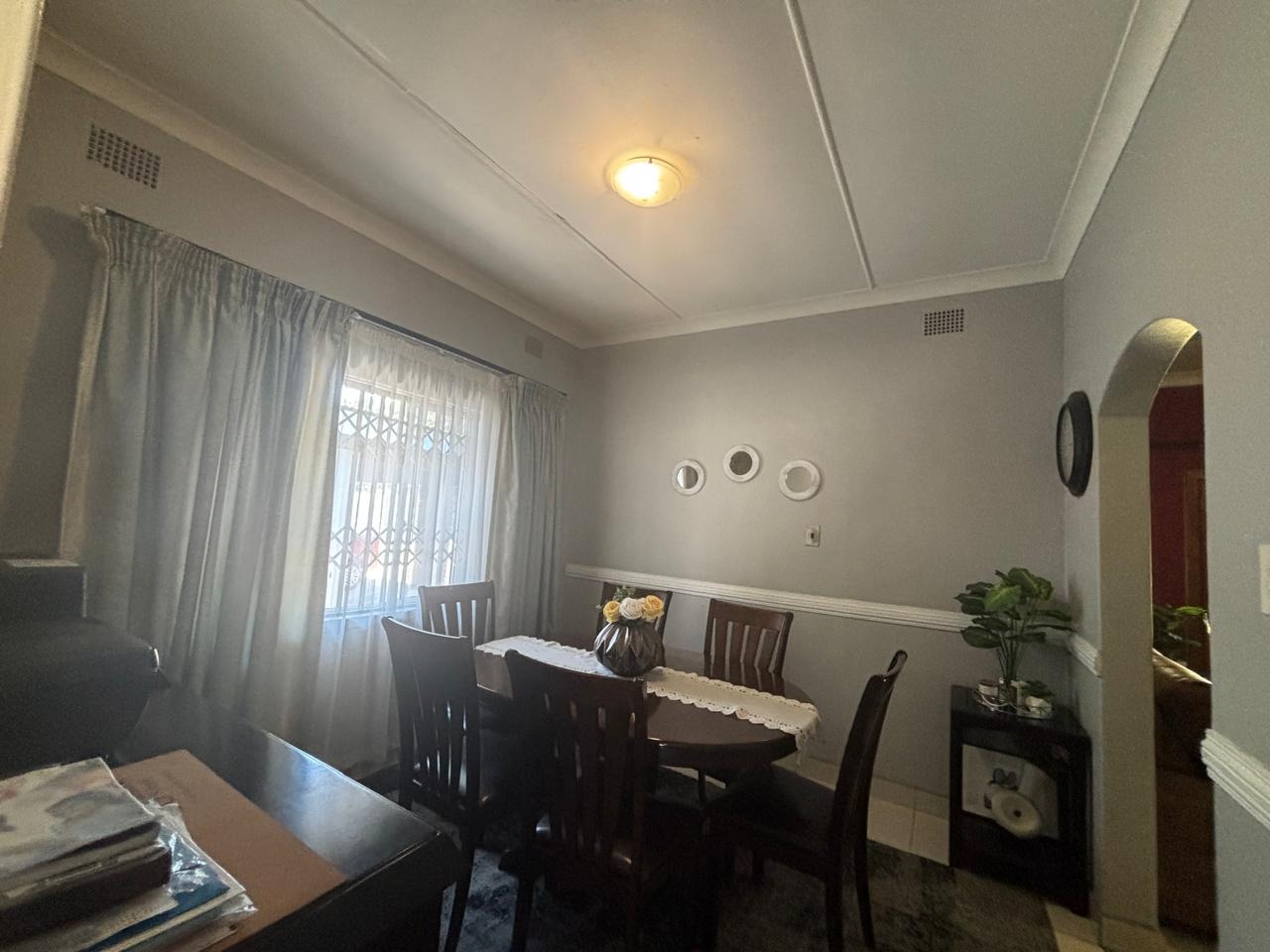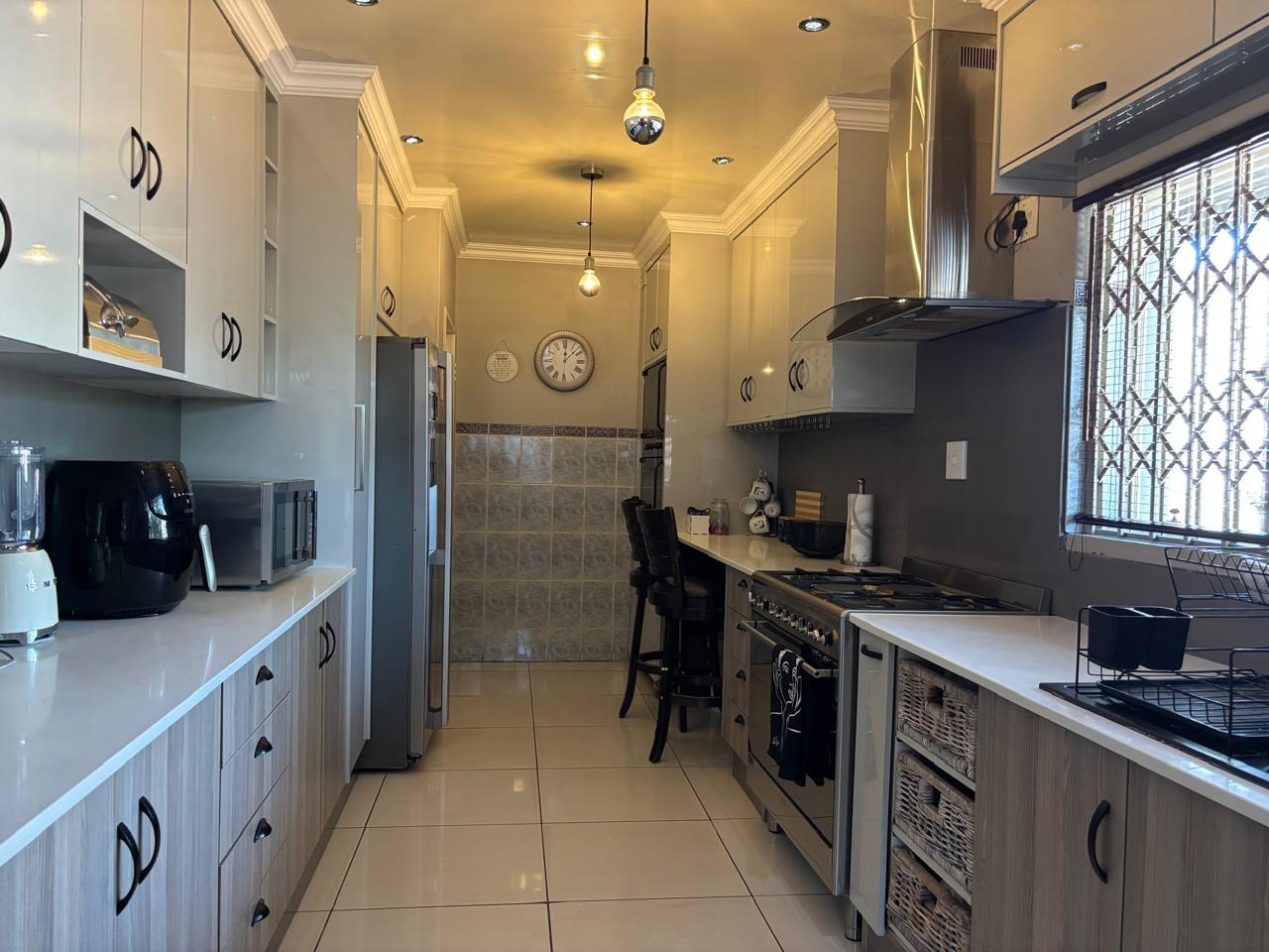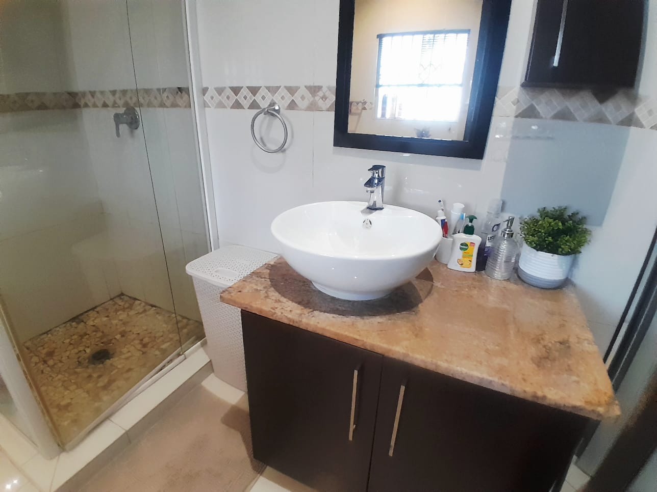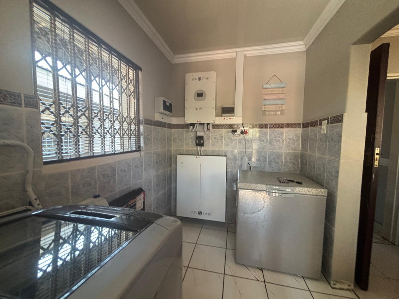 This home is equipped with advanced security and sustainability features, including a robust 16x 590 Canadian solar panels and a 10 kW Sunsynk inventor, 16kWh Sunsynk battery inverter system for energy independence. Security is paramount with an alarm system, electric fencing, CCTV, Trellidoor burglar bars, surrounding walls and motorized security gates. Parking is generous, offering two motorized garages and six additional open parking spaces for visitors. Practical additions include domestic room, a laundry room near the kitchen, storage, and a Wendy house, ensuring every need is met. Wi-Fi connectivity is also available.