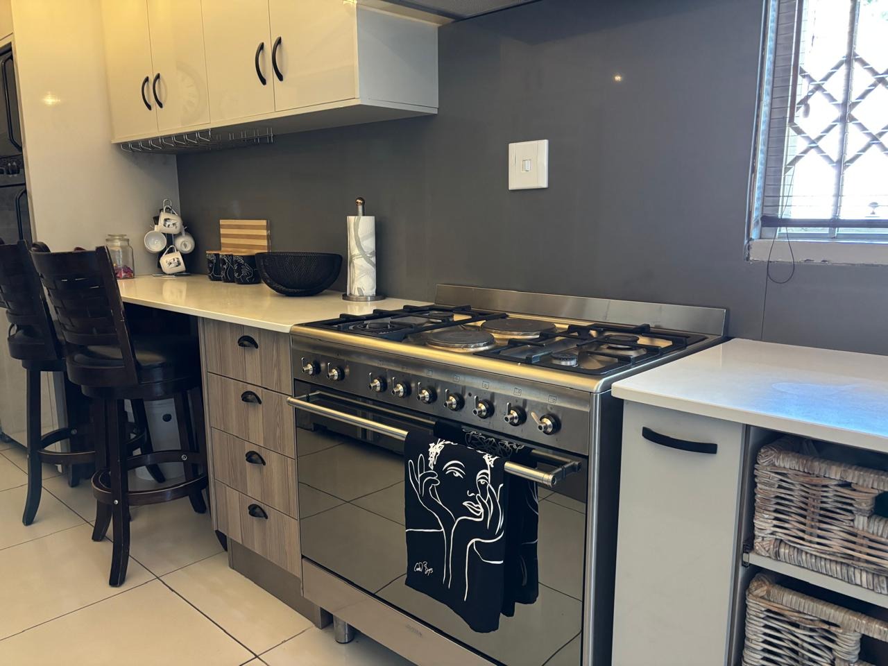The modern kitchen shines with high gloss wood cabinets bathed in natural light filtered through sleek blinds. Hanging fitting lights illuminate the space, highlighting ample storage and cutting edge appliances. the electric and gas stove offers versatile cooking options, paired with an eye level electric oven for effortless meal prep. New modern tiles on the floor add a touch of sophistication creating a bright and inviting hub for culinary creativity.