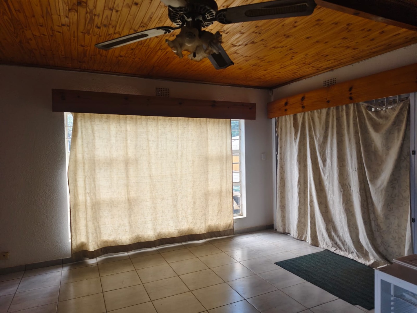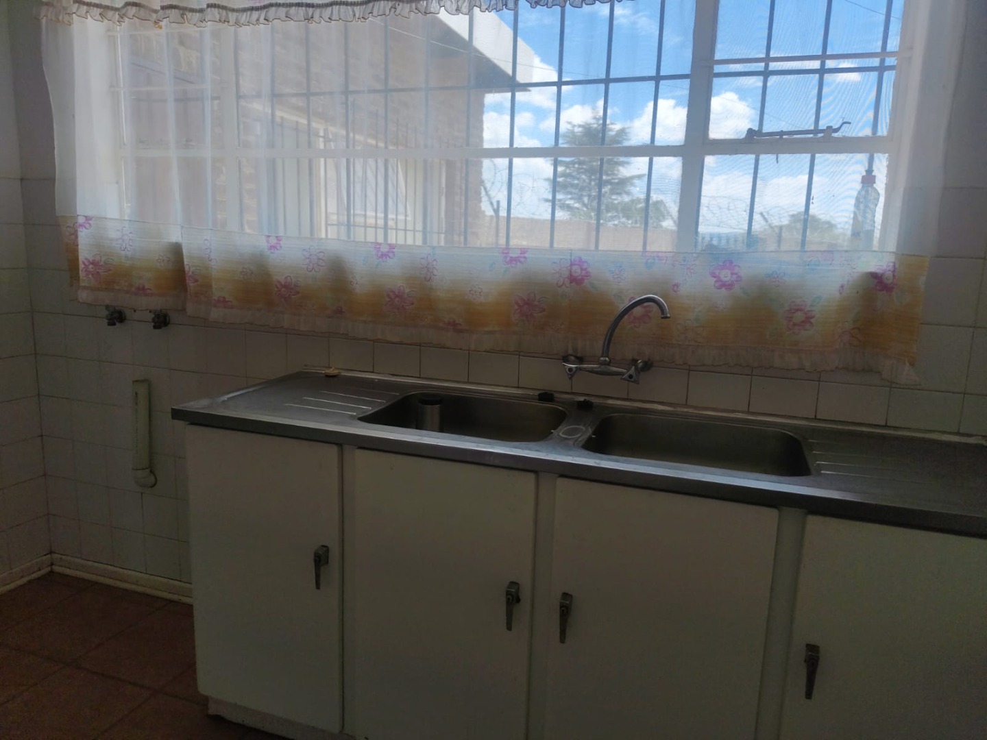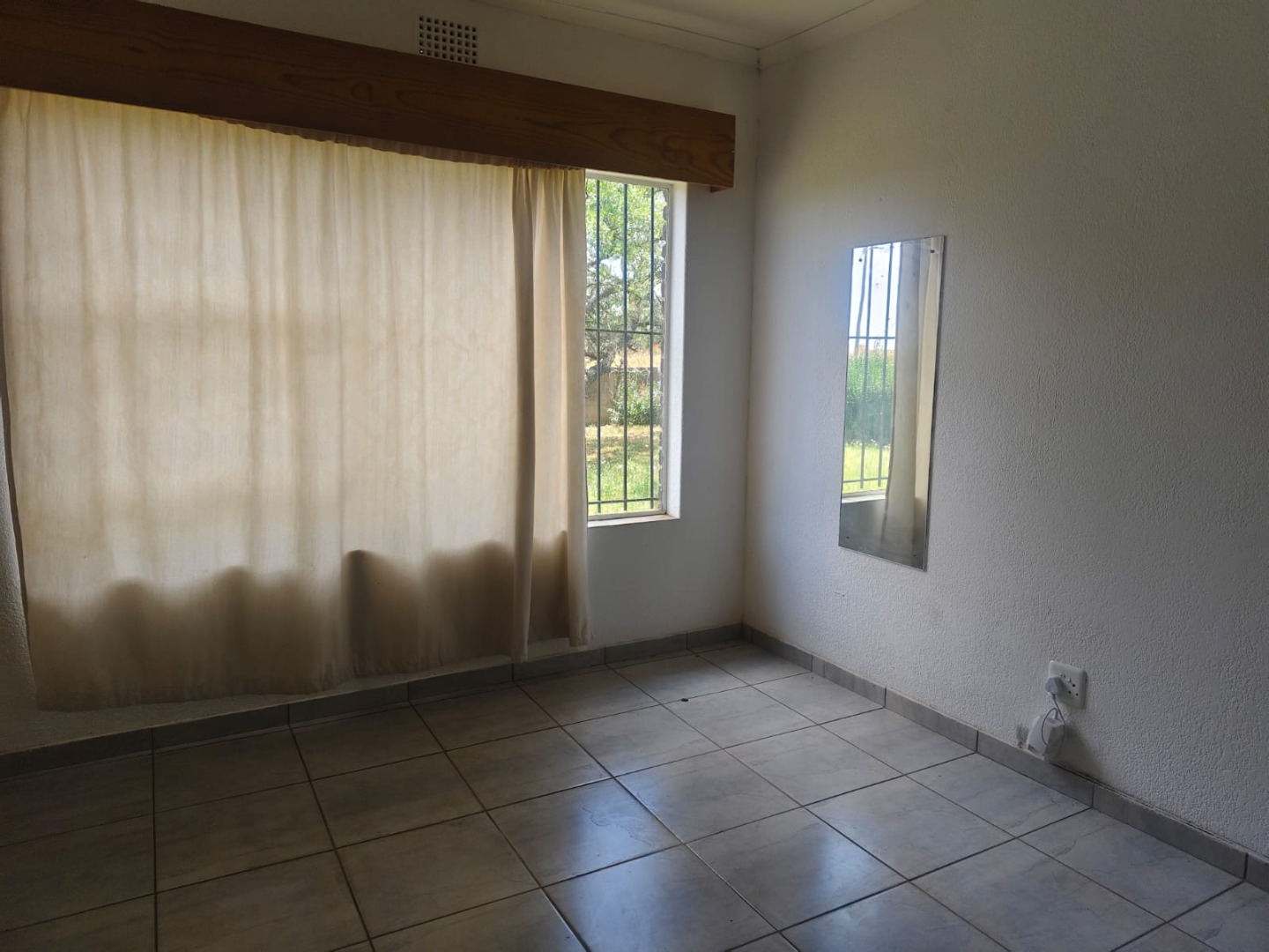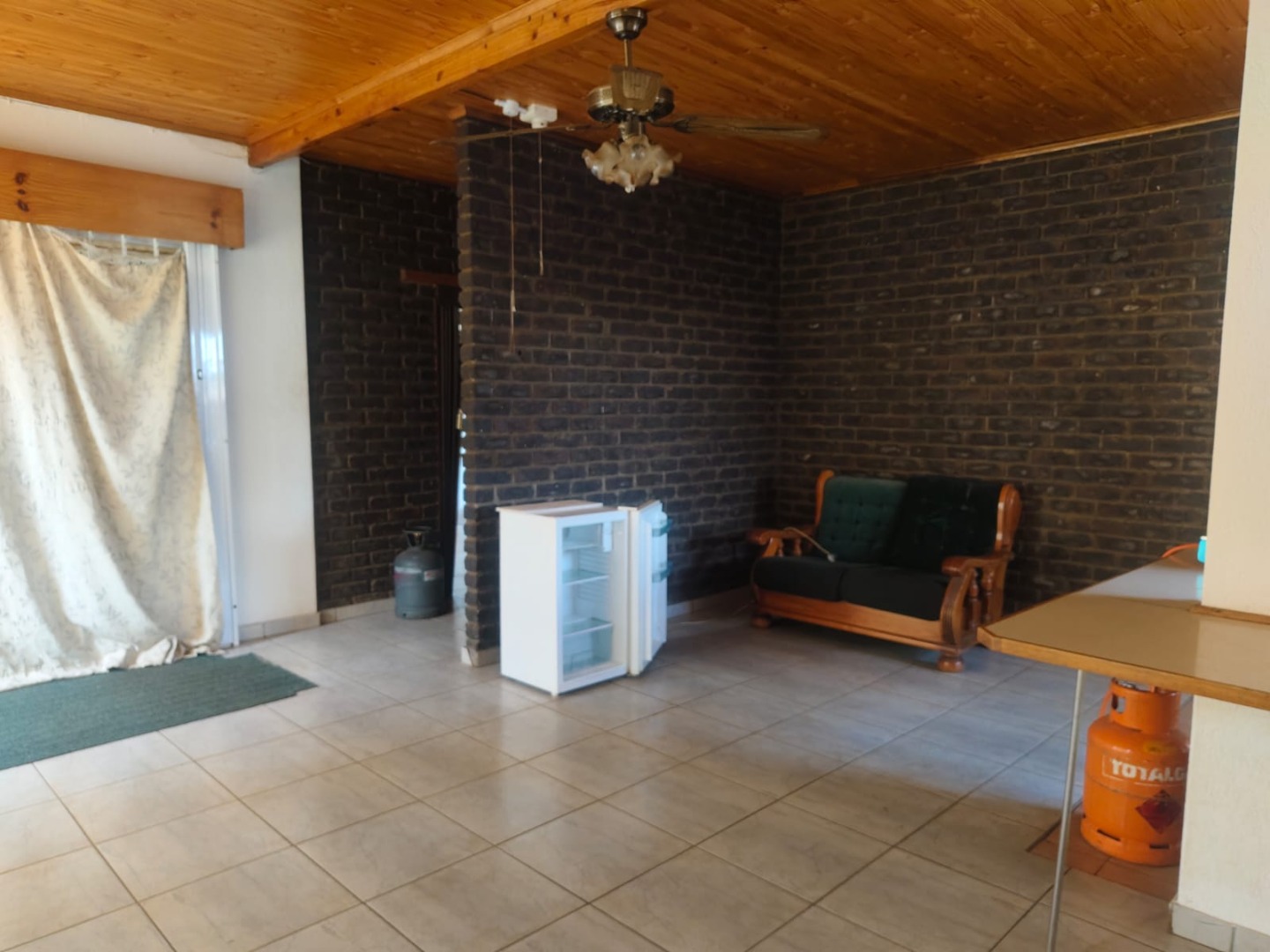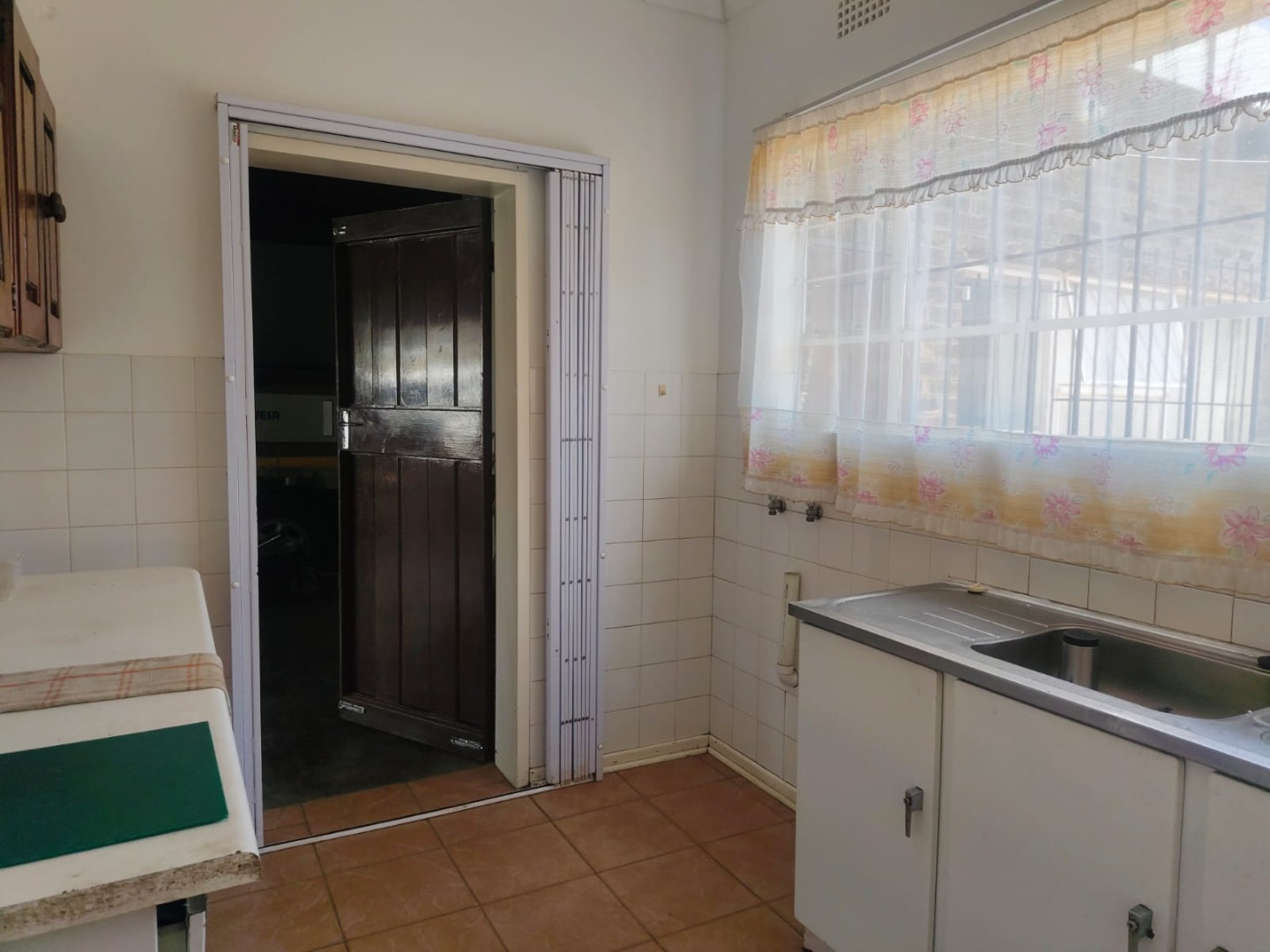 Outdoor amenities include a patio with a built-in braai, perfect for entertaining, and an attached garage. Security is enhanced with an alarm system, burglar bars, and a solar-powered CCTV system. The property also benefits from domestic rooms, outside toilets, and a second house, providing versatile living options. While presenting a dated aesthetic, this home offers a solid foundation for modernization. Pets are welcome.