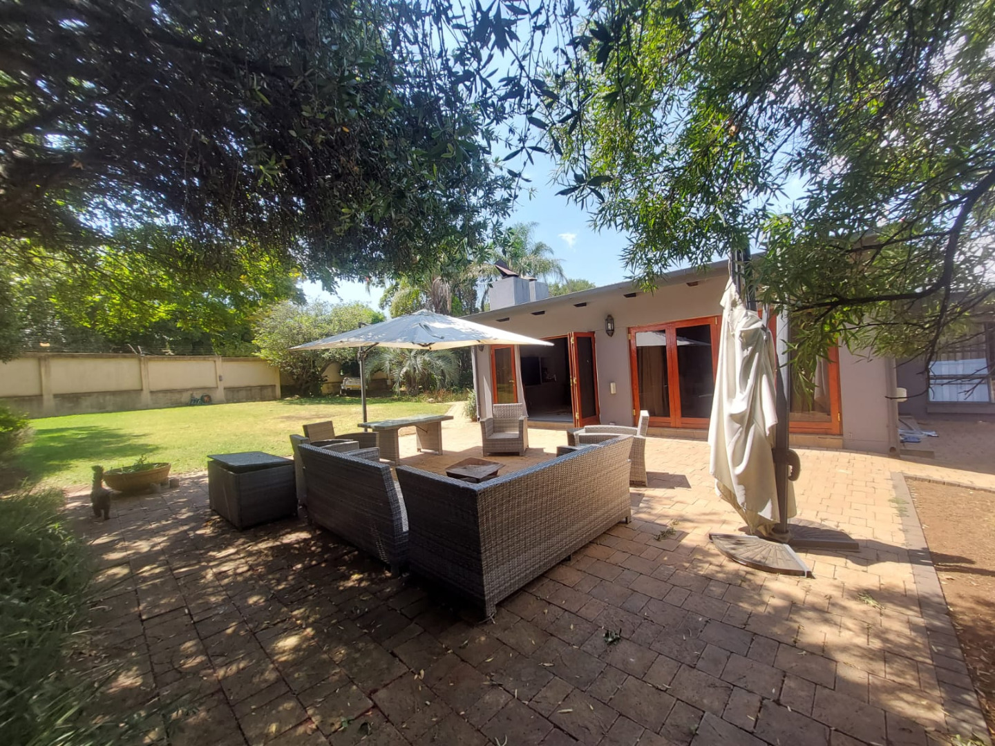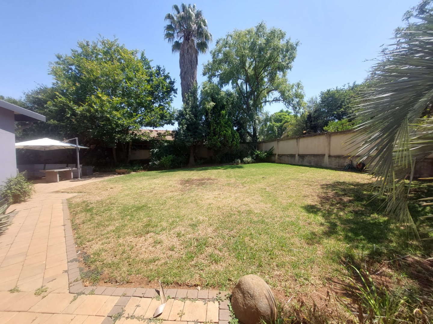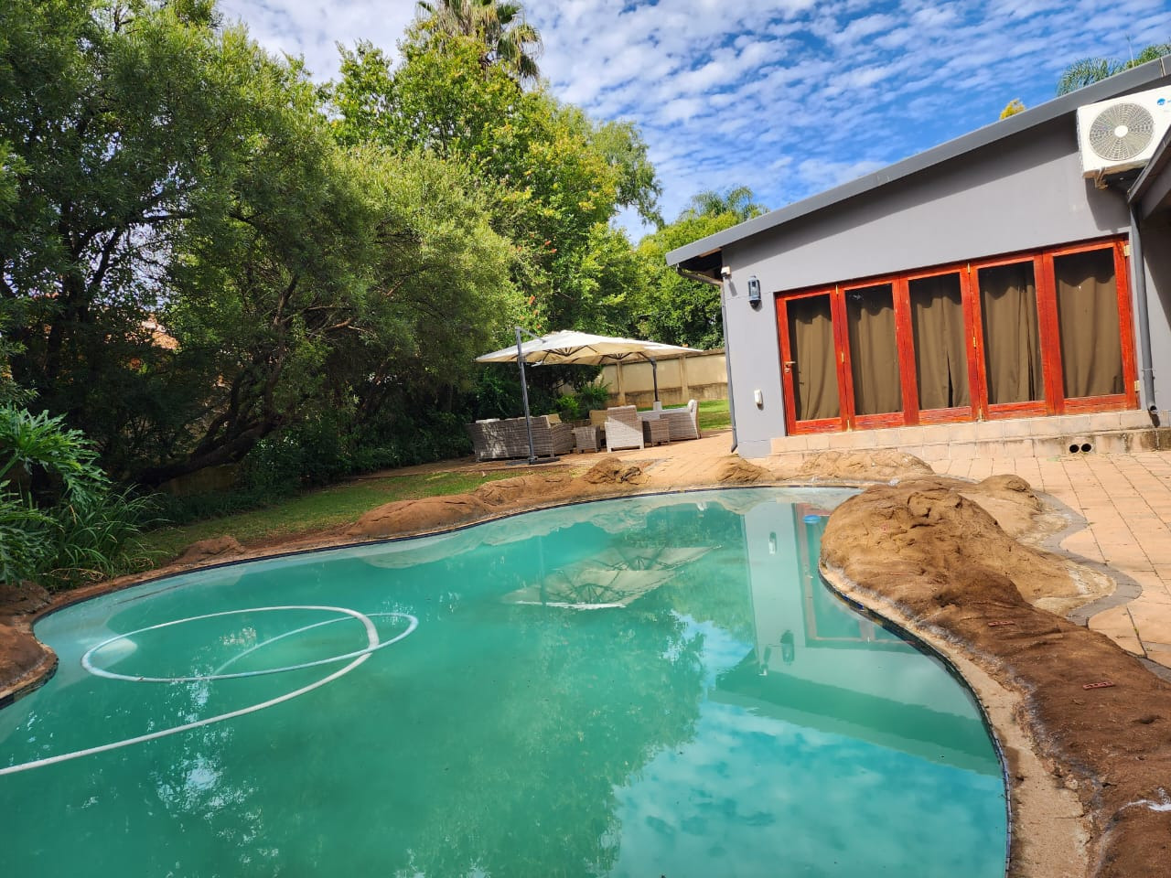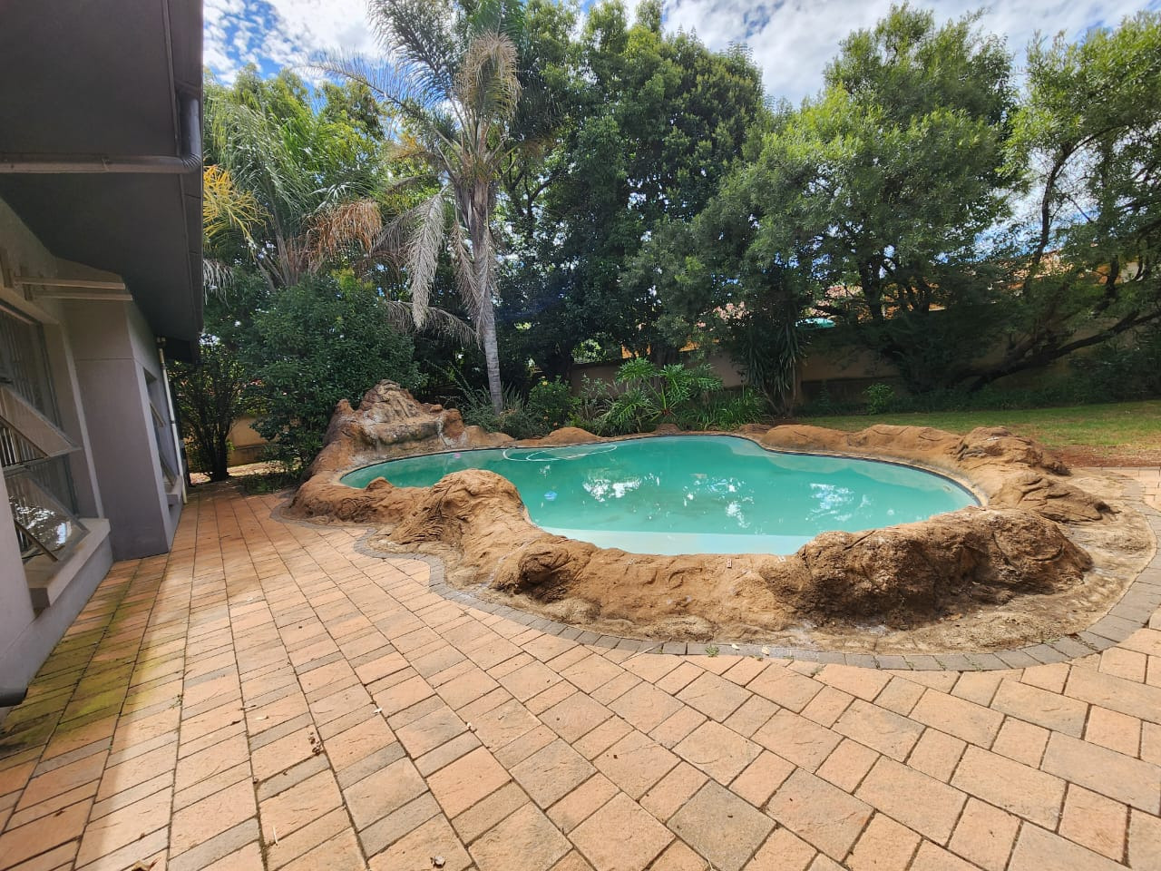 The outdoor areas are a true highlight, designed for both leisure and entertaining. An expansive paved patio, complete with a built-in braai, provides the ideal setting for alfresco dining and social gatherings, seamlessly connecting to the large, private grassy garden. Mature trees throughout the property offer abundant natural shade, enhancing the tranquil ambiance. A kidney-shaped swimming pool, featuring a charming rock-style surround, invites refreshing dips on warm days. The property also benefits from a borehole and an irrigation system, ensuring the lush garden remains vibrant with minimal effort. Vehicle accommodation is well catered for with three garages and additional parking space for four vehicles, all accessible via a secure access gate and paved pathways.