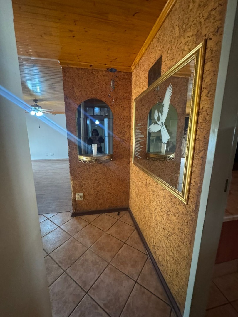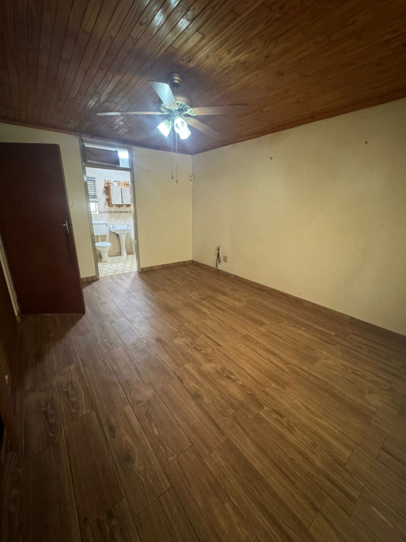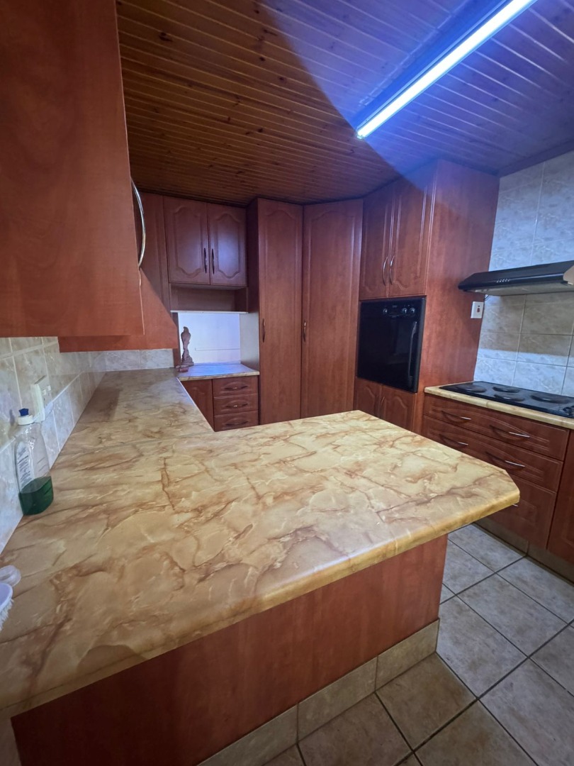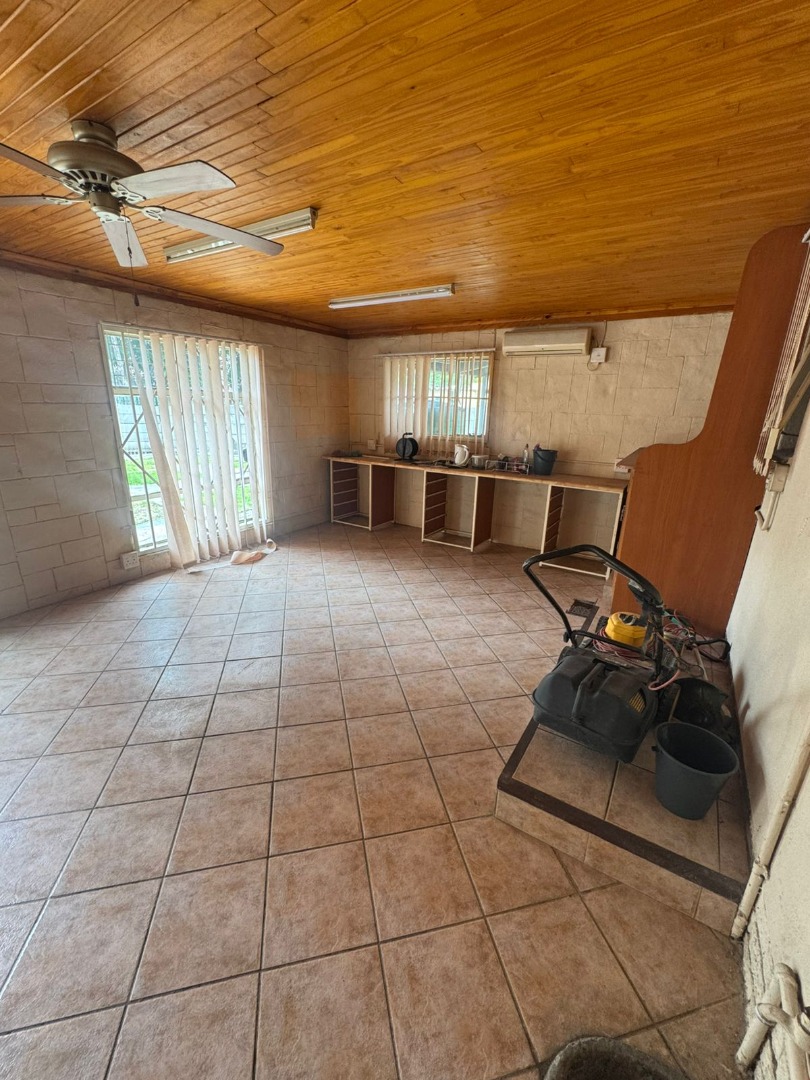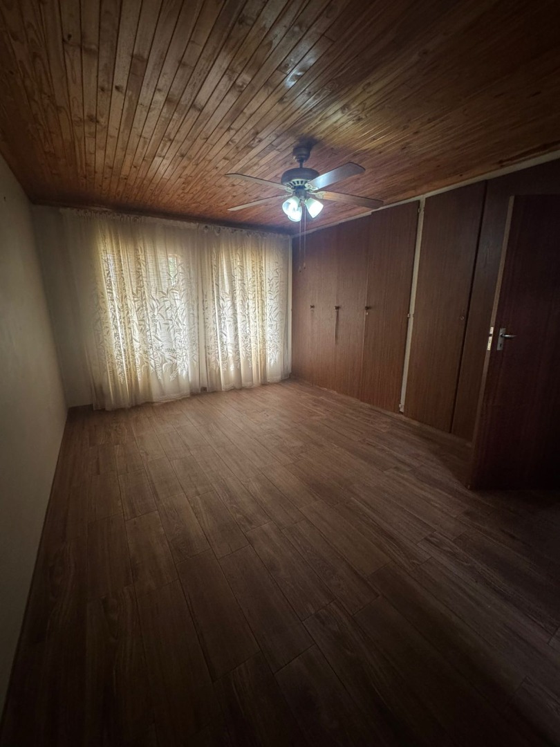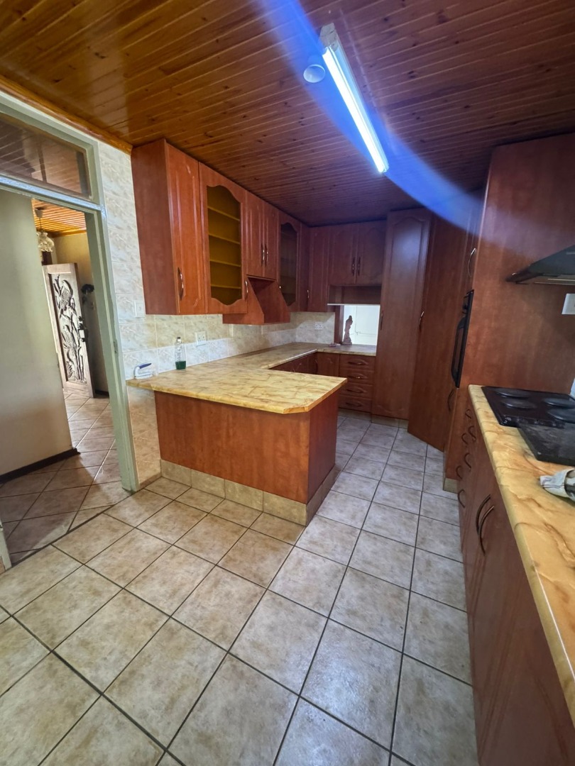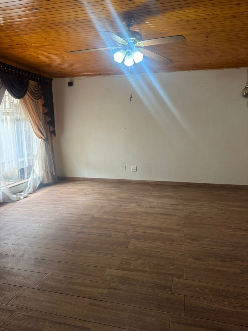 Step inside to discover a home designed for comfortable living. The interior boasts a practical layout with one lounge, a dedicated dining room, and a well-appointed kitchen. Throughout the living areas, you'll find durable wood-look tiled flooring and warm wooden panel ceilings, adding character to the space. Ceiling fans are installed for comfort and air circulation, complementing the natural light from the windows.