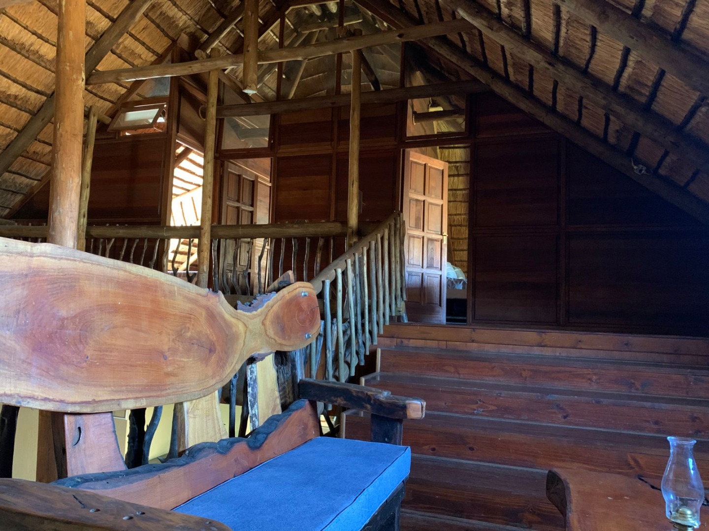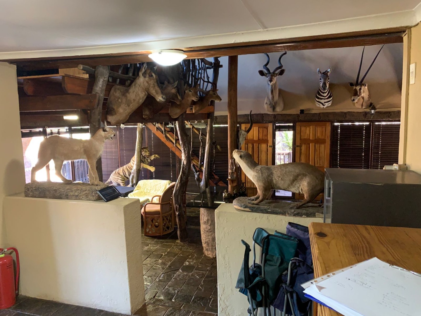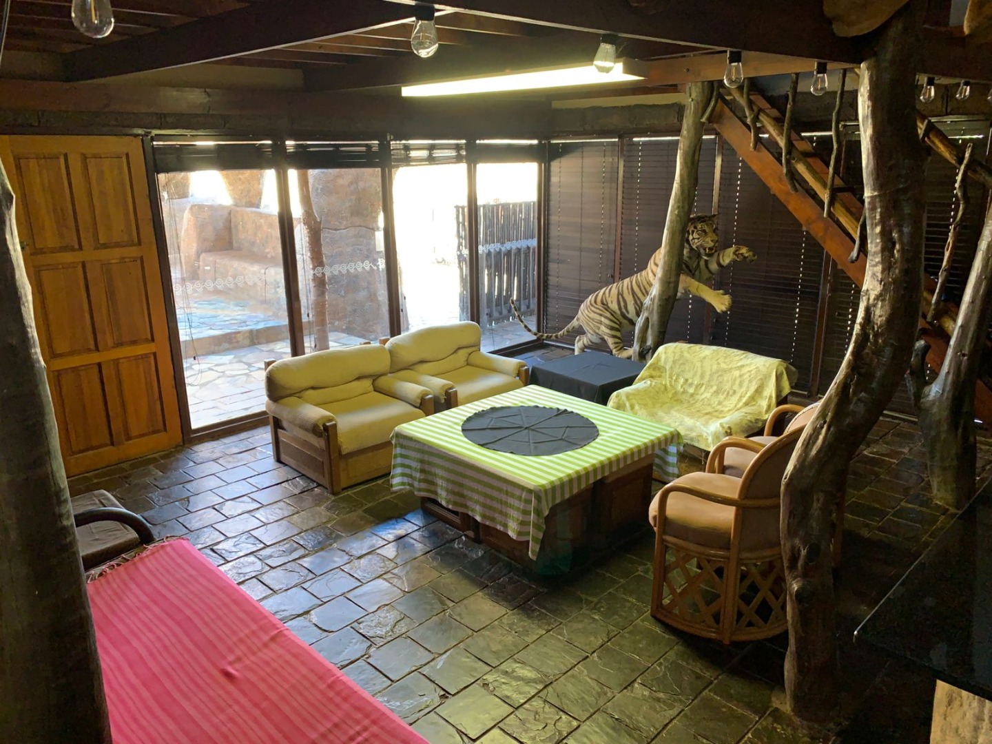 The Lodge has an interesting living area, opening onto an outside jacuzzi, a kitchen, 5 bedrooms and 2 bathrooms.