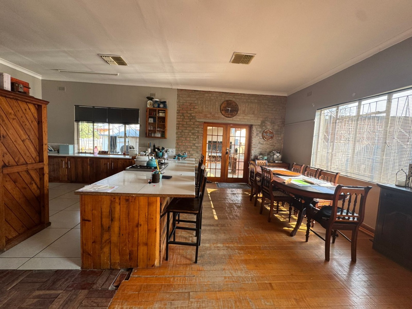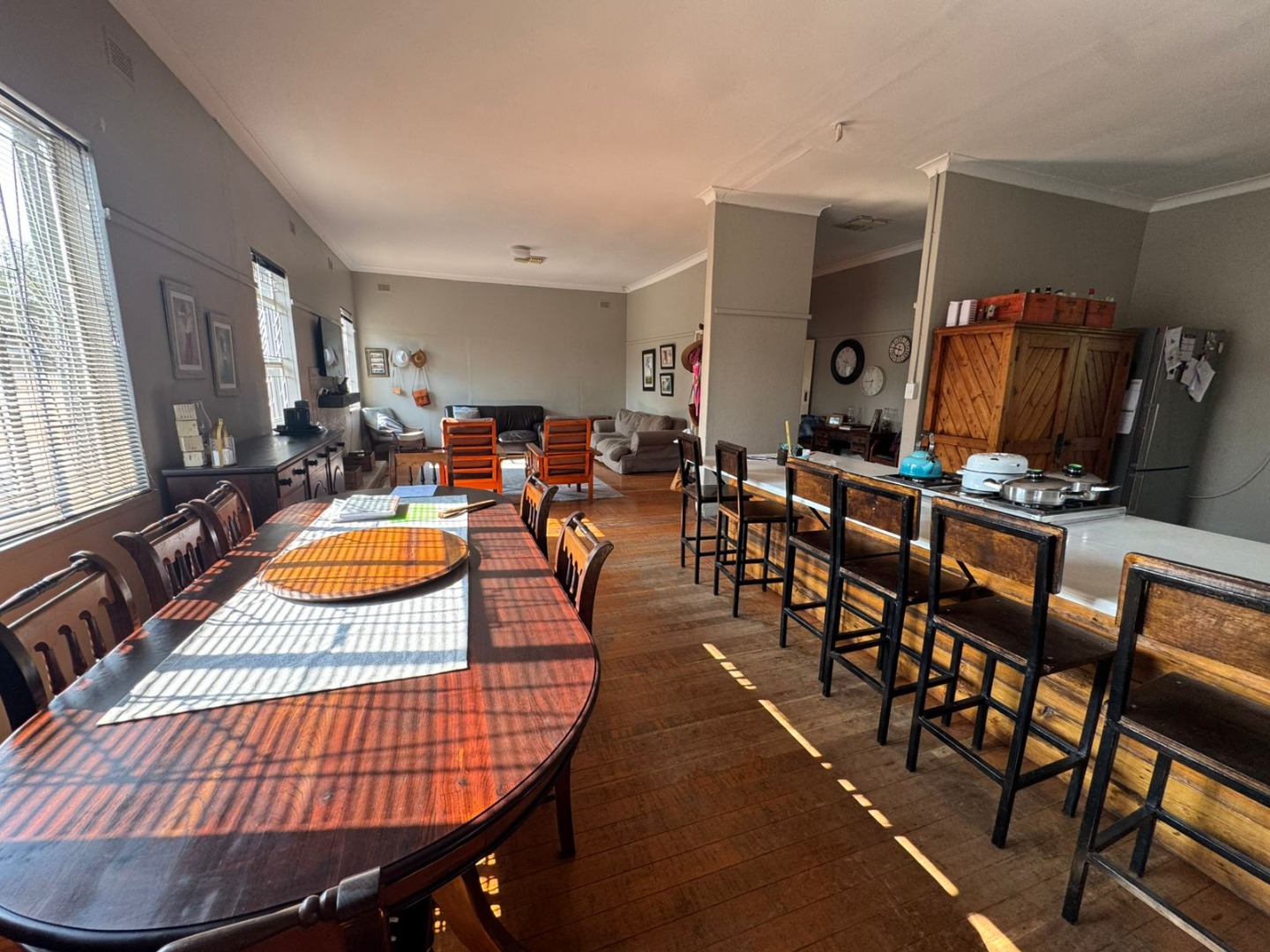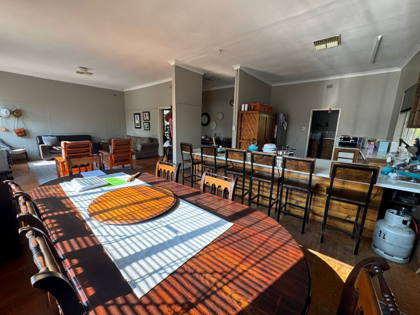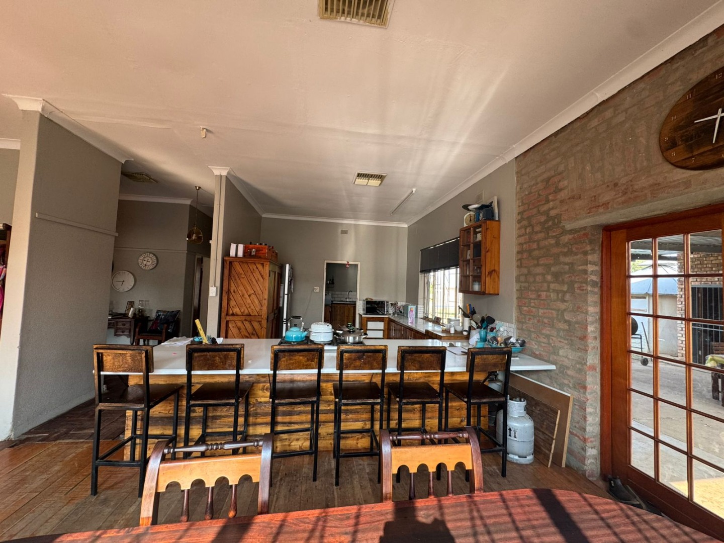 Inside, you’ll find a welcoming open-plan dining room, lounge, and kitchen with beautiful wooden floors. The lounge features a cozy fireplace, while the kitchen is fitted with a gas stove and a separate scullery. A water-cooling system ensures comfort during the hot summer months.