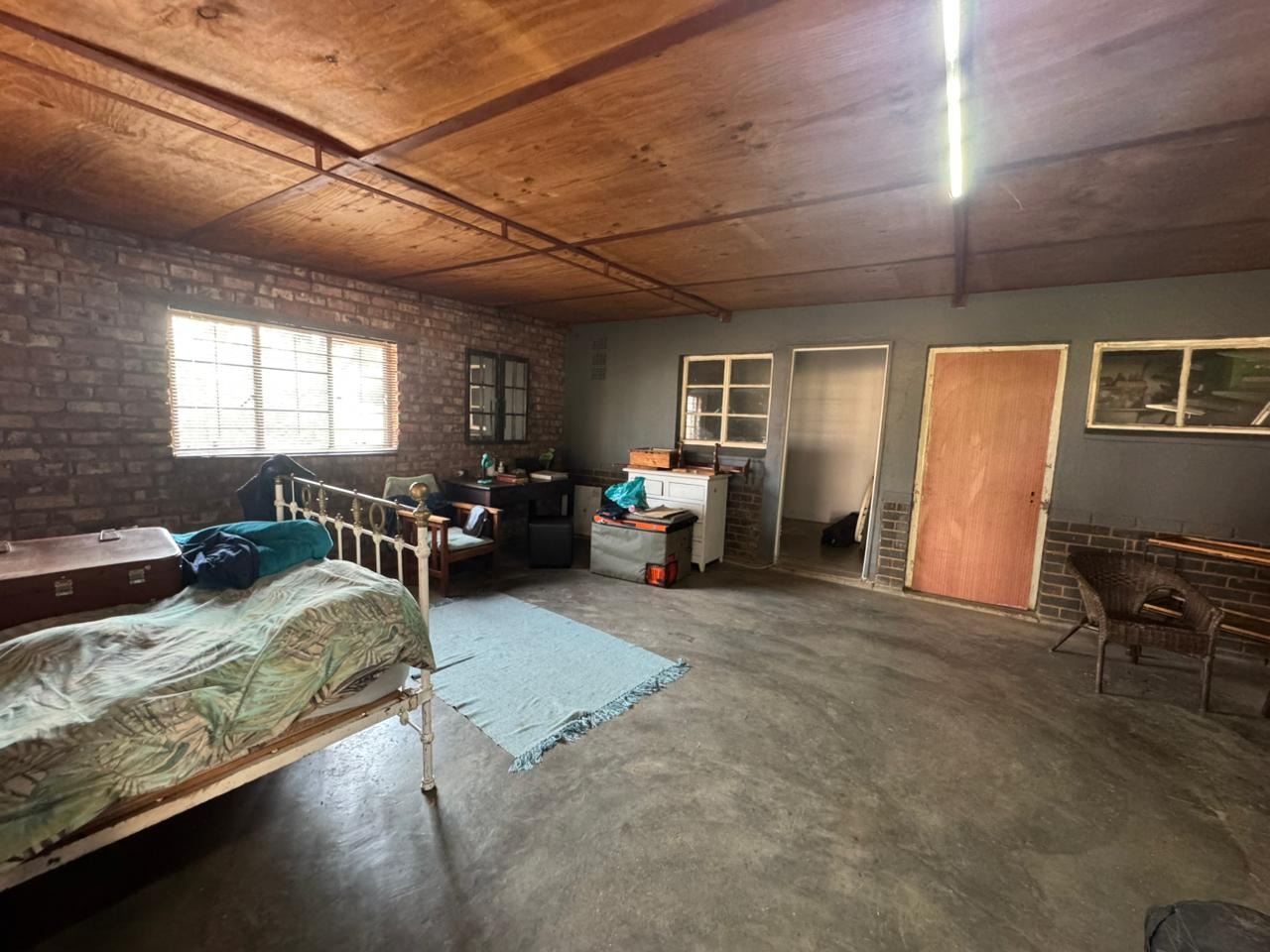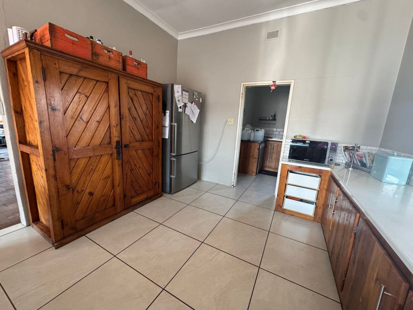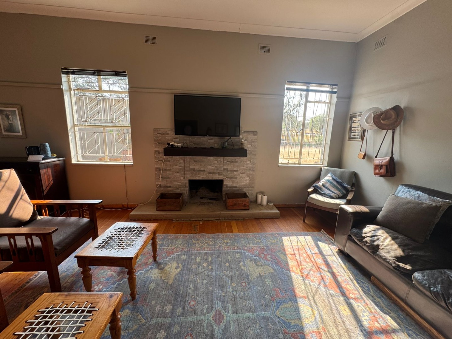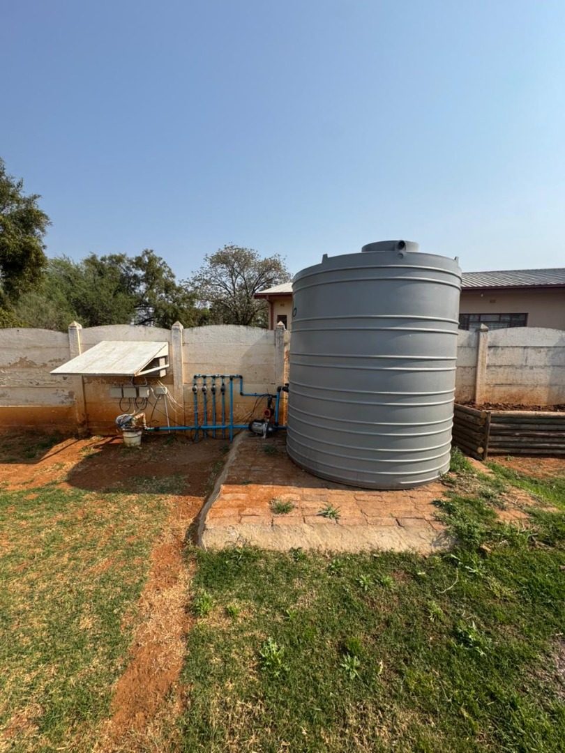 Inside, you’ll find a welcoming open-plan dining room, lounge, and kitchen with beautiful wooden floors. The lounge features a cozy fireplace, while the kitchen is fitted with a gas stove and a separate scullery. A water-cooling system ensures comfort during the hot summer months.