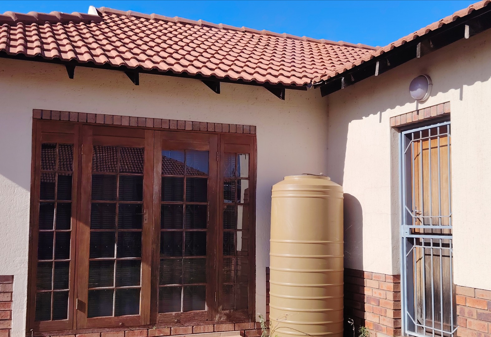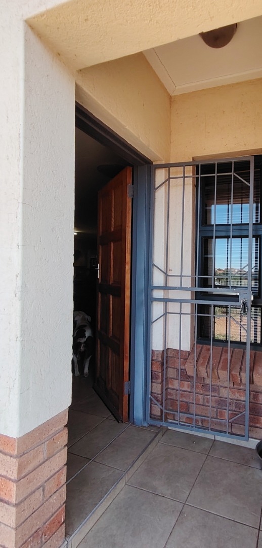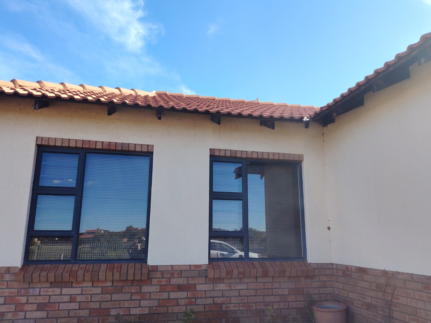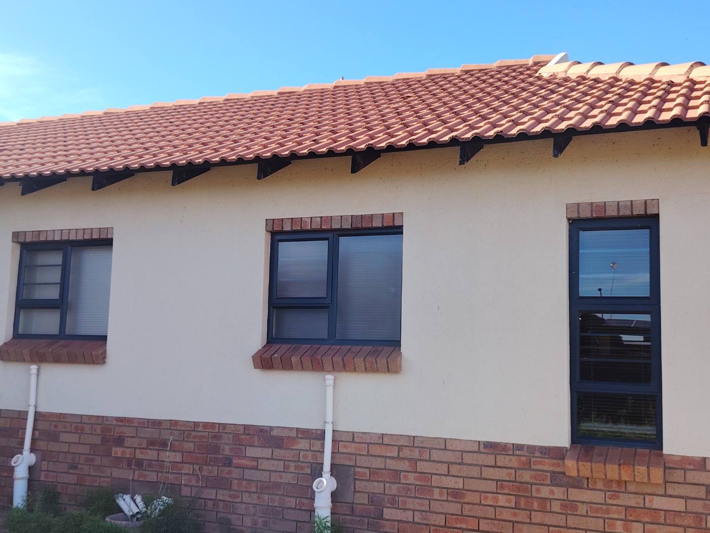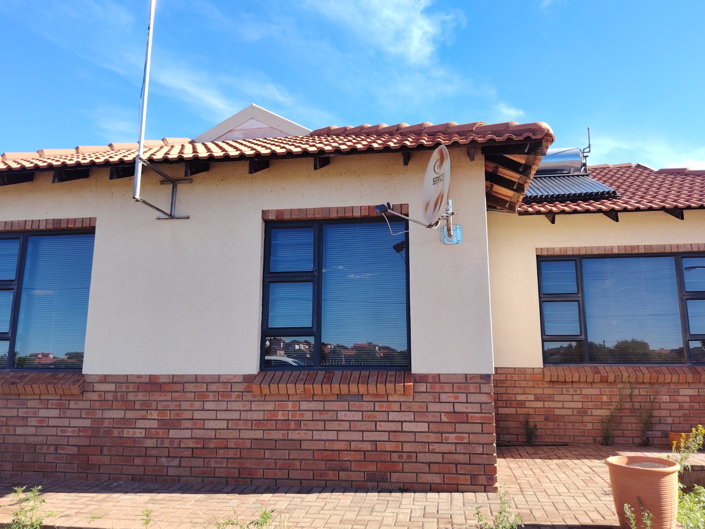 Accommodation includes three comfortable bedrooms, with the main bedroom featuring an en-suite bathroom, alongside a second well-appointed bathroom. For enhanced security, the property is fitted with a security gate on the front door and burglar bars on windows. Sustainability is addressed with an installed solar water heater, contributing to energy efficiency.