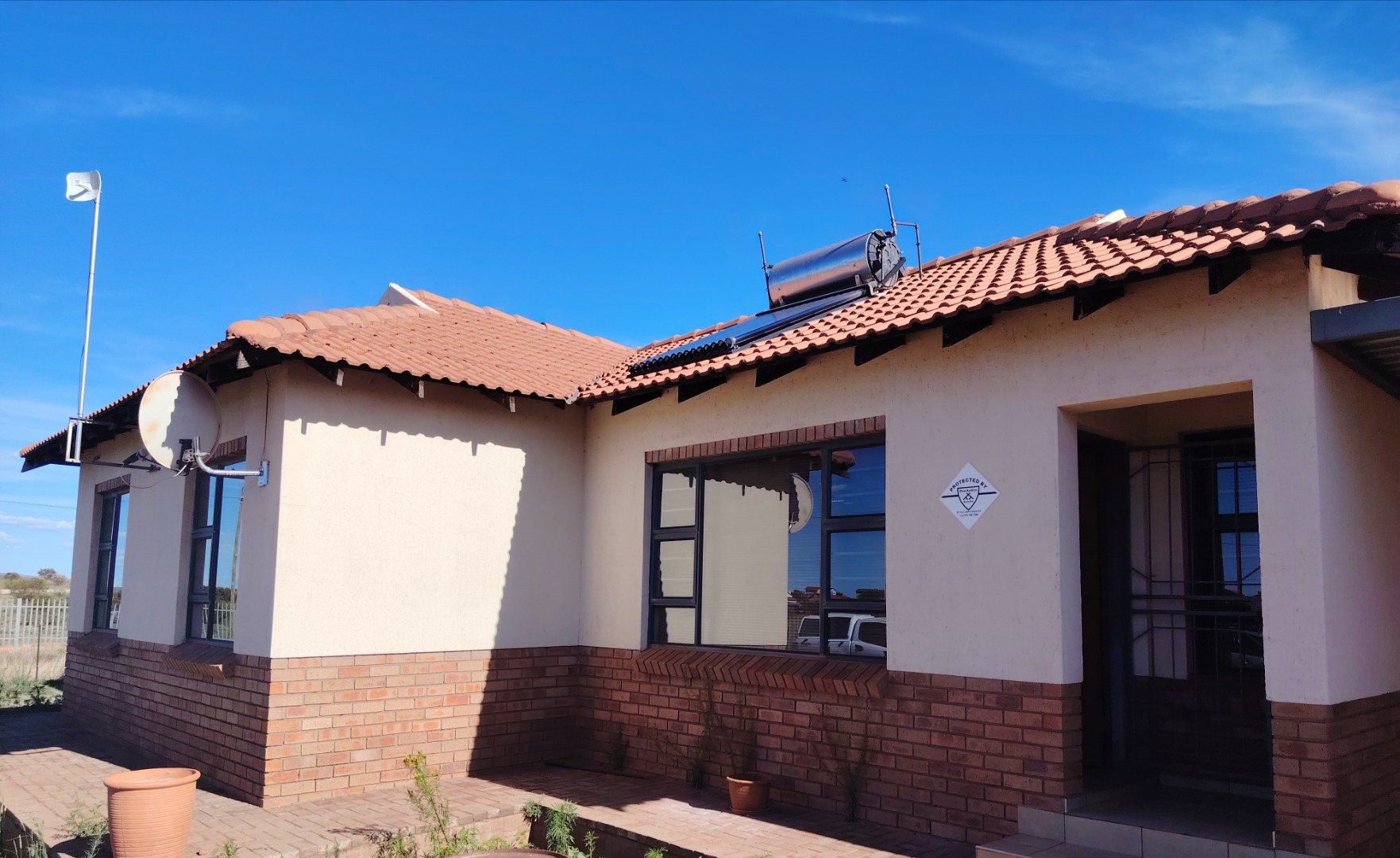 Discover this inviting 3-bedroom, 2-bathroom home situated in the Northern Cape town of Postmasburg. This single-story residence features a durable tiled roof and a combination of brick and painted exterior walls, presenting a neat kerb appeal. A paved driveway leads to a convenient covered carport, offering practical parking solutions.