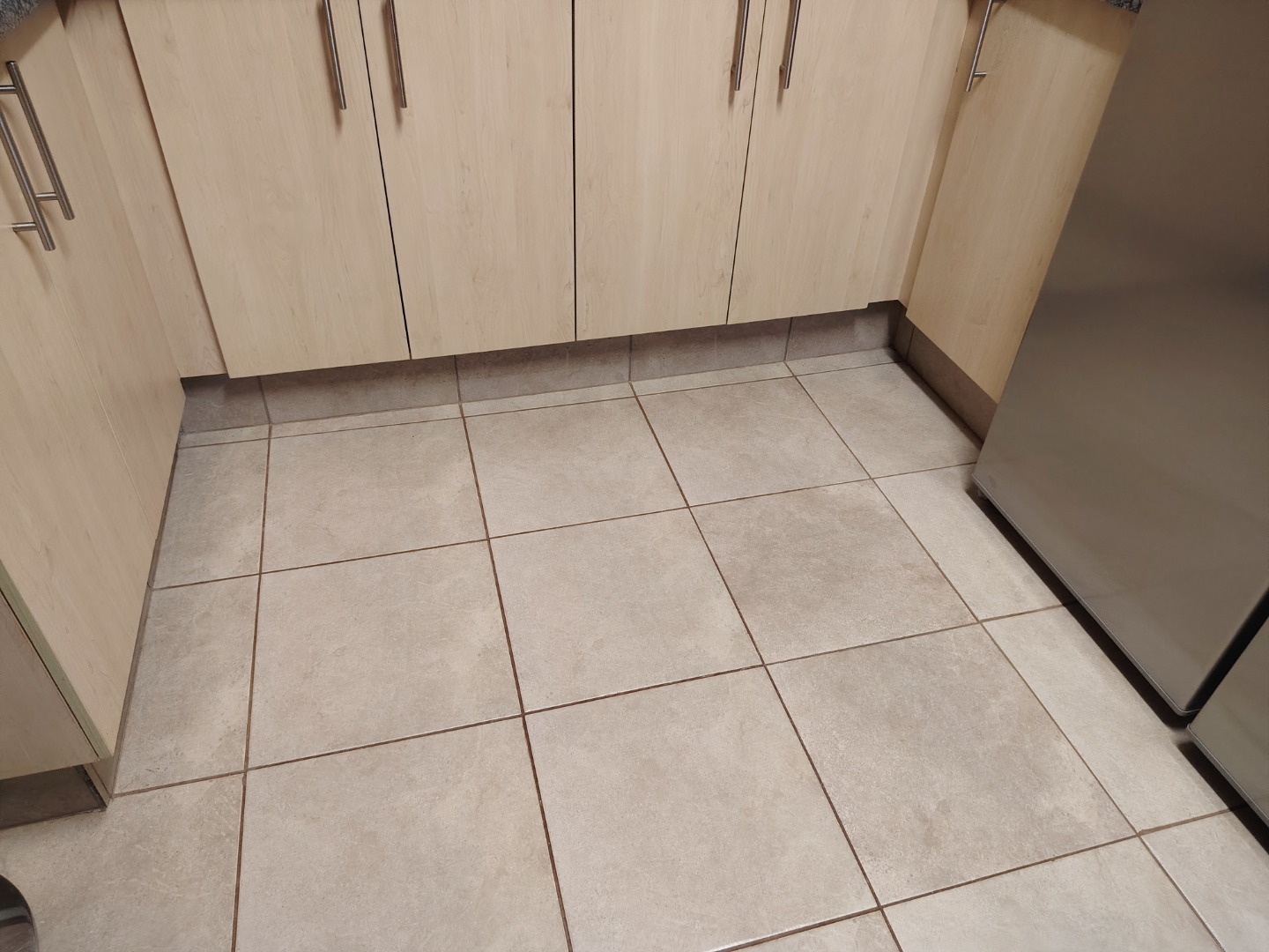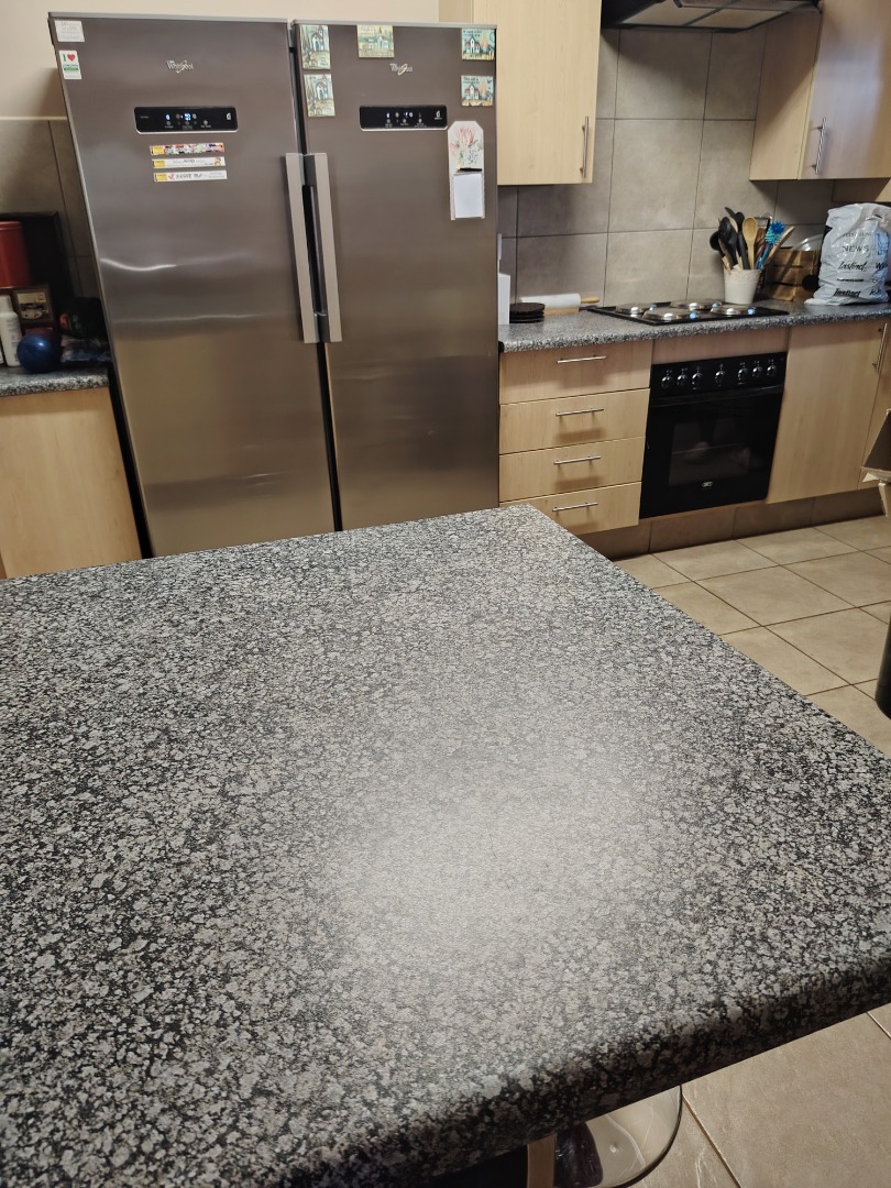 Inside, the home boasts an open-plan living and kitchen area, designed for contemporary comfort and flow. The kitchen is well-appointed with modern light wood-grain cabinetry, ample granite-look countertop space, and a functional island that doubles as a breakfast bar. It comes equipped with integrated oven and stovetop. Tiled flooring extends throughout the living spaces, ensuring durability and ease of maintenance, complemented by a dedicated pantry for additional storage.