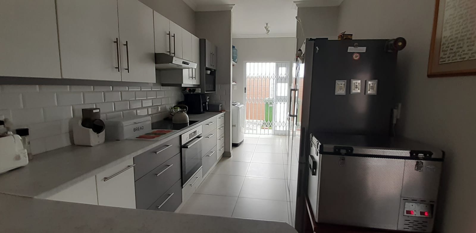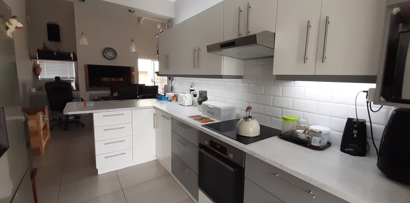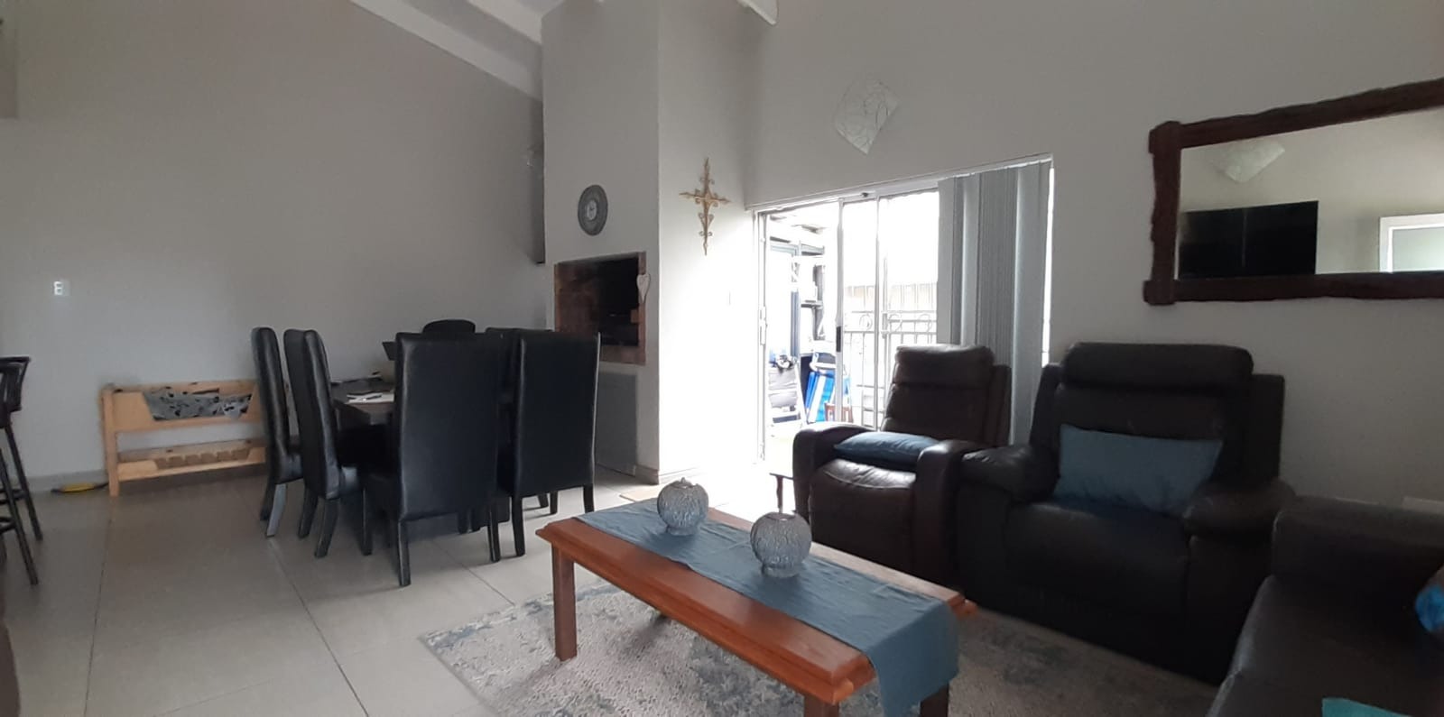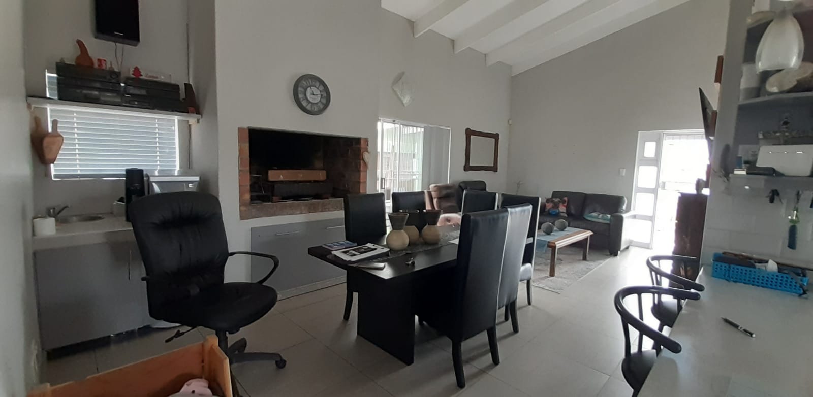 The open-plan living and dining area is enhanced by high vaulted ceilings, creating a bright and airy atmosphere. The modern kitchen flows seamlessly into the living space, making it ideal for entertaining, while the built-in braai adds to the home’s relaxed indoor-outdoor appeal.