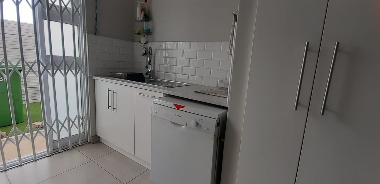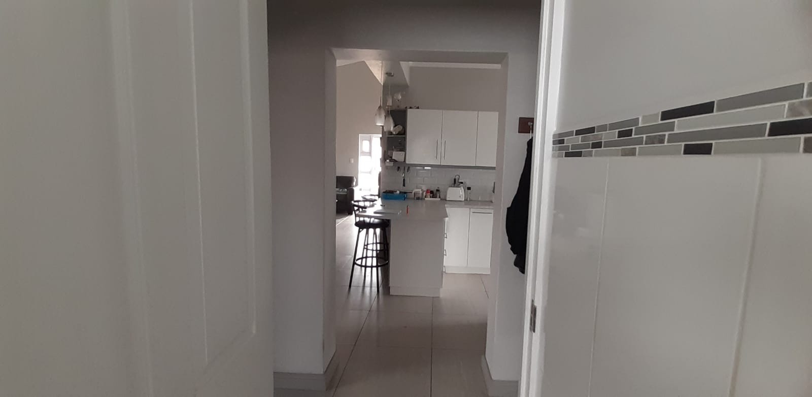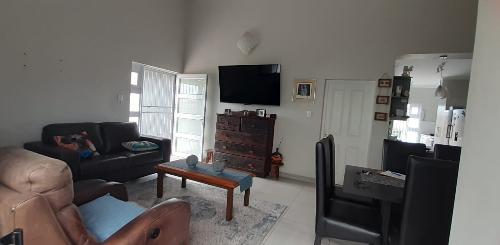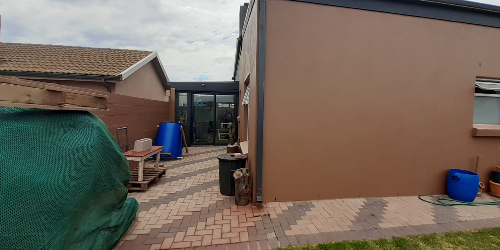 The open-plan living and dining area is enhanced by high vaulted ceilings, creating a bright and airy atmosphere. The modern kitchen flows seamlessly into the living space, making it ideal for entertaining, while the built-in braai adds to the home’s relaxed indoor-outdoor appeal.