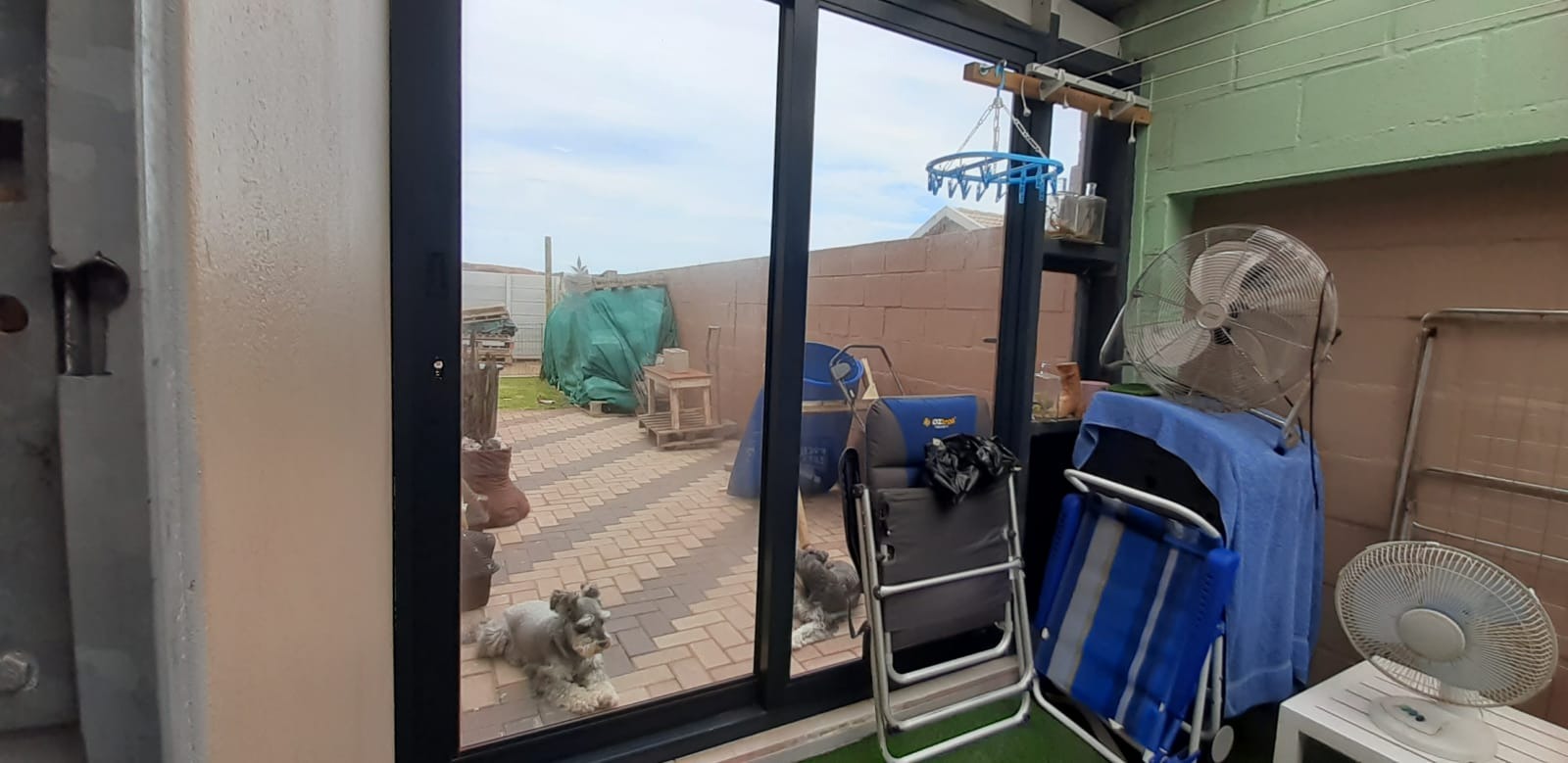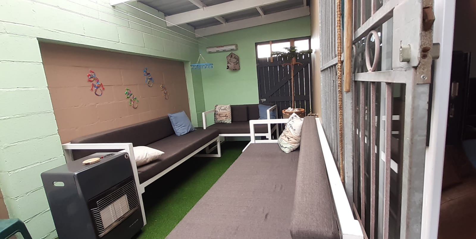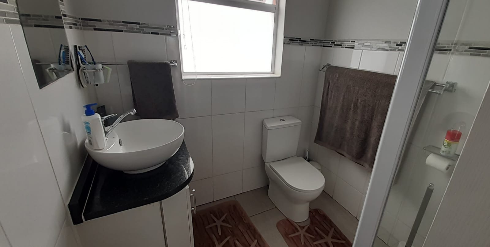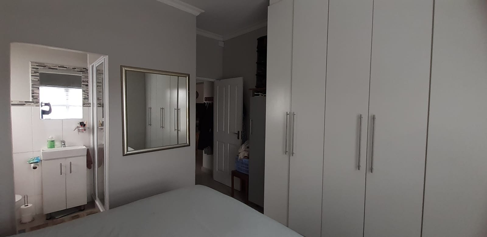 The open-plan living and dining area is enhanced by high vaulted ceilings, creating a bright and airy atmosphere. The modern kitchen flows seamlessly into the living space, making it ideal for entertaining, while the built-in braai adds to the home’s relaxed indoor-outdoor appeal.