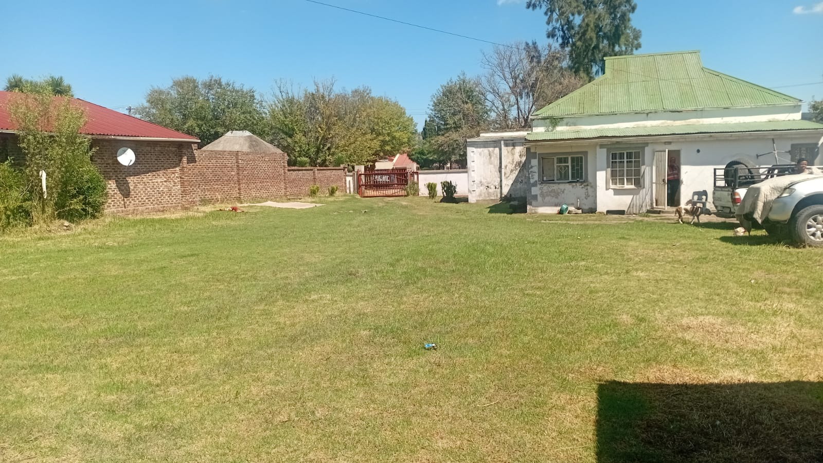 Externally, the property sits on a spacious plot featuring a large, well-maintained lawn and garden area, perfect for outdoor activities or relaxation. The house itself is constructed from durable brick, ensuring longevity. A brick perimeter wall enhances privacy and security, complemented by an access gate and an unpaved driveway providing two open parking spaces.