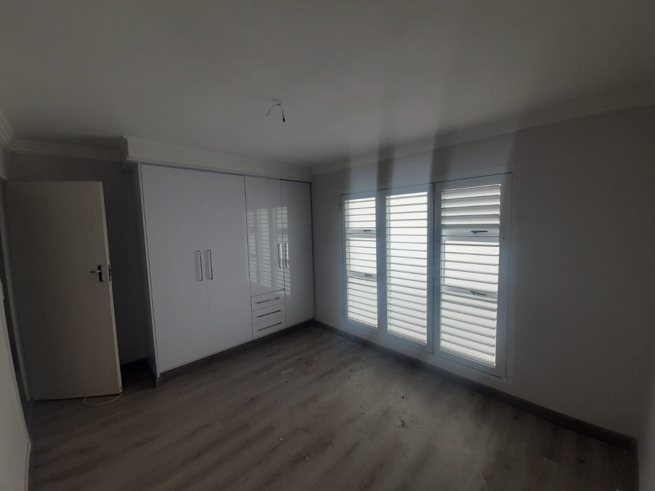Large windows with plantation shutters provide natural light and privacy.
