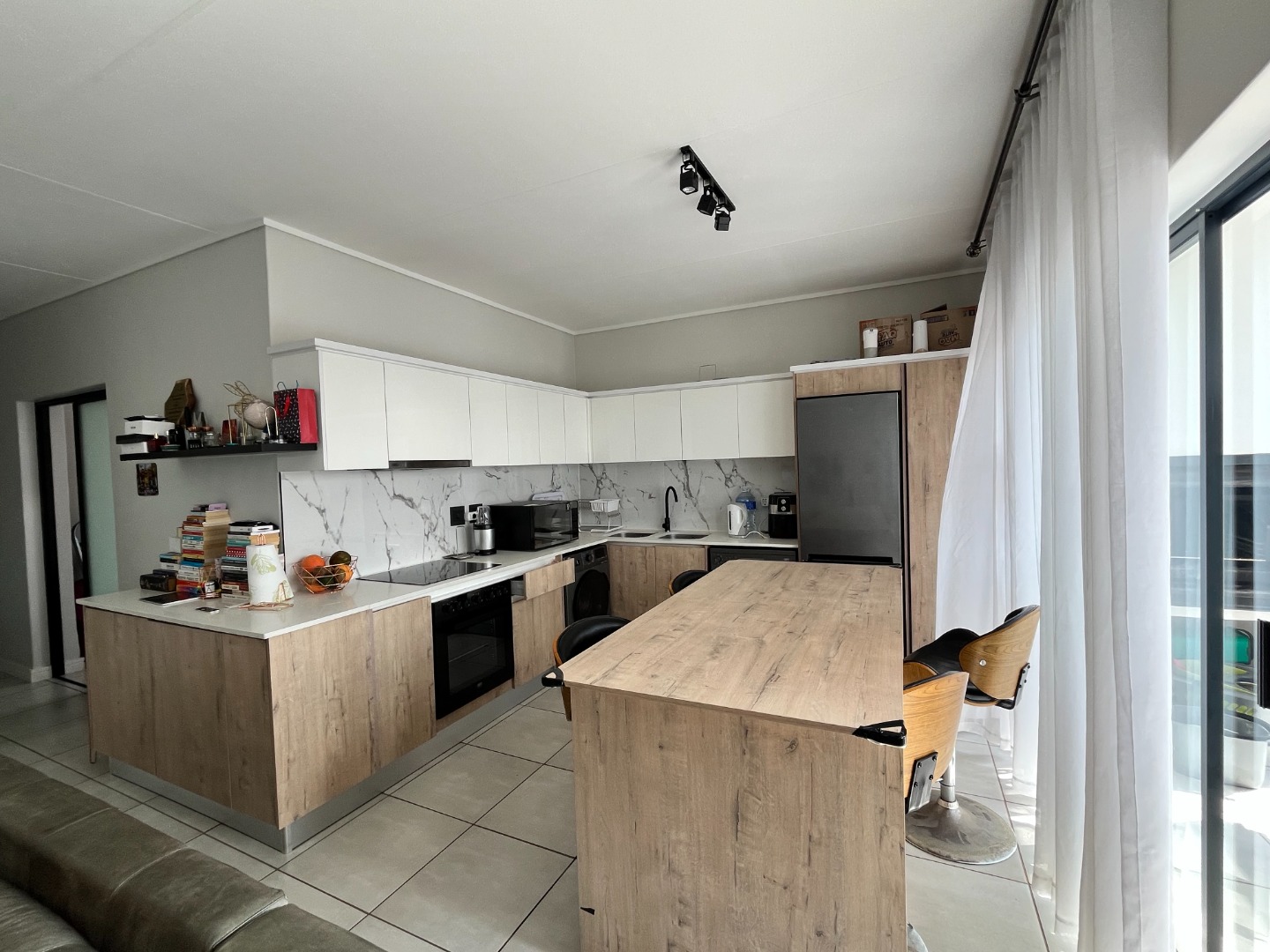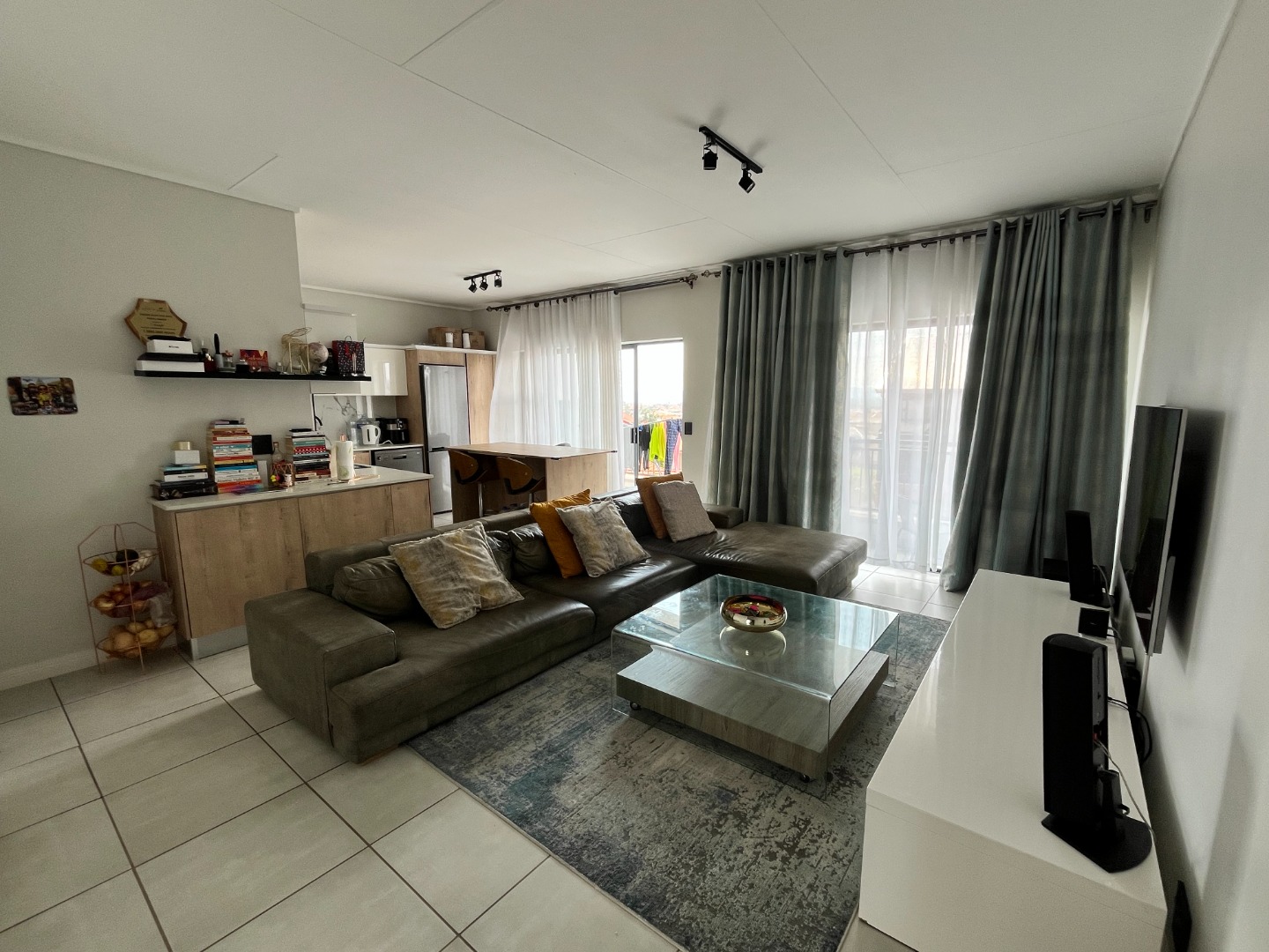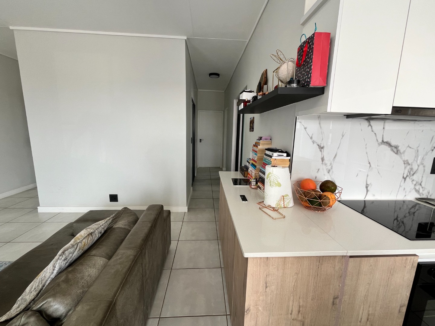 The modern open-plan kitchen is fitted with quality finishes and ample cupboard space, seamlessly flowing into a bright and airy lounge area that opens onto a private balcony—ideal for relaxing or entertaining while enjoying the elevated top floor views. The apartment is designed to maximize natural light, creating a warm and inviting atmosphere throughout.
