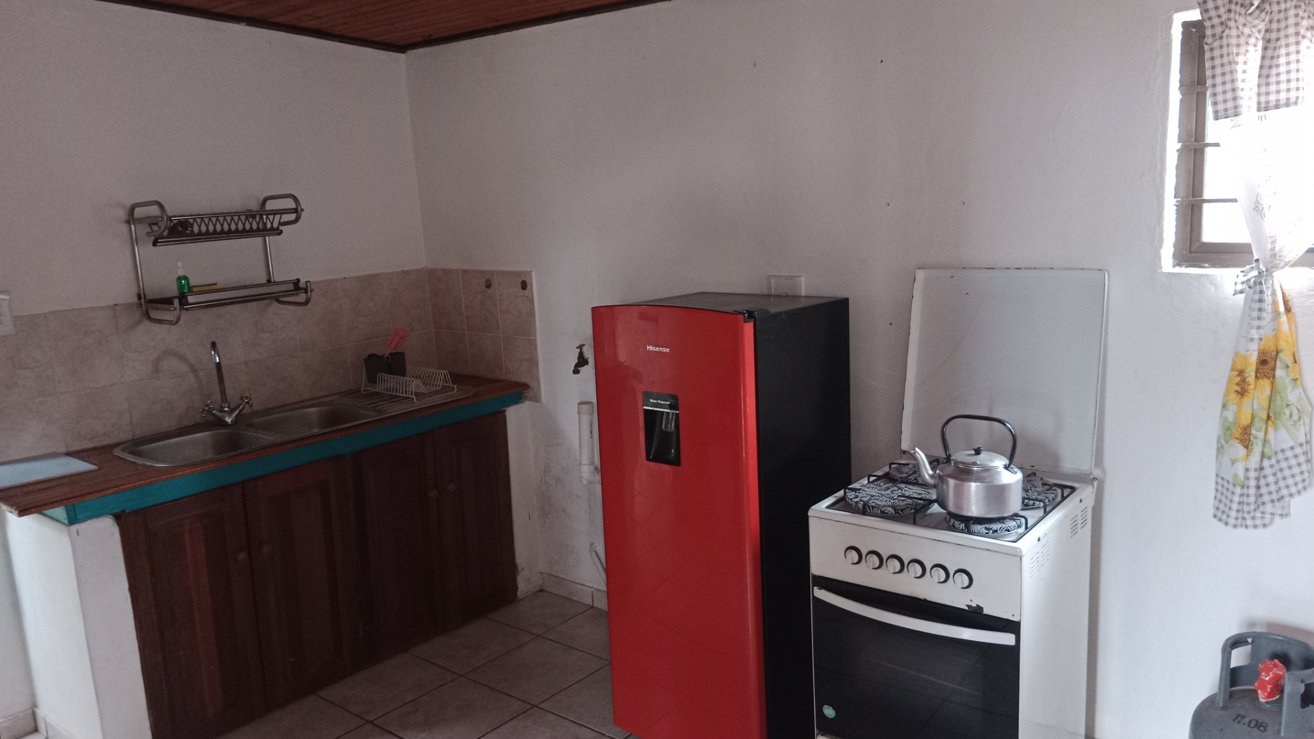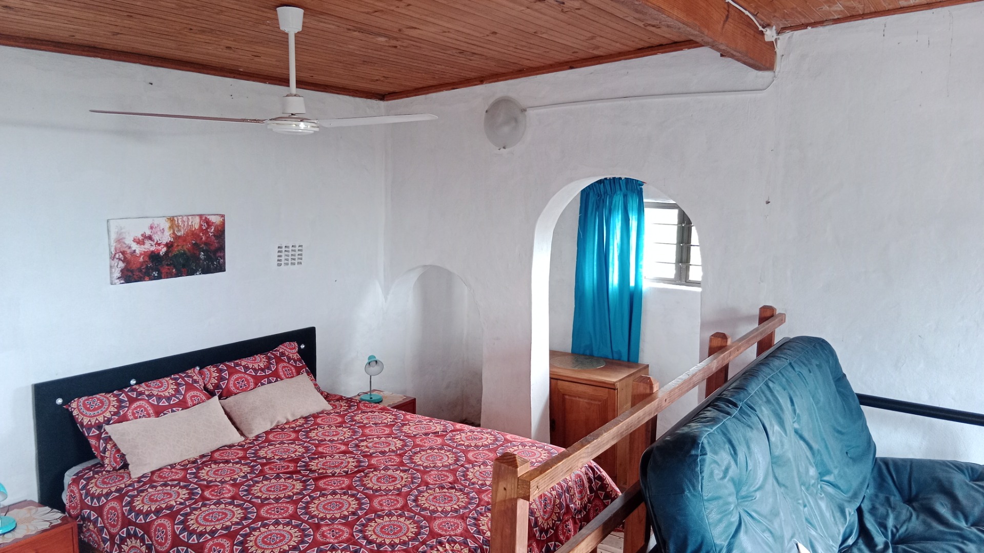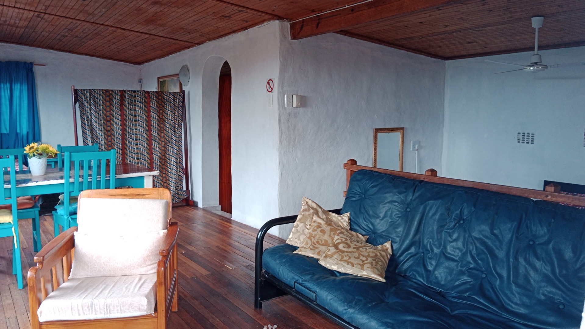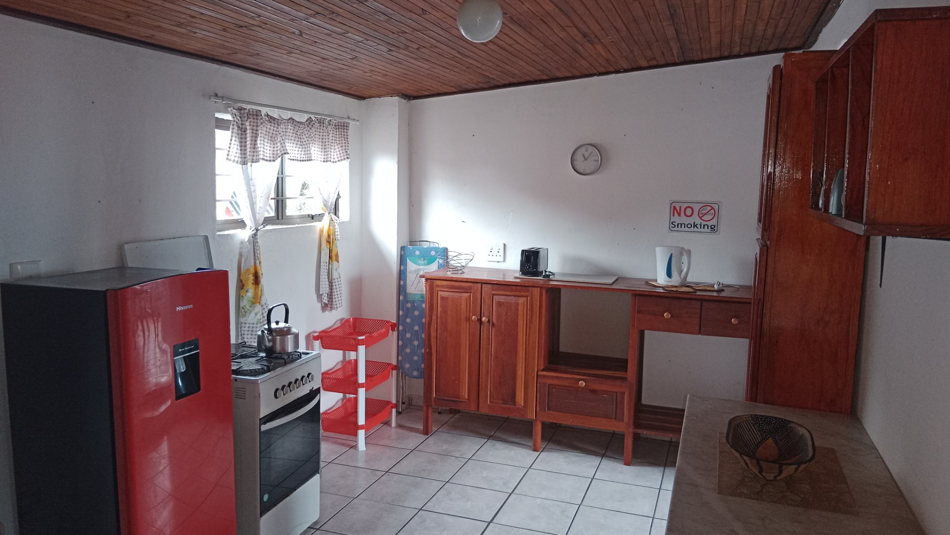 Discover this charming open plan, 1-bathroom rental property located in the coastal suburb of Elysium. This inviting residence features a functional layout, including a comfortable lounge area and a well-equipped kitchen. The interior boasts a distinctive rustic-eclectic style, characterized by warm wooden ceilings and floors, complemented by textured white walls. Large windows throughout the property invite abundant natural light and offer pleasant green views, creating a bright and airy atmosphere. The kitchen is fitted with essential appliances, including a modern red refrigerator and a gas stove with an oven, providing all necessary amenities for daily living.