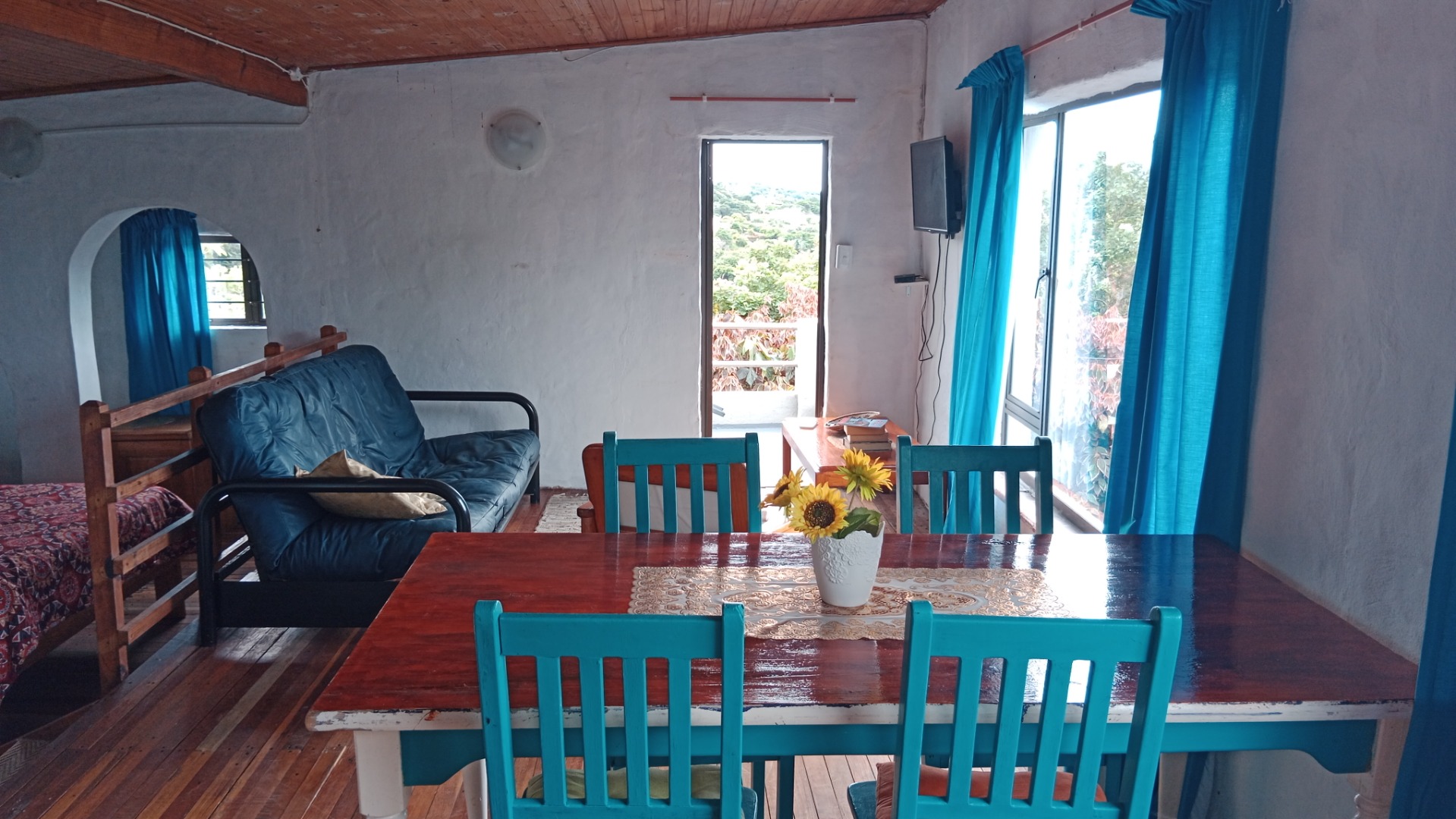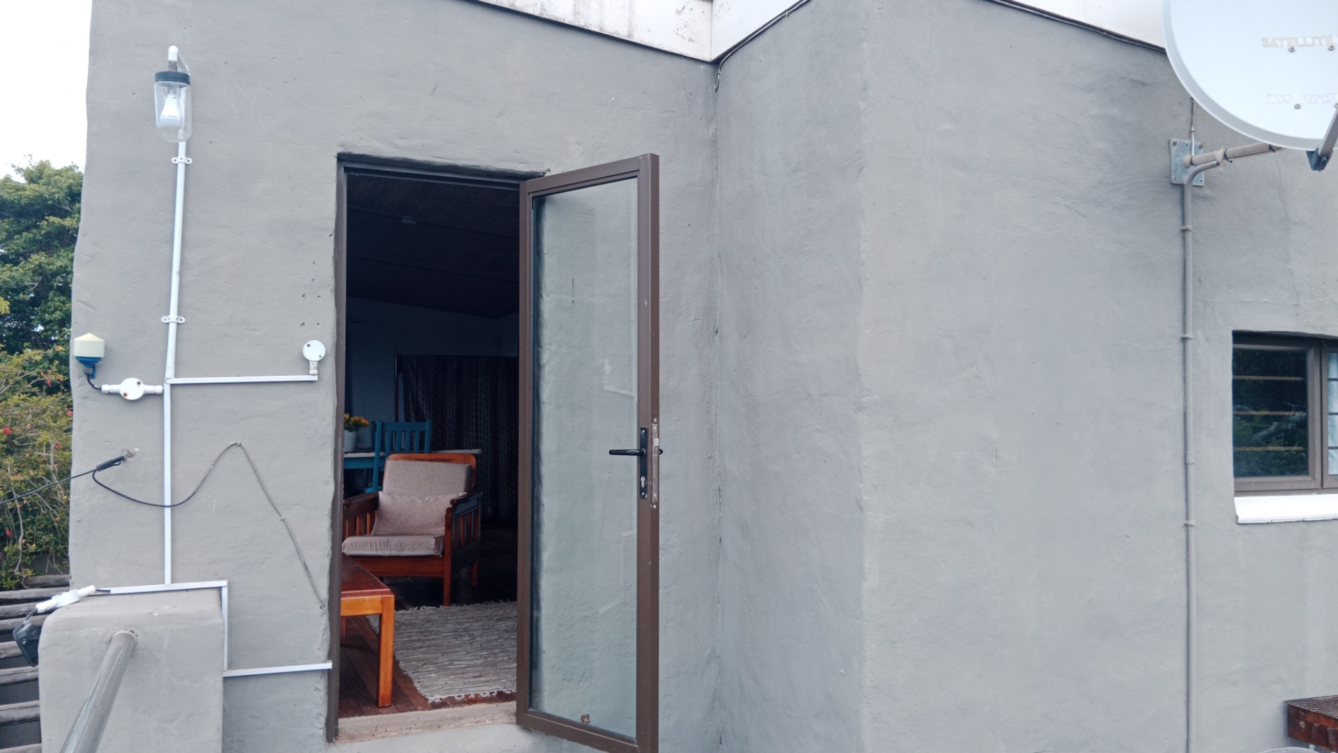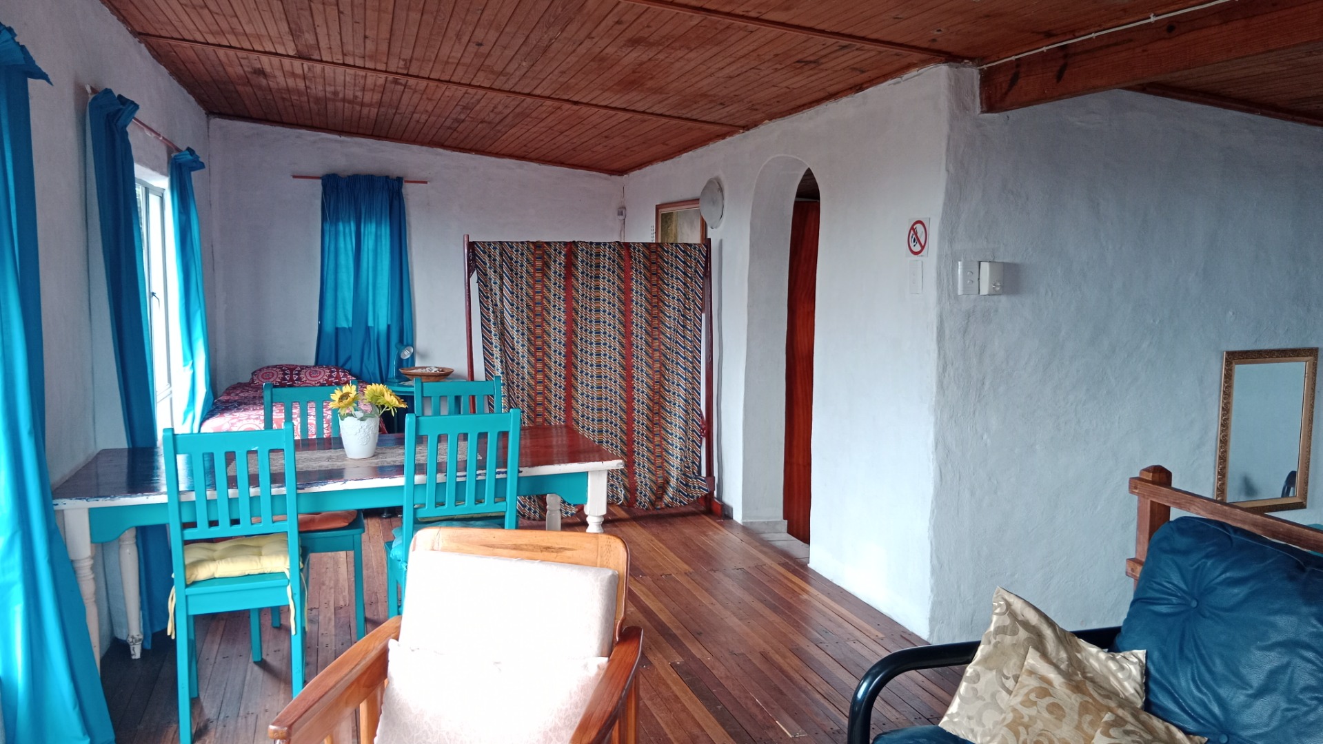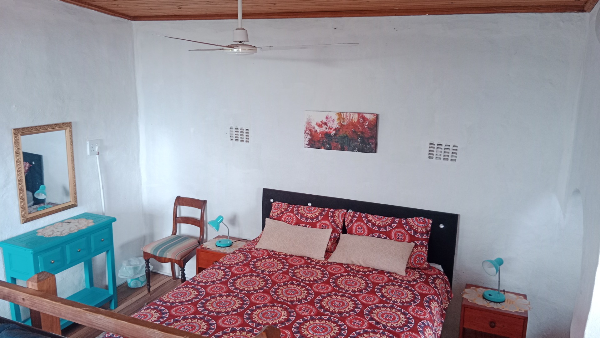 Discover this charming open plan, 1-bathroom rental property located in the coastal suburb of Elysium. This inviting residence features a functional layout, including a comfortable lounge area and a well-equipped kitchen. The interior boasts a distinctive rustic-eclectic style, characterized by warm wooden ceilings and floors, complemented by textured white walls. Large windows throughout the property invite abundant natural light and offer pleasant green views, creating a bright and airy atmosphere. The kitchen is fitted with essential appliances, including a modern red refrigerator and a gas stove with an oven, providing all necessary amenities for daily living.