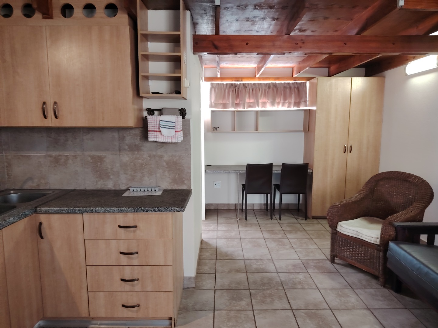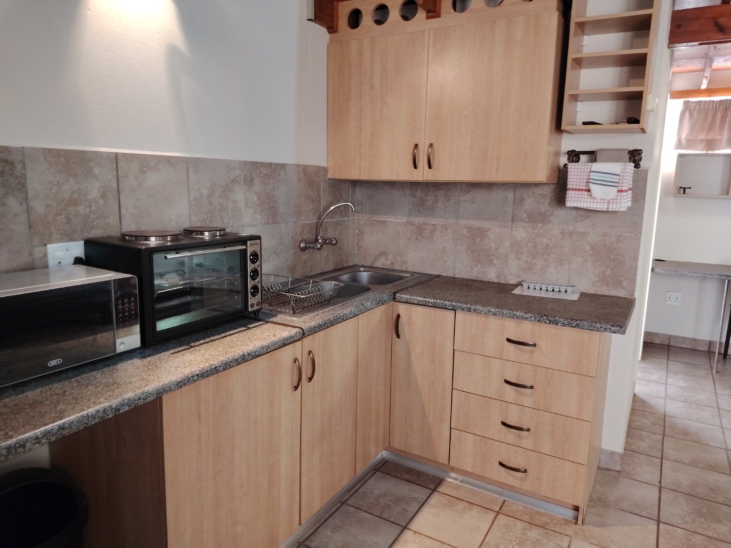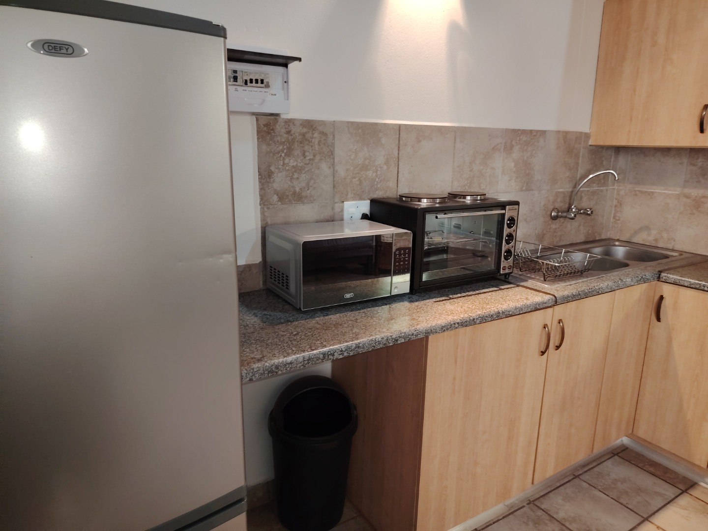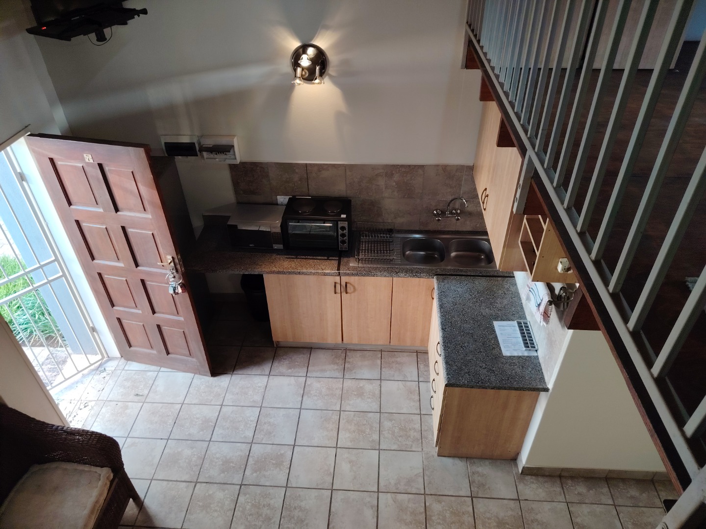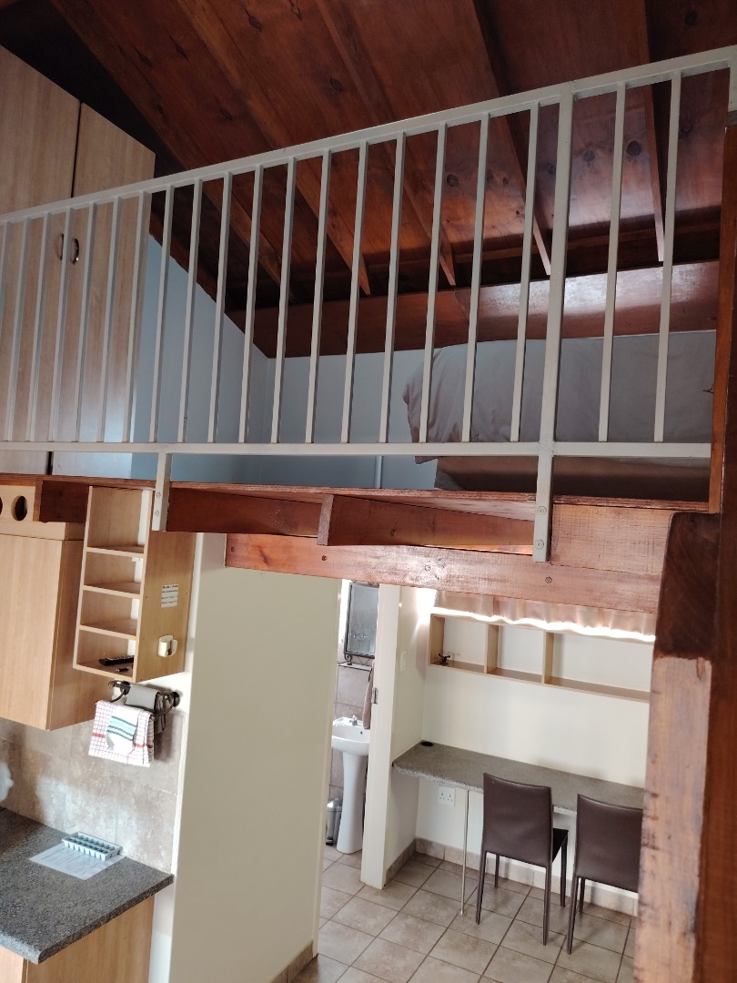 This compact 1-bedroom, 1-bathroom rental unit in Postmasburg offers a functional and efficient living space. The interior features a practical, loft-style layout with easy-to-maintain tiled flooring throughout. A well-appointed kitchenette includes light wooden cabinetry, granite-look countertops, a tiled backsplash, and essential appliances such as a refrigerator, microwave, and a countertop oven with hotplates. The unit also boasts a dedicated workspace and a built-in wardrobe for convenience, maximizing the use of space.
