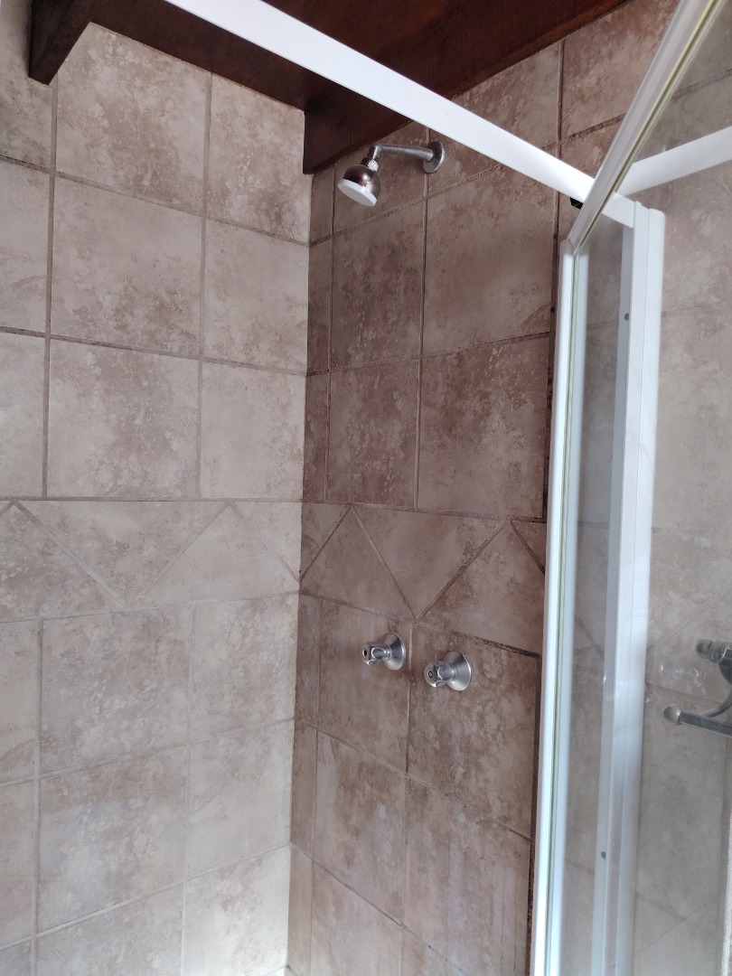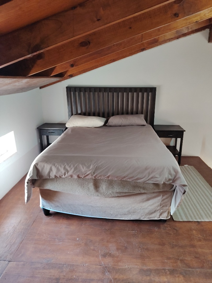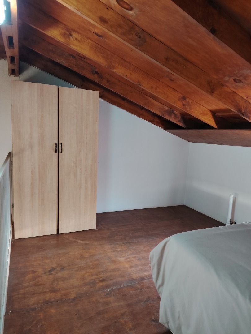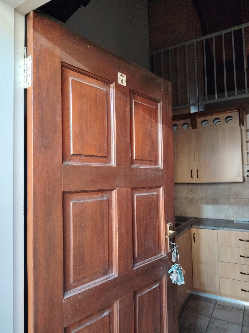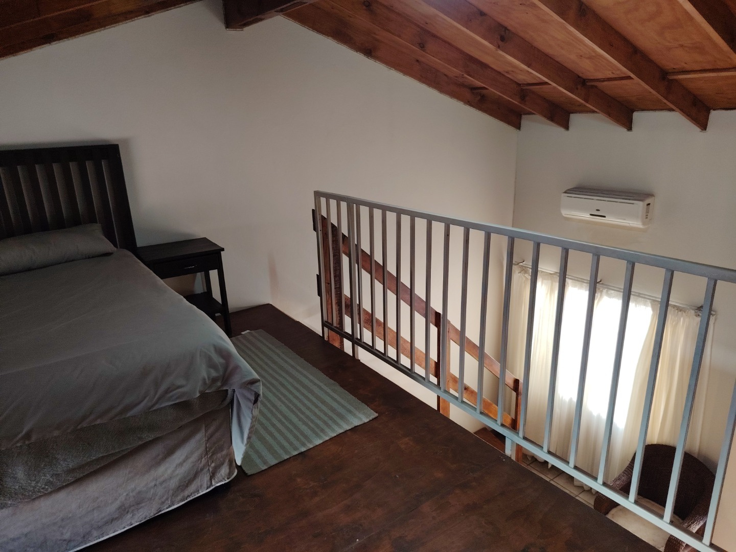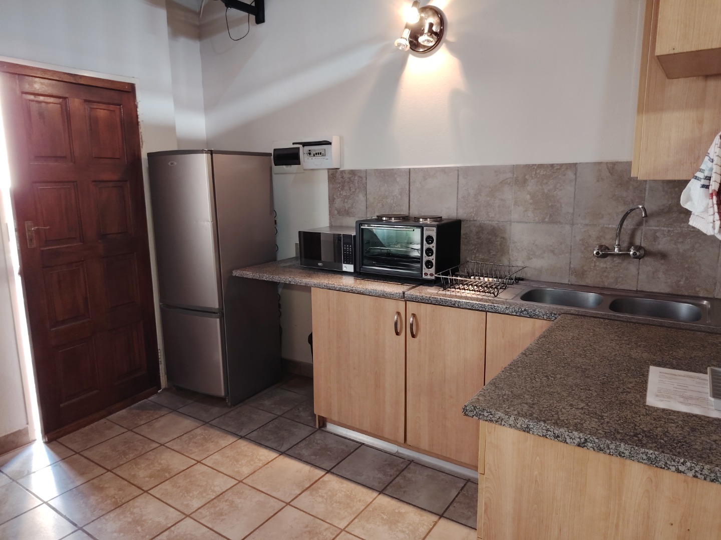This compact 1-bedroom, 1-bathroom rental unit in Postmasburg offers a functional and efficient living space. The interior features a practical, loft-style layout with easy-to-maintain tiled flooring throughout. A well-appointed kitchenette includes light wooden cabinetry, granite-look countertops, a tiled backsplash, and essential appliances such as a refrigerator, microwave, and a countertop oven with hotplates. The unit also boasts a dedicated workspace and a built-in wardrobe for convenience, maximizing the use of space.