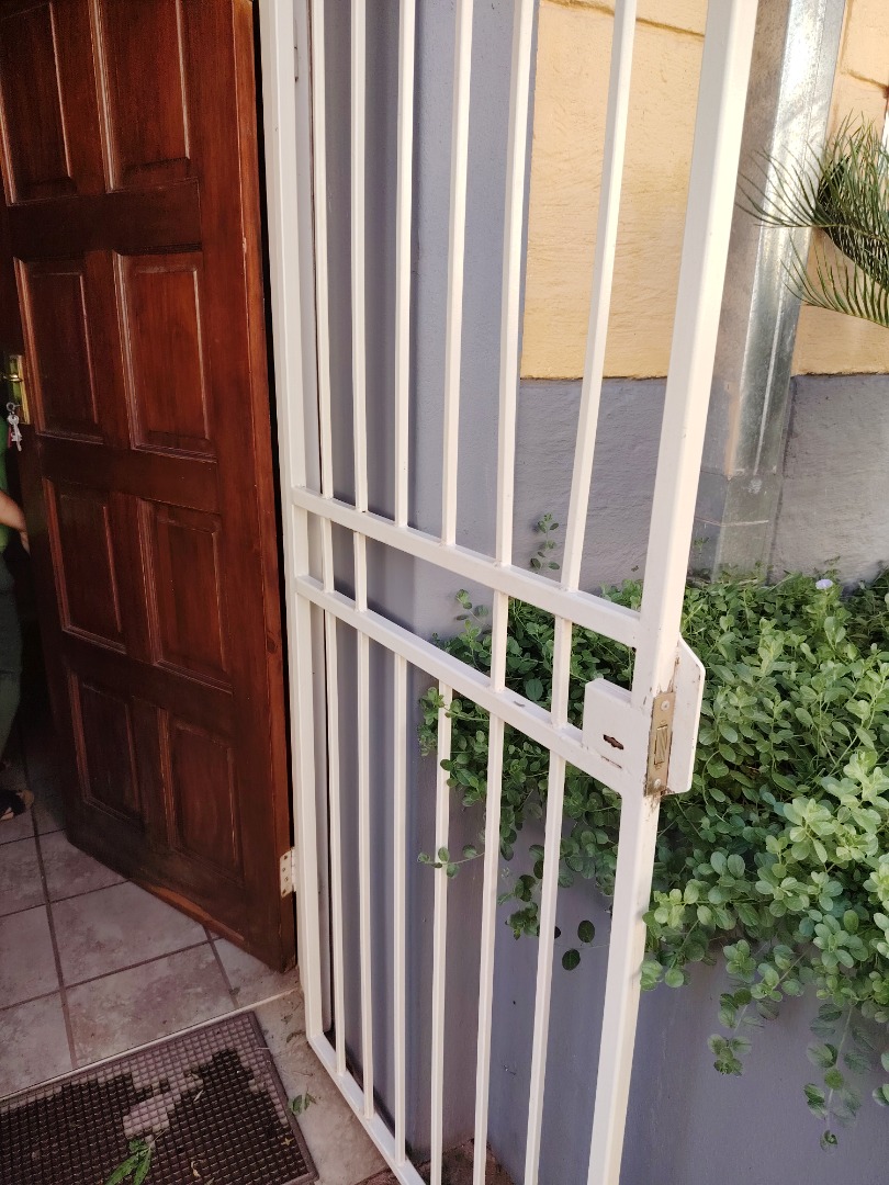 The property prioritizes security with visible features including a security gate at the unit's entrance, security grilles on windows, and electric fencing around the perimeter. Residents benefit from a dedicated covered parking bay with a roll-up door, ensuring vehicle safety. Additionally, the complex offers well-maintained paved walkways, complemented by landscaped garden beds and scenic views of a green field.