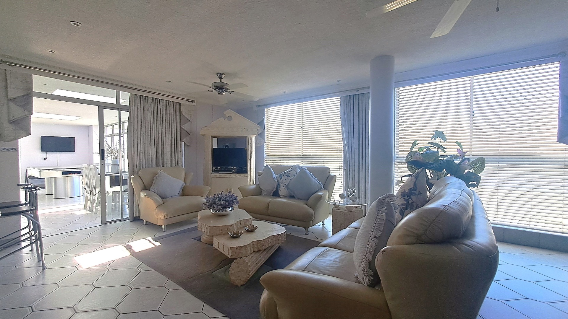 Step inside to an inviting open-plan layout, seamlessly connecting the lounge, dining room, and a well-appointed kitchen. The home features a dedicated family TV room for relaxation and entertainment, complemented by a built-in bar and a braai room, perfect for social gatherings. Sliding doors enhance the flow and allow natural light to fill the living spaces.